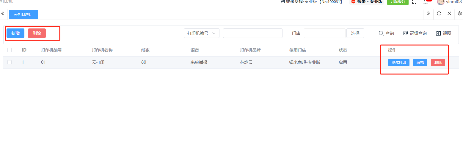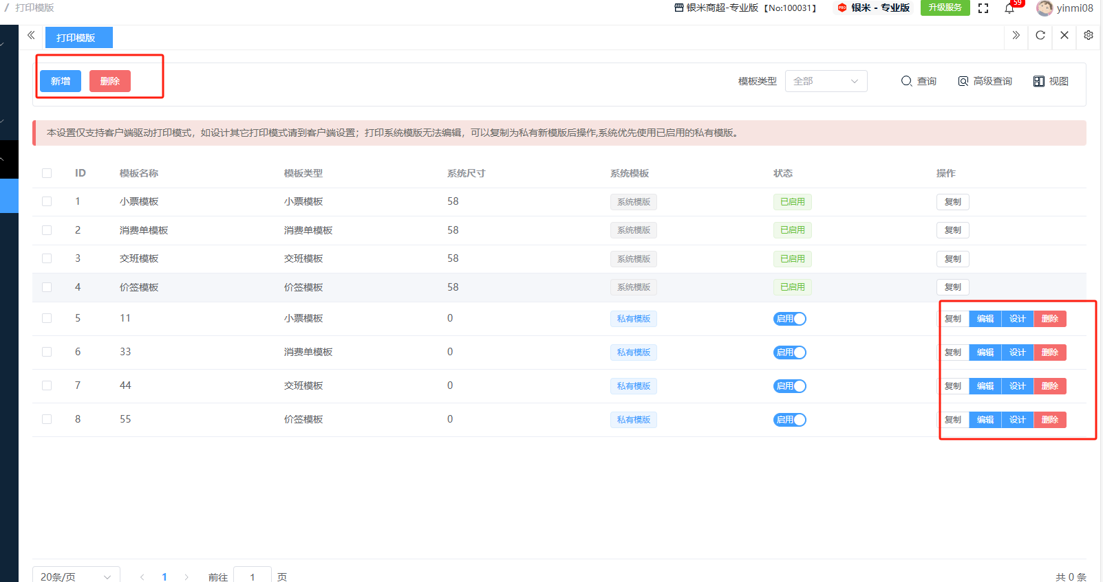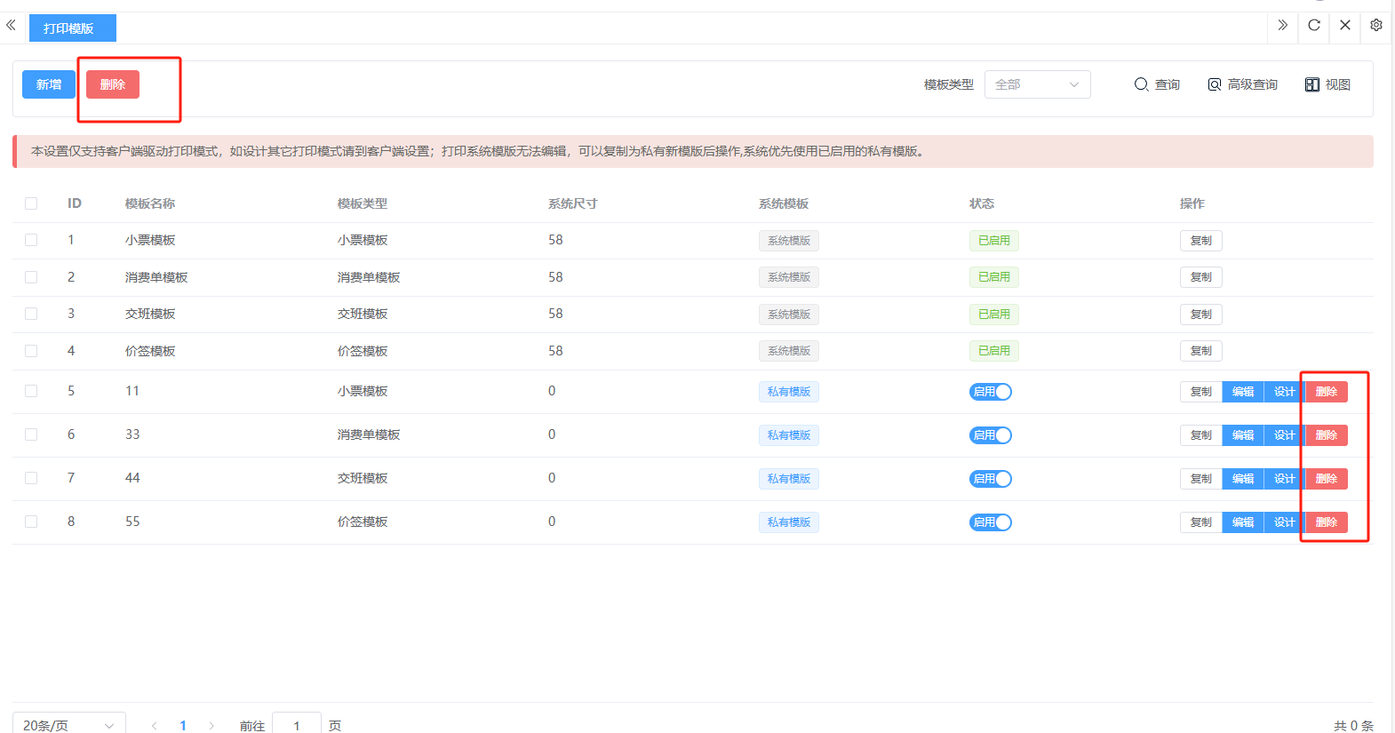 ## 打印设置 打印设置是系统对各类业务单据打印规则进行集中配置的功能模块,用于统一输出格式并适配多硬件环境。包含:打印模板、云打印机。 如图所示  一、打印模板是系统预设的业务单据格式设计方案,通过可视化编辑实现各类凭证的标准化输出与个性化定制。包含:模板名称、模板类型、系统尺寸等。功能包含:新增、复制、编辑、设计、删除。 如图所示  1、点击“新增”、录入模板名称、选择纸张尺寸、选择模板类型、选择禁用或启用,点击“确认”即可完成新增。 如图所示  2、点击“复制”,即可生成一个相同的打印模板。如图所示  3、点击“编辑”可修改打印模板的所有内容,修改完成后点击“确认”即可完成。如图所示  4、点击“设计”即可进入进行打印模板设计页面。如图所示  5、点击”删除“,右侧为”行删除“,左上角为”列删除“。如图所示  二、云打印机是通过云端技术实现远程指令接收与打印任务管理的智能硬件设备,突破传统局域网打印的地理限制。包含:打印机编号、打印机名称、纸张、语音等。功能包含:新增、测试打印、编辑、删除。 如图所示  1、点击“新增”、录入打印机名称、打印机序号、选择打印机品牌、选择纸张,选择语音(来单播报或静音)、选择门店、选择打印类型(小票或厨打,可多选)、选择状态(正常或禁用)点击“提交”即可完成新增。 如图所示  2、点击”测试打印“即可测试打印机设置是否完成。如图所示  3、点击“编辑”可修改云打印机的所有内容,修改完成后点击“提交”即可完成。如图所示  4、点击”删除“,右侧为”行删除“,左上角为”列删除“。如图所示