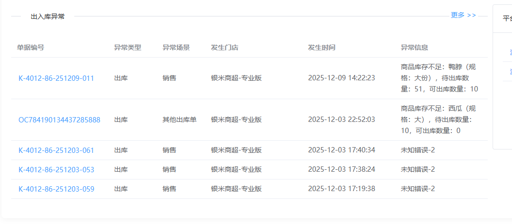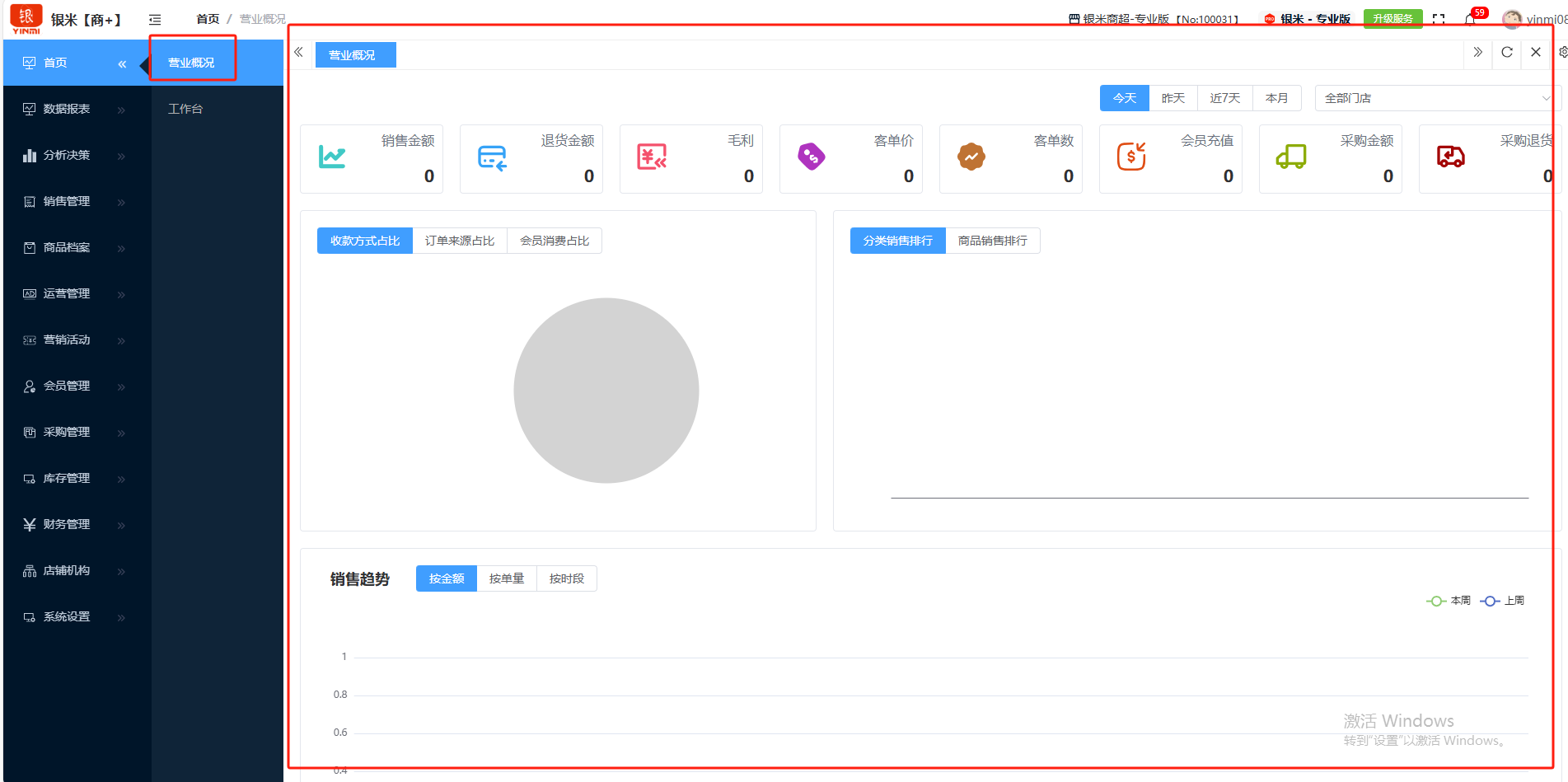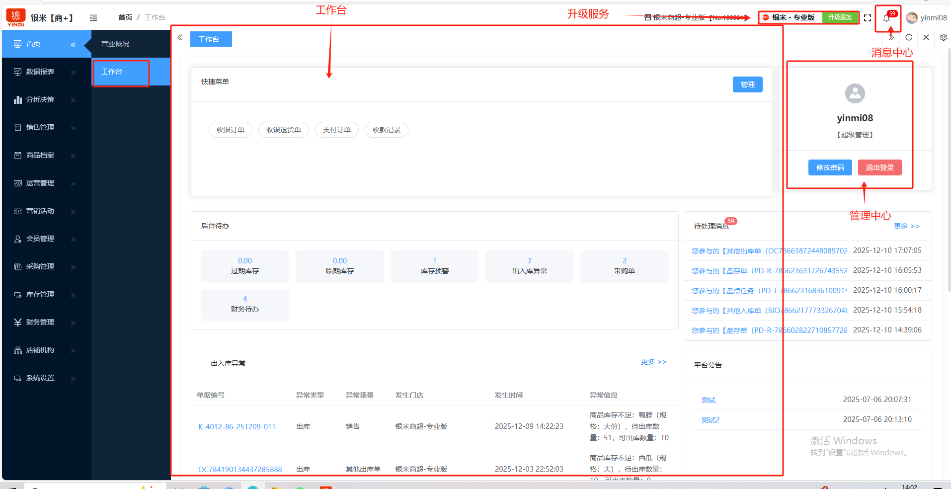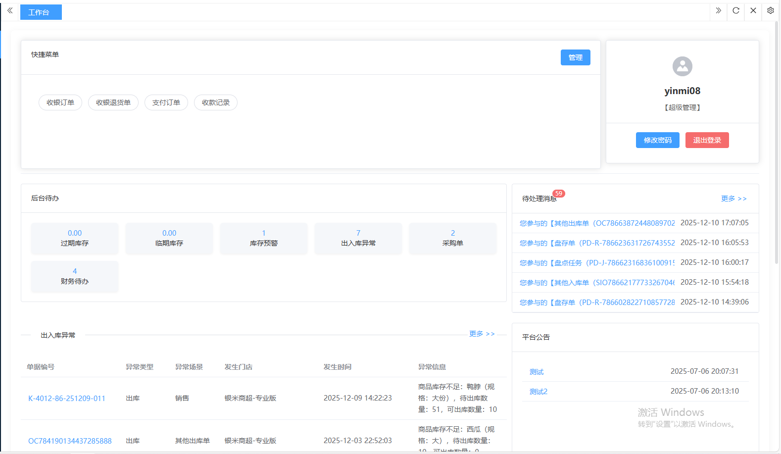 ## **后台首页** ”后台首页“是商户后台的综合页面。包含:营业概况、工作台、升级服务、消息中心、管理中心。 如图所示  一、营业概况是一份高度浓缩的经营快照,它通过汇总关键业绩指标,让管理者在最短时间内对生意的健康度、效率和趋势有一个全面且直观的认知。可查看:销售金额、退货金额、毛利、客单价、客单数、会员充值、采购金额、采购退货。按时间:今天、昨天、进7天、本月。 如图所示  二、工作台是商户后台的信息综合平台。包含:快捷菜单、后台待办、出入库异常、待处理消息、平台公告。 如图所示  1、快捷菜单是商户自主设置最重要的信息查询平台。点击”管理“勾选所需要查询的栏目即可设置。 如图所示  2、后台待办是商户需要快速处理的待办事项。如图所示  3、出入库异常是销售的异常事件,点击”单据编号“即可查看具体详情。如图所示  4、待处理消息是门店需要处理的事项,点击”活动情况“即可查看具体详情。如图所示  5、平台公告是公司平台发布的各类公告,点击即可查看详情。如图所示  三、升级服务是平台通过技术迭代与服务优化,帮助商家提升运营效率、优化顾客体验、并创造新的增长点。 如图所示  四、消息中心是一个非常重要的信息枢纽。一个集中接收、处理和提醒各类系统消息与业务动态的功能模块,旨在让经营者和员工能够及时响应,确保店铺顺畅运营。如处理完毕,点击”标记已读“即可关闭该消息。 如图所示  五、管理中心是商户修改密码、退出登录的按钮。点击”修改密码“输入旧密码、新密码、确认新密码,提交即可。如要退出后台,点击”退出登录“即可。 如图所示