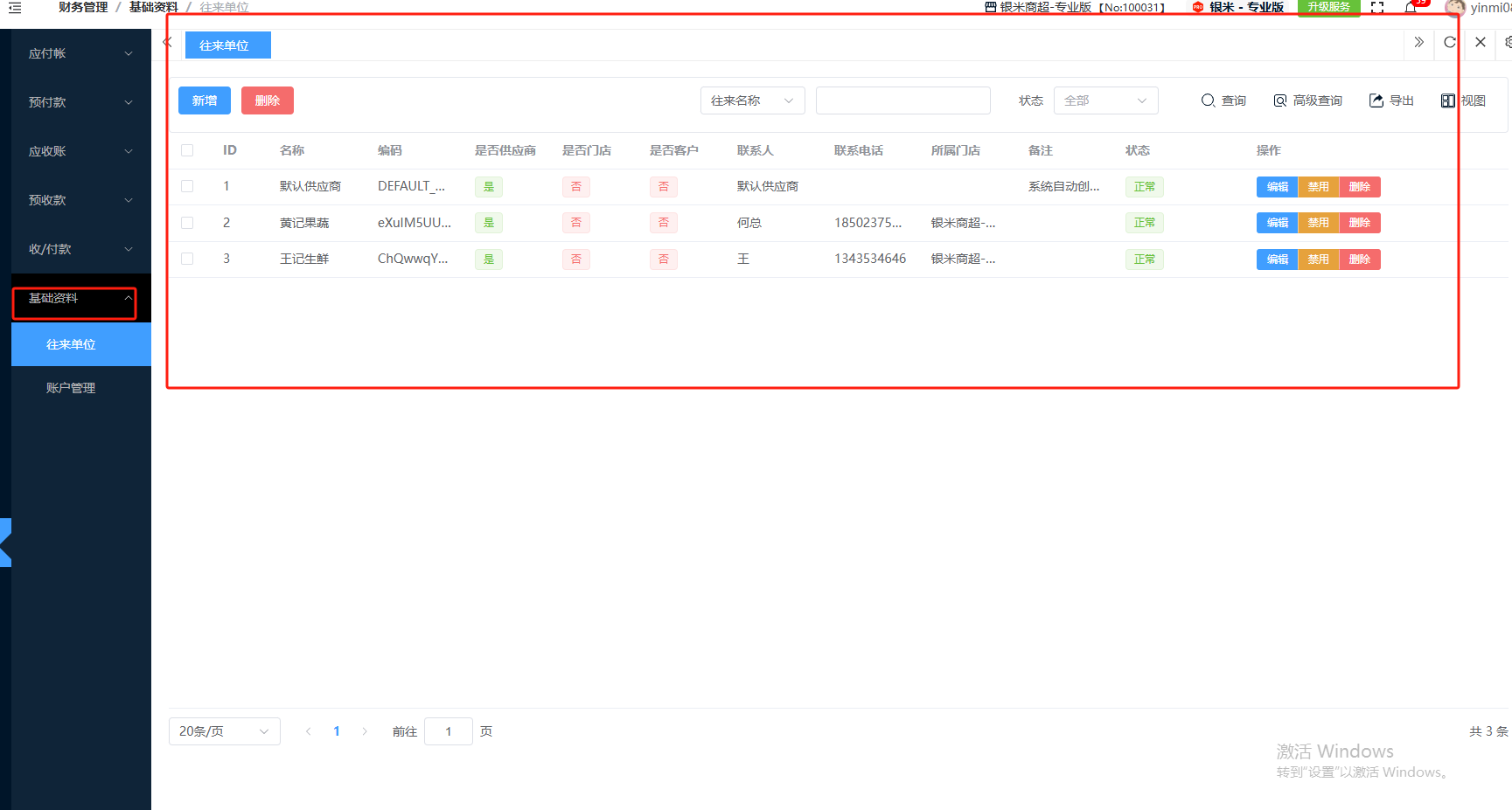 ## 基础资料 基础资料是财务管理系统中用于描述业务实体核心属性、支撑所有财务流程运行的标准化主数据。包含:往来单位、账户管理。 如图所示  一、往来单位是企业经营活动中,与企业发生业务往来(如采购、销售、收款、付款等)的外部组织或个人的统称,是基础资料的核心组成部分。包含:名称、编码、是否供应商等。功能包含:新增、编辑、禁用、删除。 如图所示  1、点击“新增”,录入往来单位的详情资料。点击“保存”即可完成新增。如图所示  2、点击“编辑”可修改往来单位的所有内容,修改完成后点击“保存”即可完成。如图所示  3、点击“禁用”可修改状态为“禁用”或者“启用”。如图所示  4、点击”删除“,右侧为”行删除“,左上角为”列删除“。如图所示  二、账户管理是企业对银行账户、内部核算账户及虚拟账户进行全生命周期管理的财务活动,涵盖开户、操作、监控到销户的全过程。包含:账户名称、账户编码、所属门店等。功能包含:新增、编辑、禁用、删除。 如图所示  1、点击“新增”,录入账户的详情资料。点击“保存”即可完成新增。如图所示  2、点击“编辑”可修改账户的所有内容,修改完成后点击“保存”即可完成。如图所示  3、点击“禁用”可修改状态为“禁用”或者“启用”。如图所示  4、点击”删除“,右侧为”行删除“,左上角为”列删除“。如图所示