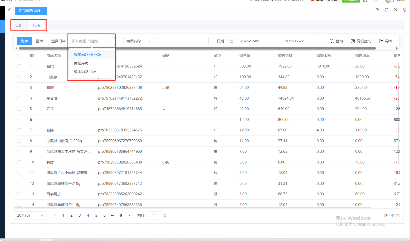 ## **数据报表** 数据报表是将日常经营中产生的各类数据,自动汇总、分析并转化为直观的报告和图表,帮助商家“看懂”生意、做出科学决策的“智慧大脑”,分为:销售排行、数据汇总、库存报表。功能包含:总部和门店查询、商品和日期查询、高级查询、导出、视图。 如图所示  1、可按总部和门店查看。如查看门店,选择门店即可。如图所示  2、可按商品名称、唯一码、拼音码或者日期查询。如图所示  3、可点击”高级查询“,输入商品名称、唯一码 、拼音码或者日期,点击查询即可。如图所示  4、导出是将数据(如报表、列表)转换为可在电脑上独立存储、编辑和分享的文件。点击”导出“,再点击”创建导出任务“,查看详情,下载表格。无需导出点击”删除“即可。 如图所示  5、视图是允许用户根据不同角色和场景,自定义屏幕上显示哪些信息、以何种方式布局,从而实现个性化、高效的操作界面。如图所示