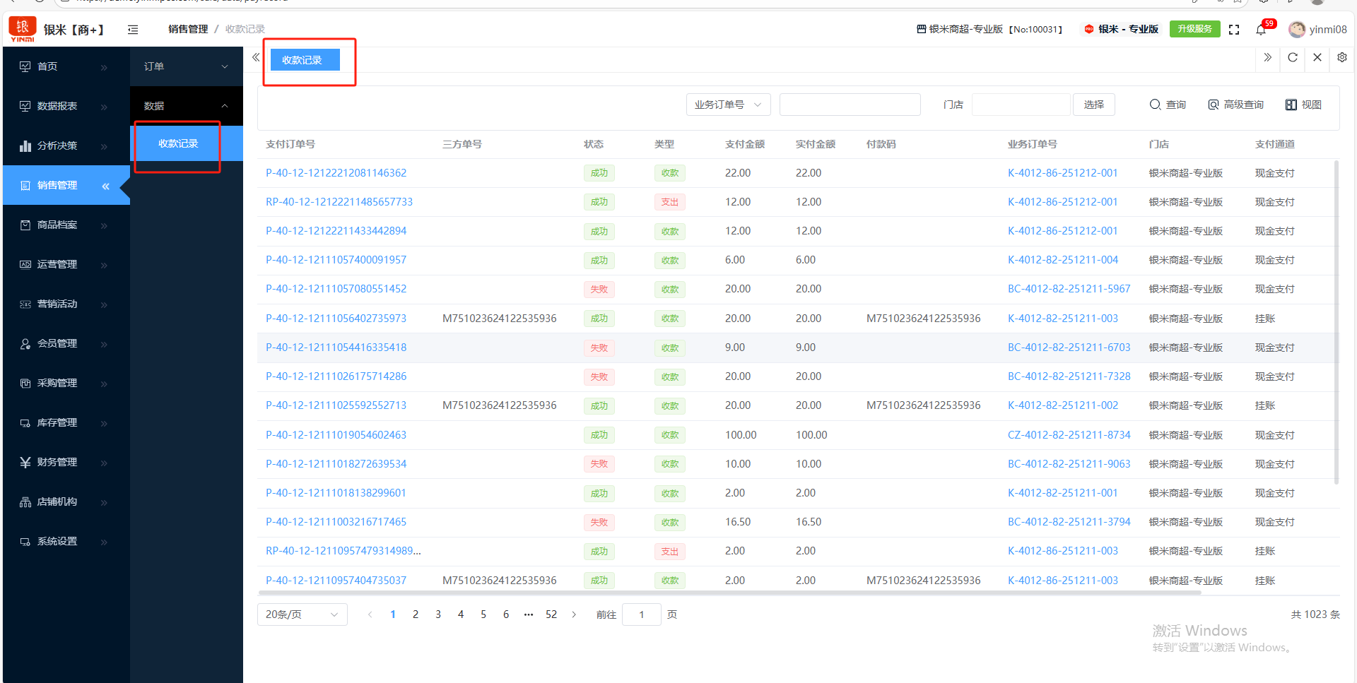 ## 收款记录 收款记录是收银系统中记录每一笔资金成功流入的、不可更改的明细流水,它是财务对账、资金追溯和报表生成的原子数据。包含:支付订单号、状态、类型、支付金额、实付金额、业务订单号等。 如图所示  1、点击“支付订单号”、进入“支付订单”查看详情。如图所示  2、点击“业务订单号”,进入“收银订单”查看详情。如图所示