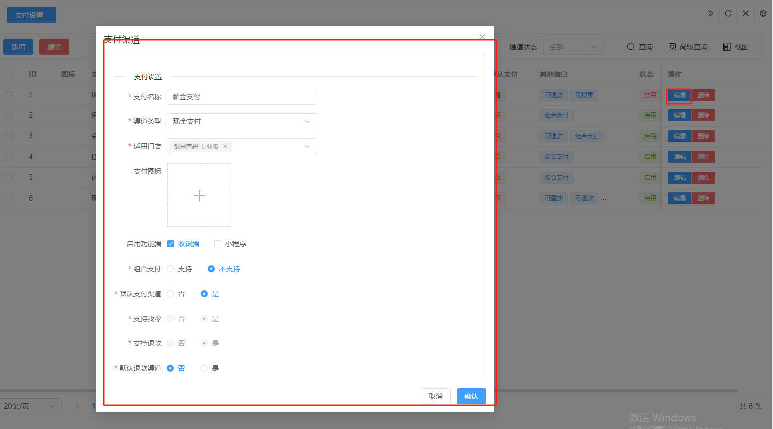 ## 营业设置 营业设置是系统用于配置门店营业规则与运营参数的核心模块,通过标准化设置保障日常经营有序进行。包含:销售设置、支付设置。 如图所示  一、销售设置是系统用于配置销售业务规则与交易参数的核心模块,通过标准化设置保障销售流程规范有序。按照设置内容完成所有设置,点击“保存设置”即可完成。 如图所示  1、配置“收银配置”,选择收银金额四舍五入的方式,去除尾数(对订单总额的零头进行抹零处理)、四舍五入(按“逢五进一、逢四舍去”)、有尾数进一(只要订单金额存在指定尾数,即向上进位至最接近的整数单位),选择是否允许库存超卖,选择是否允许收银端添加临时商品。 如图所示  2、配置“货币配置”,设置货币符号、货币单位。如图所示  3、配置“精度配置”。设置货币精度、数量精度。如图所示  4、配置“营业时间”(只作为报表计时段,不影响正常营业销售),点击“新增营业时间”,录入名称、选择起止时间,点击“确认”即可完成。点击“编辑”可修改全部内容,点击“删除”可删除该条营业时间。如图所示  二、支付设置是系统用于管理和配置各类支付方式参数的核心模块,确保交易流程顺畅、资金安全及对账准确。包含:图标、支付通道、通道别名等。功能包含:新增、编辑、删除。  1、点击“新增”、录入所有相关内容,点击“确认 ”即可完成新增。如图所示  A、录入支付名称。如图所示  B、选择渠道类型。如图所示  C、选择适用门店。如图所示  D、点击“+"上传支付图标。如图所示  E、选择启用功能端(收银端和小程序)、选择组合支付(支付或不支持)、选择默认支付渠道(是或否)、选择渠道启用状态(正常或禁用)。如图所示  2、点击“编辑”可修改支付渠道的所有内容,修改完成后点击“确认”即可完成。如图所示  3、点击”删除“,右侧为”行删除“,左上角为”列删除“。如图所示