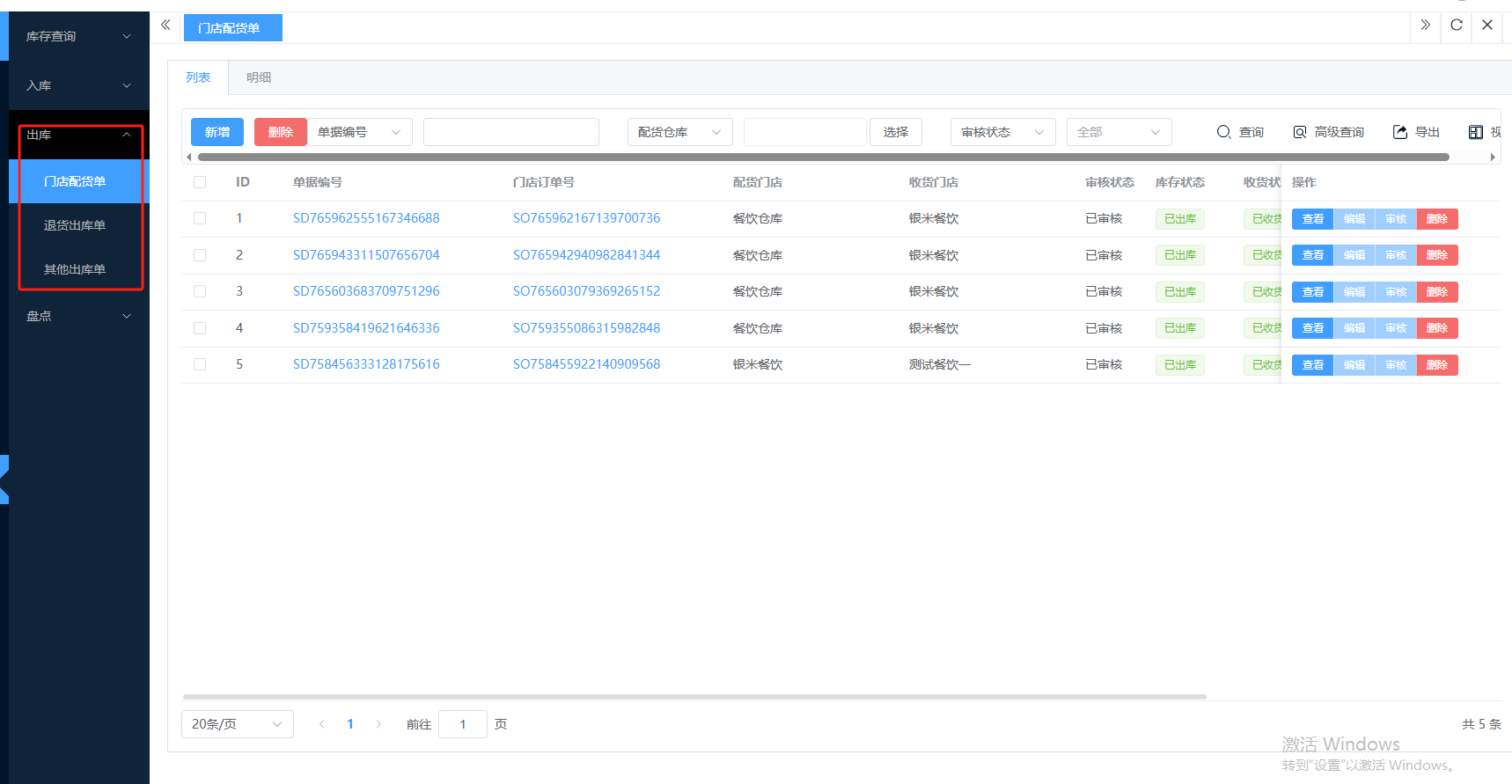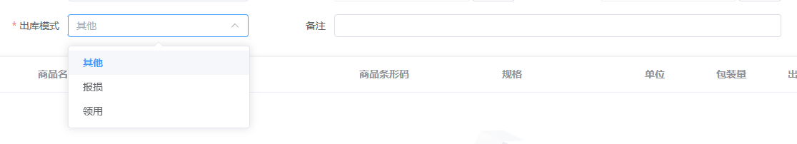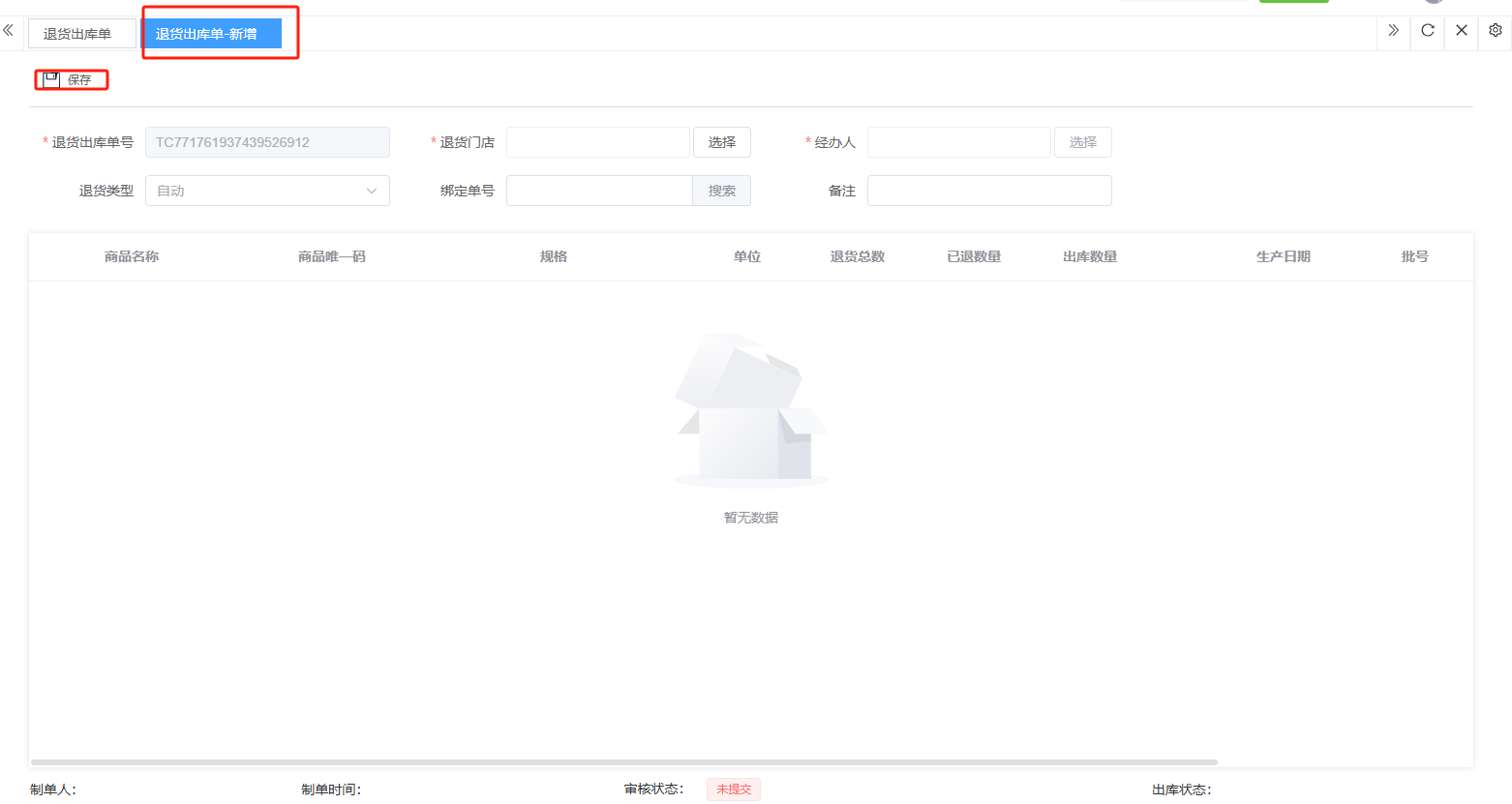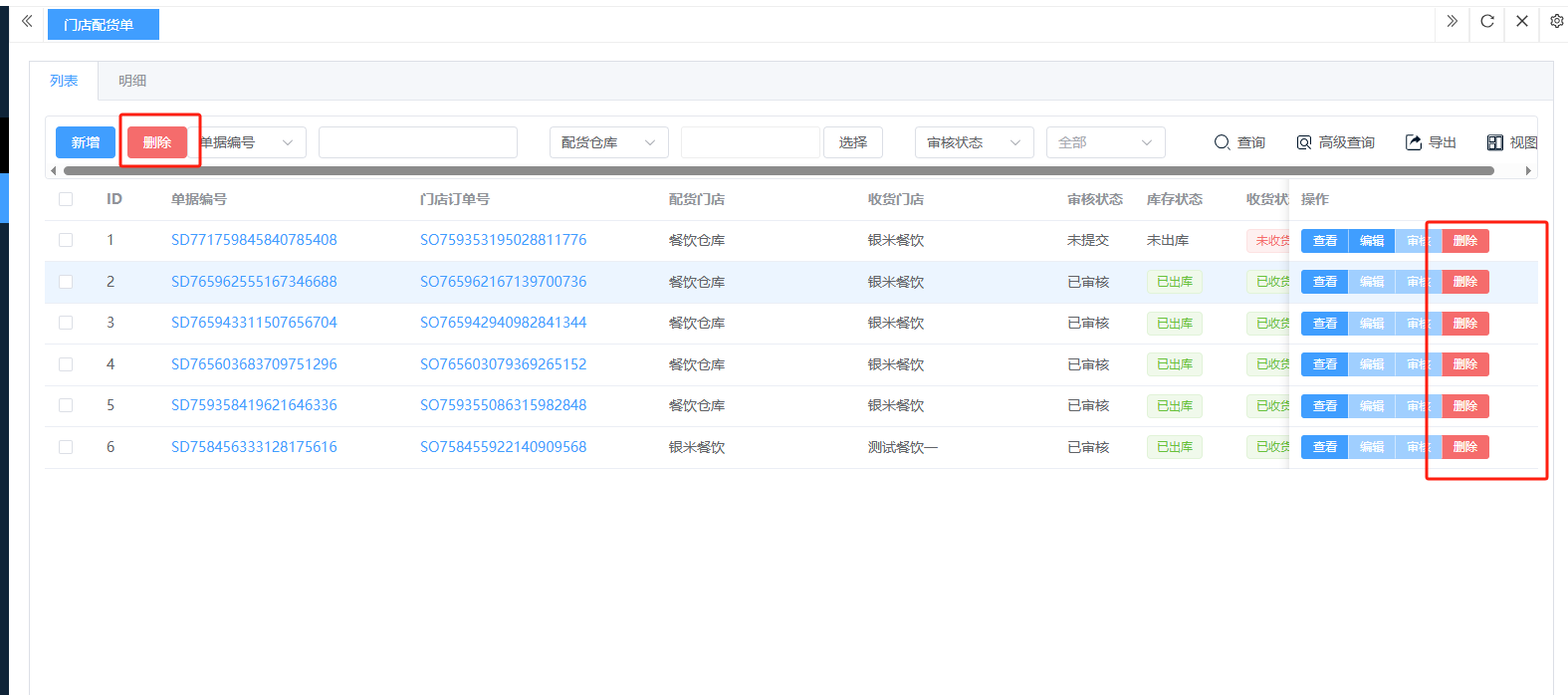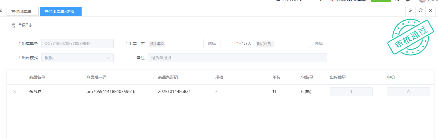 ## 出库 出库是指商品、物料或资产根据业务需求,经过拣选、核对、交接等流程,正式离开仓库存储区域的全过程。包含:门店配货单、退货出库单、其他出库单。 如图所示  一、门店配货单是仓库向门店进行商品补给时,用于指导配货、发货及收货核对的核心作业凭证。包含:单据编号、门店订货单、配货门店、收货门店等。功能包含:新增、查看、编辑、审核、删除、明细。 如图所示  1、点击“新增”、录入所有相关内容,点击“保存 ”即可完成新增。如图所示  A、选择配货仓库、经办人。如图所示  B、选择门店订货单,点击“X”可删除商品。如图所示  2、点击“查看”或者“单据编号”可查看配货单的详情。如图所示  3、点击“编辑”可修改配货单的所有内容,修改完成后点击“保存”即可完成,然后点击”提交审核“。如图所示  4、点击“审核“,选择”通过“或者”拒绝“,即可完成审核。如图所示  5、点击”删除“,右侧为”行删除“,左上角为”列删除“。如图所示  6、点击“明细”,便于查看商品的配货明细。如图所示  二、退货出库单是仓库依据客户退货申请或内部审批,办理货物退回出库的正式凭证,记录退货商品的流出信息。包含:单据编号、退货门店、收货方、退货类型等。功能包含:新增、查看、编辑、审核、删除、明细。 如图所示  1、点击“新增”、录入所有相关内容,点击“保存 ”即可完成新增。如图所示  A、选择退货门店、经办人。如图所示  B、选择退货类型自动,填入单号后自动识别单号。如图所示  选择采购退货单、选择退货单号。如图所示  选择门店退货单、选择门店退货单号。如图所示  C、选择好退货单号后,可修改出库数量。点击“X”可删除商品。如图所示  2、点击“查看”或者“单据编号”可查看入库单的详情。如图所示  3、点击“编辑”可修改退货出库单的所有内容,修改完成后点击“保存”即可完成,然后点击”提交审核“。如图所示  4、点击“审核“,选择”通过“或者”拒绝“,即可完成审核。如图所示  5、点击”删除“,右侧为”行删除“,左上角为”列删除“。如图所示  6、点击“明细”,便于查看商品的入库明细。如图所示  三、其他出库单用于记录非销售出库以外的其他形式库存减少业务,是确保所有库存变动均有迹可循的关键管理工具。包含:单据编号、出库门店、出库类型、商品总额等。功能包含:新增、查看、编辑、审核、删除、明细。 如图所示  1、点击“新增”、录入所有相关内容,点击“保存 ”即可完成新增。如图所示  A、选择出库门店、经办人。如图所示  B、选择出库模式其他(处理特殊流出业务)、报损(处理不可用的库存)、领用(满足内部运营需求)。 如图所示 C、点击“添加商品”,选择出库商品,需要输入出库数量和单价。点击“X”可删除商品。如图所示  2、点击“查看”或者“单据编号”可查看入库单的详情。如图所示  3、点击“编辑”可修改其他出库单的所有内容,修改完成后点击“保存”即可完成,然后点击”提交审核“。如图所示  4、点击“审核“,选择”通过“或者”拒绝“,即可完成审核。如图所示  5、点击”删除“,右侧为”行删除“,左上角为”列删除“。如图所示  6、点击“明细”,便于查看商品的入库明细。如图所示
