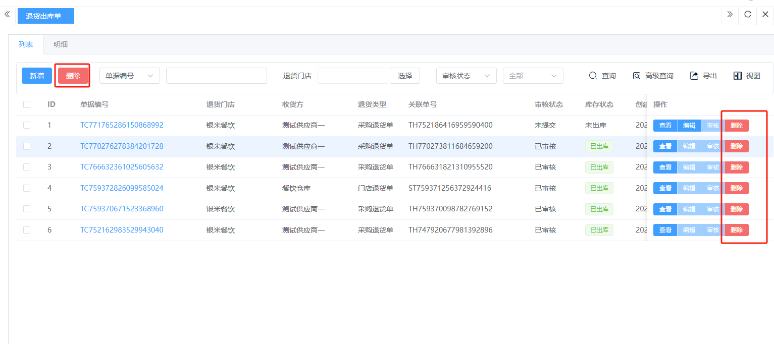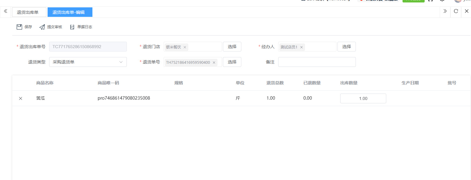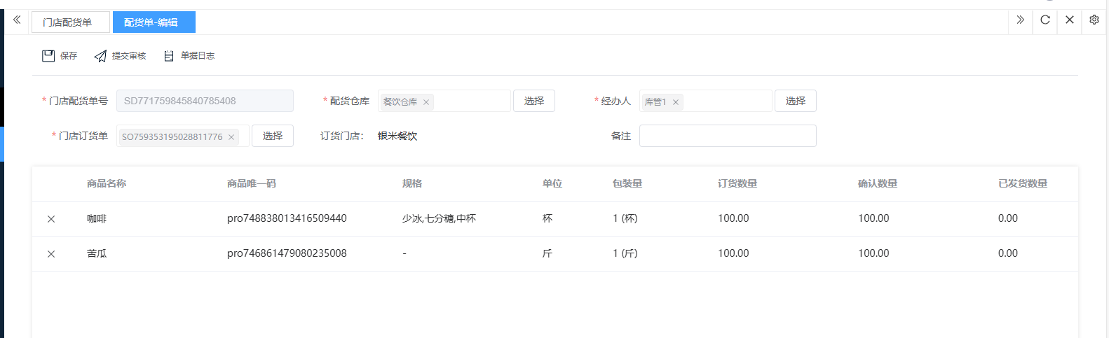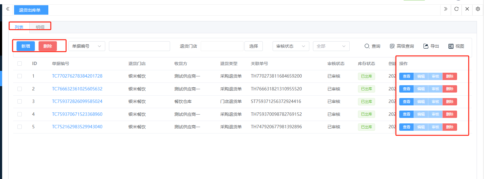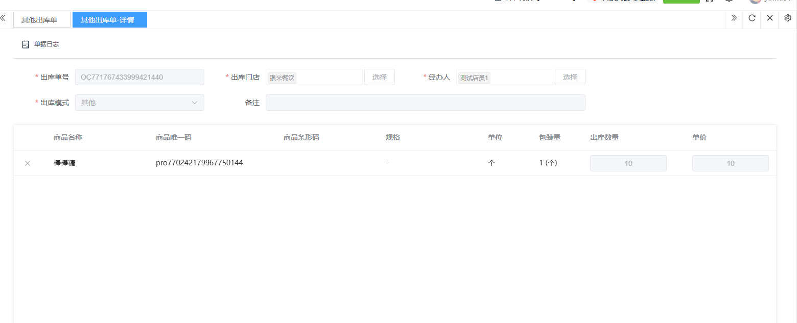 ## 出库 出库是指商品、物料或资产根据业务需求,经过拣选、核对、交接等流程,正式离开仓库存储区域的全过程。包含:门店配货单、退货出库单、其他出库单。 如图所示  一、门店配货单是仓库向门店进行商品补给时,用于指导配货、发货及收货核对的核心作业凭证。包含:单据编号、门店订货单、配货门店、收货门店等。功能包含:新增、查看、编辑、审核、删除、明细。 如图所示  1、点击“新增”、录入所有相关内容,点击“保存 ”即可完成新增。如图所示  A、选择配货仓库、经办人。如图所示  B、选择门店订货单,点击“X”可删除商品。如图所示  2、点击“查看”或者“单据编号”可查看配货单的详情。如图所示  3、点击“编辑”可修改配货单的所有内容,修改完成后点击“保存”即可完成,然后点击”提交审核“。如图所示  4、点击“审核“,选择”通过“或者”拒绝“,即可完成审核。如图所示  5、点击”删除“,右侧为”行删除“,左上角为”列删除“。如图所示  6、点击“明细”,便于查看商品的配货明细。如图所示  二、退货出库单是仓库依据客户退货申请或内部审批,办理货物退回出库的正式凭证,记录退货商品的流出信息。包含:单据编号、退货门店、收货方、退货类型等。功能包含:新增、查看、编辑、审核、删除、明细。 如图所示  1、点击“新增”、录入所有相关内容,点击“保存 ”即可完成新增。如图所示  A、选择退货门店、经办人。如图所示  B、选择退货类型自动,填入单号后自动识别单号。如图所示  选择采购退货单、选择退货单号。如图所示  选择门店退货单、选择门店退货单号。如图所示  C、选择好退货单号后,可修改出库数量。点击“X”可删除商品。如图所示  2、点击“查看”或者“单据编号”可查看入库单的详情。如图所示  3、点击“编辑”可修改退货出库单的所有内容,修改完成后点击“保存”即可完成,然后点击”提交审核“。如图所示  4、点击“审核“,选择”通过“或者”拒绝“,即可完成审核。如图所示  5、点击”删除“,右侧为”行删除“,左上角为”列删除“。如图所示  6、点击“明细”,便于查看商品的入库明细。如图所示  三、其他出库单用于记录非销售出库以外的其他形式库存减少业务,是确保所有库存变动均有迹可循的关键管理工具。包含:单据编号、出库门店、出库类型、商品总额等。功能包含:新增、查看、编辑、审核、删除、明细。 如图所示  1、点击“新增”、录入所有相关内容,点击“保存 ”即可完成新增。如图所示  A、选择出库门店、经办人。如图所示  B、选择出库模式其他(处理特殊流出业务)、报损(处理不可用的库存)、领用(满足内部运营需求)。 如图所示 C、点击“添加商品”,选择出库商品,需要输入出库数量和单价。点击“X”可删除商品。如图所示  2、点击“查看”或者“单据编号”可查看入库单的详情。如图所示  3、点击“编辑”可修改其他出库单的所有内容,修改完成后点击“保存”即可完成,然后点击”提交审核“。如图所示  4、点击“审核“,选择”通过“或者”拒绝“,即可完成审核。如图所示  5、点击”删除“,右侧为”行删除“,左上角为”列删除“。如图所示  6、点击“明细”,便于查看商品的入库明细。如图所示