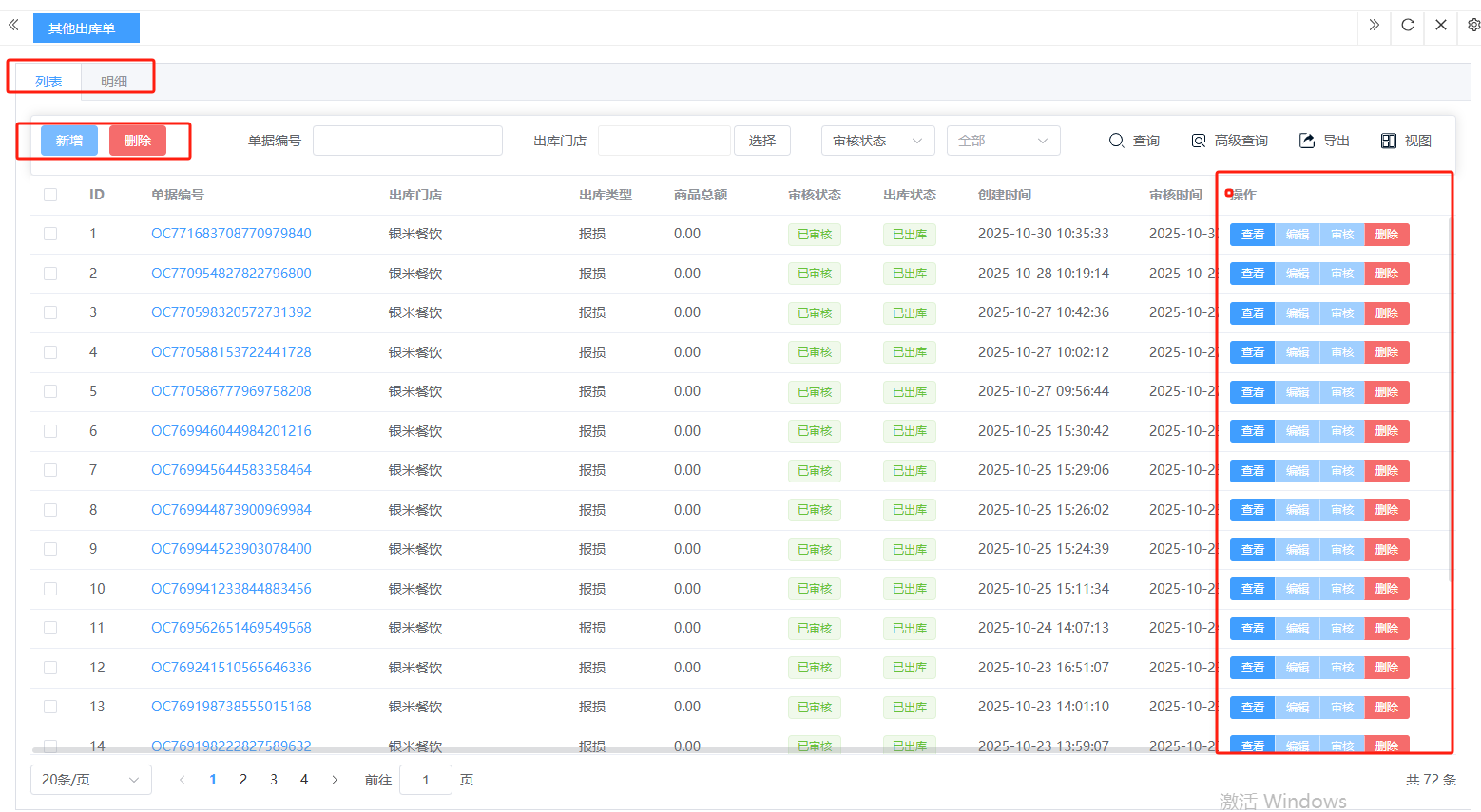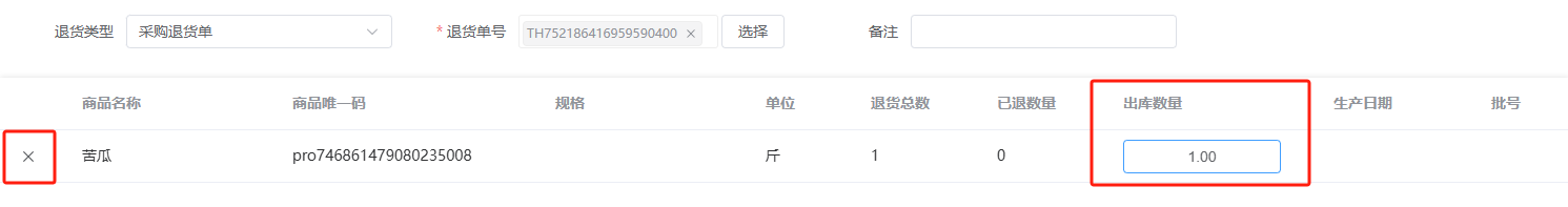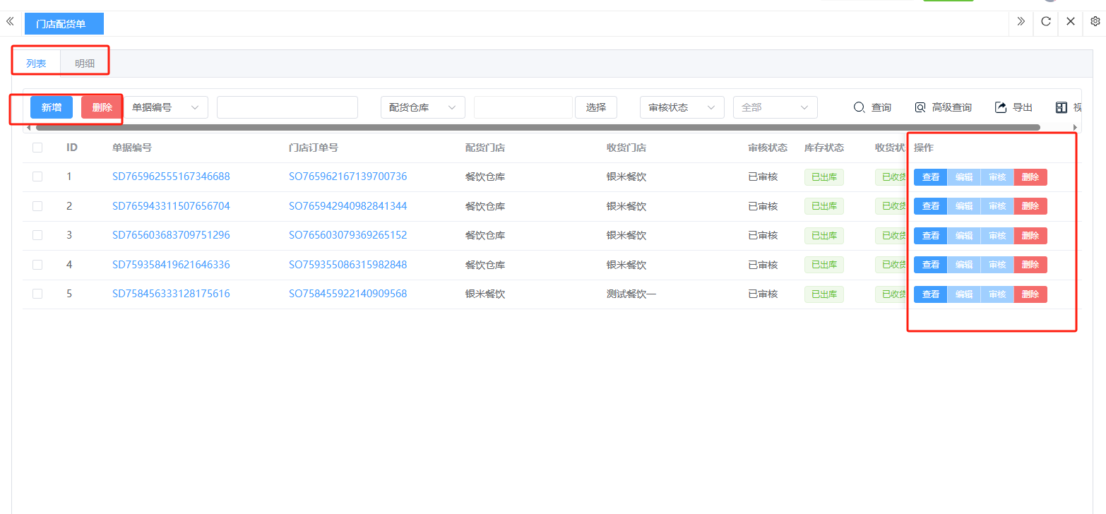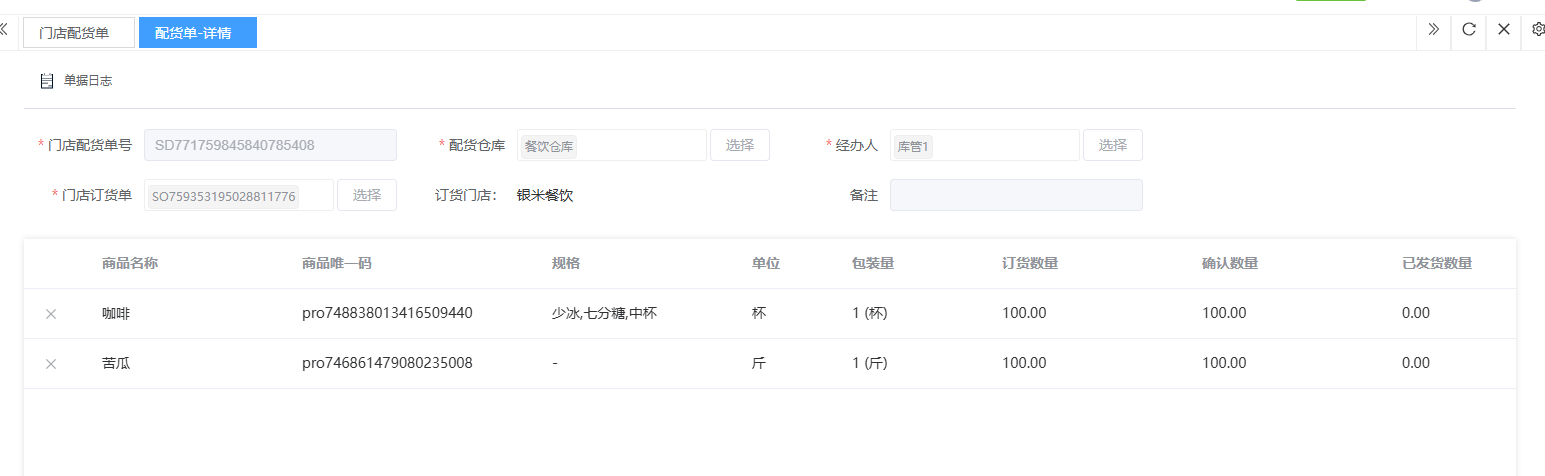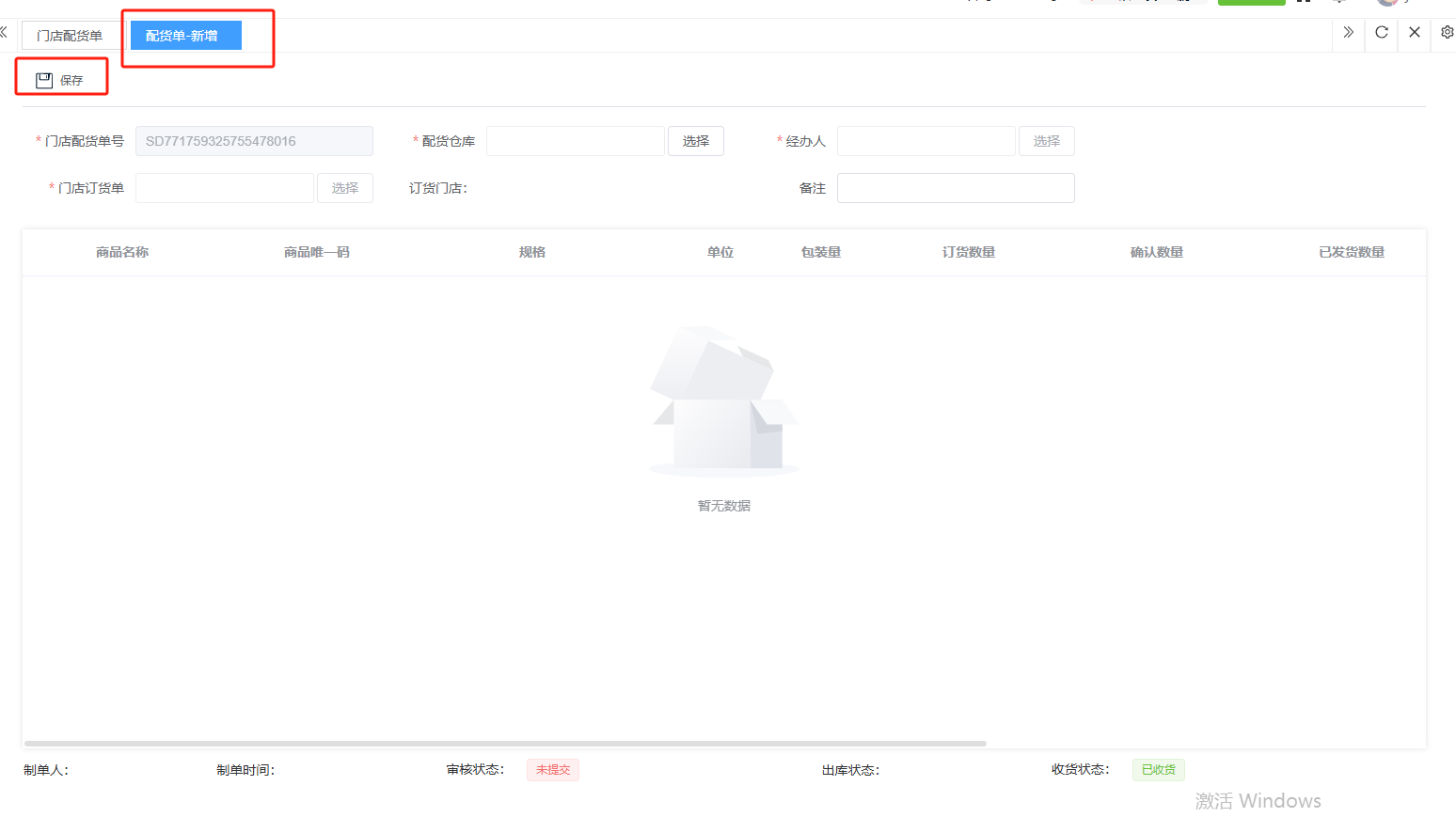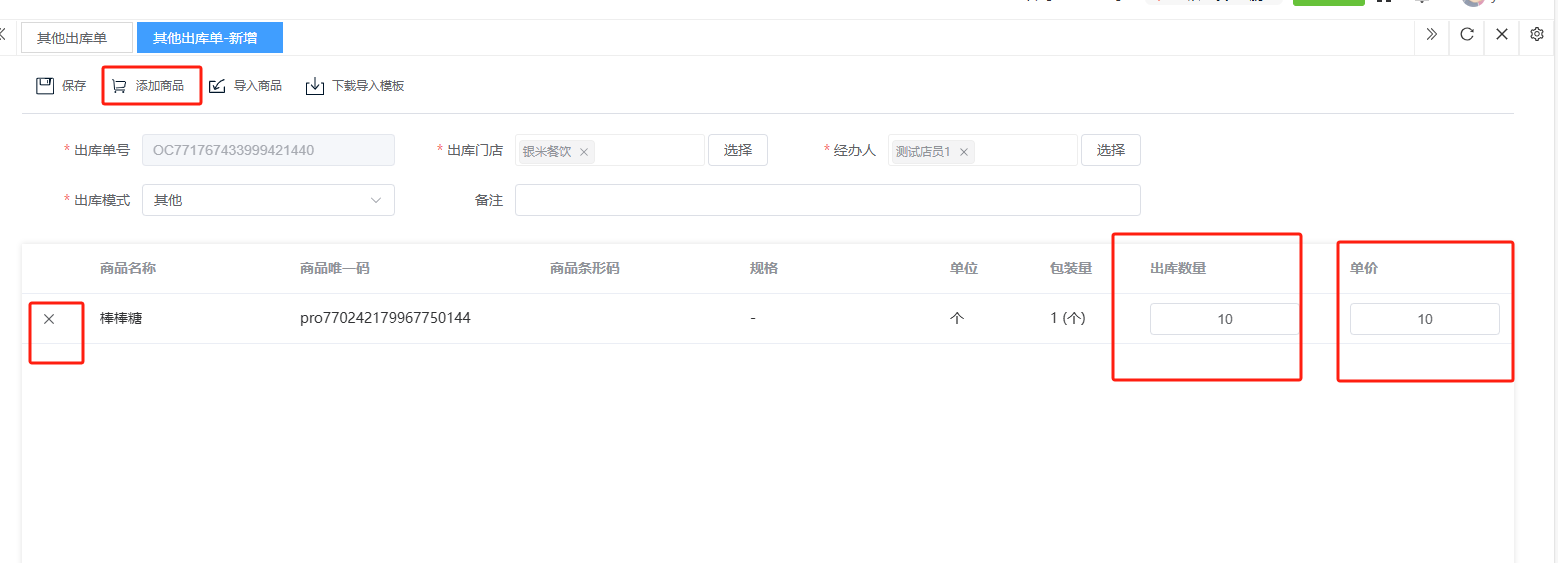 ## 出库 出库是指商品、物料或资产根据业务需求,经过拣选、核对、交接等流程,正式离开仓库存储区域的全过程。包含:门店配货单、退货出库单、其他出库单。 如图所示  一、门店配货单是仓库向门店进行商品补给时,用于指导配货、发货及收货核对的核心作业凭证。包含:单据编号、门店订货单、配货门店、收货门店等。功能包含:新增、查看、编辑、审核、删除、明细。 如图所示  1、点击“新增”、录入所有相关内容,点击“保存 ”即可完成新增。如图所示  A、选择配货仓库、经办人。如图所示  B、选择门店订货单,点击“X”可删除商品。如图所示  2、点击“查看”或者“单据编号”可查看配货单的详情。如图所示  3、点击“编辑”可修改配货单的所有内容,修改完成后点击“保存”即可完成,然后点击”提交审核“。如图所示  4、点击“审核“,选择”通过“或者”拒绝“,即可完成审核。如图所示  5、点击”删除“,右侧为”行删除“,左上角为”列删除“。如图所示  6、点击“明细”,便于查看商品的配货明细。如图所示  二、退货出库单是仓库依据客户退货申请或内部审批,办理货物退回出库的正式凭证,记录退货商品的流出信息。包含:单据编号、退货门店、收货方、退货类型等。功能包含:新增、查看、编辑、审核、删除、明细。 如图所示  1、点击“新增”、录入所有相关内容,点击“保存 ”即可完成新增。如图所示  A、选择退货门店、经办人。如图所示  B、选择退货类型自动,填入单号后自动识别单号。如图所示  选择采购退货单、选择退货单号。如图所示  选择门店退货单、选择门店退货单号。如图所示  C、选择好退货单号后,可修改出库数量。点击“X”可删除商品。如图所示  2、点击“查看”或者“单据编号”可查看入库单的详情。如图所示  3、点击“编辑”可修改退货出库单的所有内容,修改完成后点击“保存”即可完成,然后点击”提交审核“。如图所示  4、点击“审核“,选择”通过“或者”拒绝“,即可完成审核。如图所示  5、点击”删除“,右侧为”行删除“,左上角为”列删除“。如图所示  6、点击“明细”,便于查看商品的入库明细。如图所示  三、其他出库单用于记录非销售出库以外的其他形式库存减少业务,是确保所有库存变动均有迹可循的关键管理工具。包含:单据编号、出库门店、出库类型、商品总额等。功能包含:新增、查看、编辑、审核、删除、明细。 如图所示  1、点击“新增”、录入所有相关内容,点击“保存 ”即可完成新增。如图所示  A、选择出库门店、经办人。如图所示  B、选择出库模式其他(处理特殊流出业务)、报损(处理不可用的库存)、领用(满足内部运营需求)。 如图所示 C、点击“添加商品”,选择出库商品,需要输入出库数量和单价。点击“X”可删除商品。如图所示  2、点击“查看”或者“单据编号”可查看入库单的详情。如图所示  3、点击“编辑”可修改其他出库单的所有内容,修改完成后点击“保存”即可完成,然后点击”提交审核“。如图所示  4、点击“审核“,选择”通过“或者”拒绝“,即可完成审核。如图所示  5、点击”删除“,右侧为”行删除“,左上角为”列删除“。如图所示  6、点击“明细”,便于查看商品的入库明细。如图所示