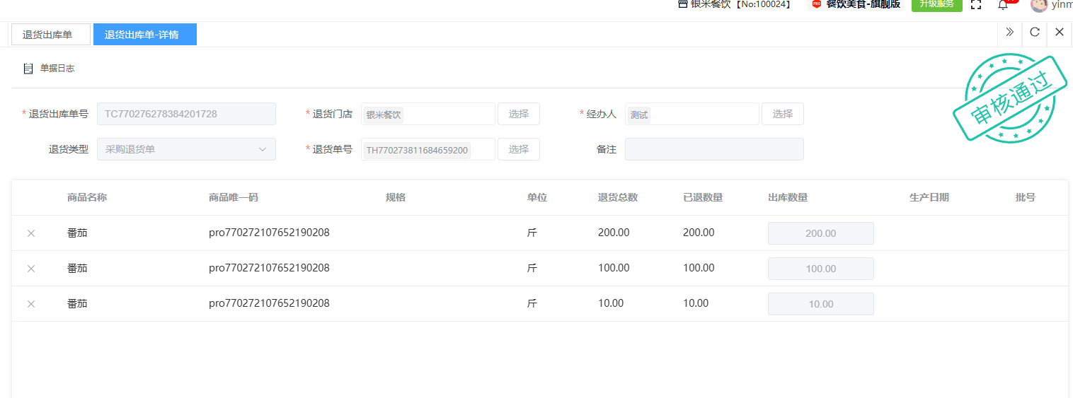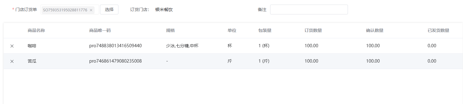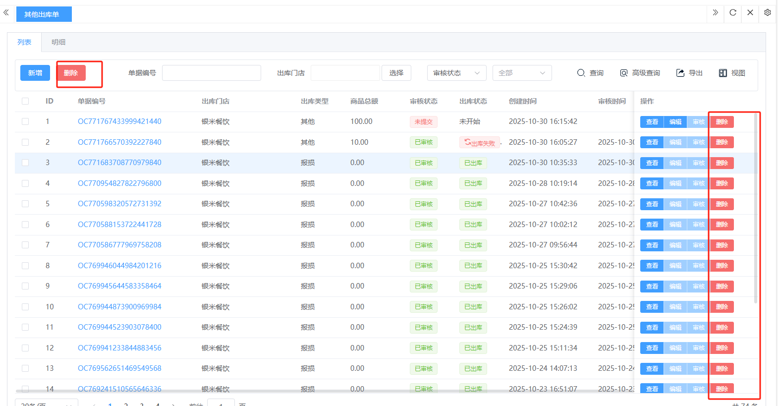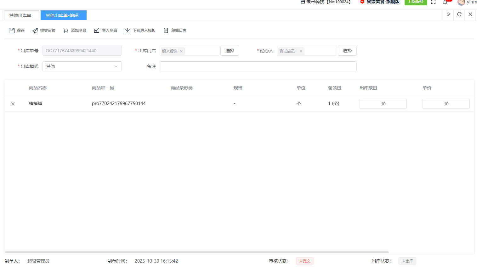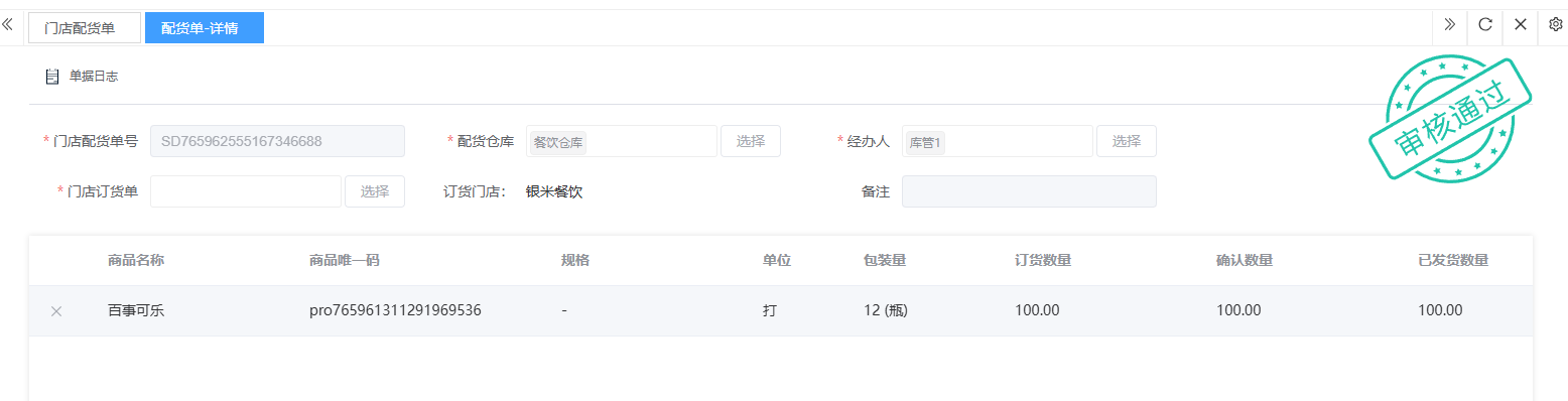 ## 出库 出库是指商品、物料或资产根据业务需求,经过拣选、核对、交接等流程,正式离开仓库存储区域的全过程。包含:门店配货单、退货出库单、其他出库单。 如图所示  一、门店配货单是仓库向门店进行商品补给时,用于指导配货、发货及收货核对的核心作业凭证。包含:单据编号、门店订货单、配货门店、收货门店等。功能包含:新增、查看、编辑、审核、删除、明细。 如图所示  1、点击“新增”、录入所有相关内容,点击“保存 ”即可完成新增。如图所示  A、选择配货仓库、经办人。如图所示  B、选择门店订货单,点击“X”可删除商品。如图所示  2、点击“查看”或者“单据编号”可查看配货单的详情。如图所示  3、点击“编辑”可修改配货单的所有内容,修改完成后点击“保存”即可完成,然后点击”提交审核“。如图所示  4、点击“审核“,选择”通过“或者”拒绝“,即可完成审核。如图所示  5、点击”删除“,右侧为”行删除“,左上角为”列删除“。如图所示  6、点击“明细”,便于查看商品的配货明细。如图所示  二、退货出库单是仓库依据客户退货申请或内部审批,办理货物退回出库的正式凭证,记录退货商品的流出信息。包含:单据编号、退货门店、收货方、退货类型等。功能包含:新增、查看、编辑、审核、删除、明细。 如图所示  1、点击“新增”、录入所有相关内容,点击“保存 ”即可完成新增。如图所示  A、选择退货门店、经办人。如图所示  B、选择退货类型自动,填入单号后自动识别单号。如图所示  选择采购退货单、选择退货单号。如图所示  选择门店退货单、选择门店退货单号。如图所示  C、选择好退货单号后,可修改出库数量。点击“X”可删除商品。如图所示  2、点击“查看”或者“单据编号”可查看入库单的详情。如图所示  3、点击“编辑”可修改退货出库单的所有内容,修改完成后点击“保存”即可完成,然后点击”提交审核“。如图所示  4、点击“审核“,选择”通过“或者”拒绝“,即可完成审核。如图所示  5、点击”删除“,右侧为”行删除“,左上角为”列删除“。如图所示  6、点击“明细”,便于查看商品的入库明细。如图所示  三、其他出库单用于记录非销售出库以外的其他形式库存减少业务,是确保所有库存变动均有迹可循的关键管理工具。包含:单据编号、出库门店、出库类型、商品总额等。功能包含:新增、查看、编辑、审核、删除、明细。 如图所示  1、点击“新增”、录入所有相关内容,点击“保存 ”即可完成新增。如图所示  A、选择出库门店、经办人。如图所示  B、选择出库模式其他(处理特殊流出业务)、报损(处理不可用的库存)、领用(满足内部运营需求)。 如图所示 C、点击“添加商品”,选择出库商品,需要输入出库数量和单价。点击“X”可删除商品。如图所示  2、点击“查看”或者“单据编号”可查看入库单的详情。如图所示  3、点击“编辑”可修改其他出库单的所有内容,修改完成后点击“保存”即可完成,然后点击”提交审核“。如图所示  4、点击“审核“,选择”通过“或者”拒绝“,即可完成审核。如图所示  5、点击”删除“,右侧为”行删除“,左上角为”列删除“。如图所示  6、点击“明细”,便于查看商品的入库明细。如图所示