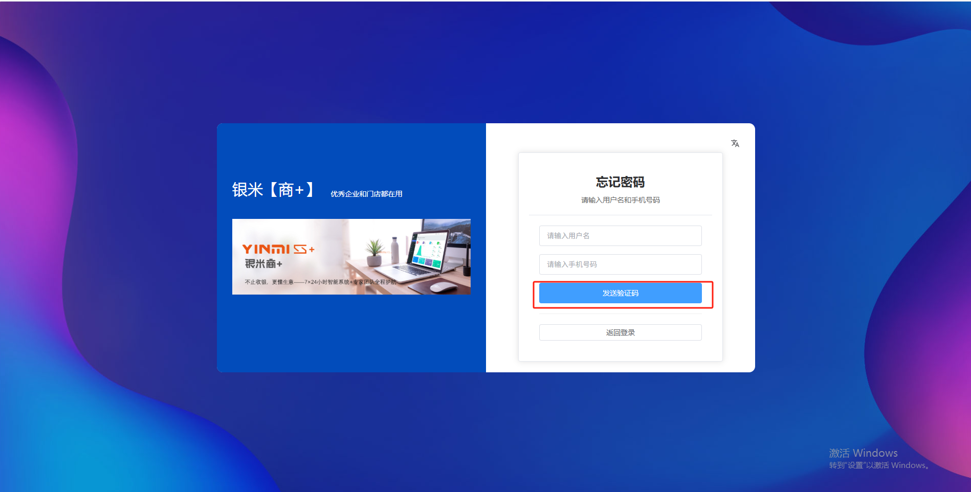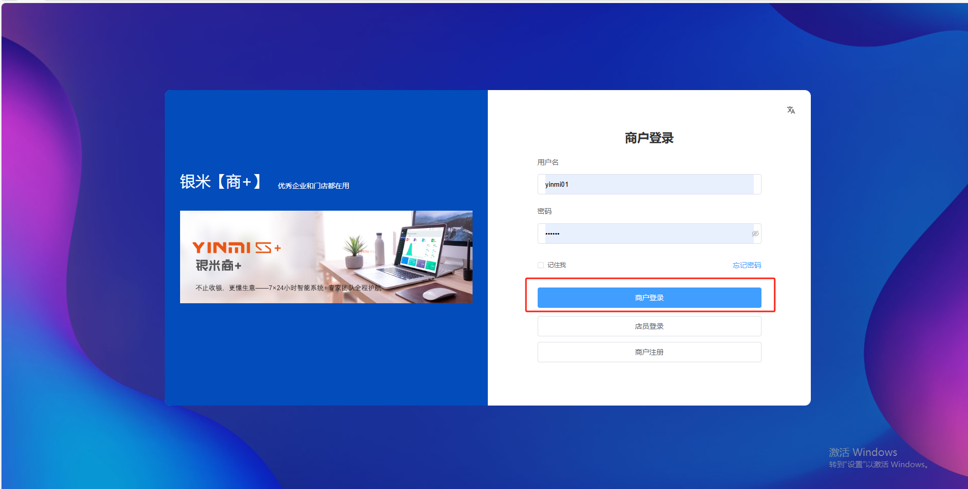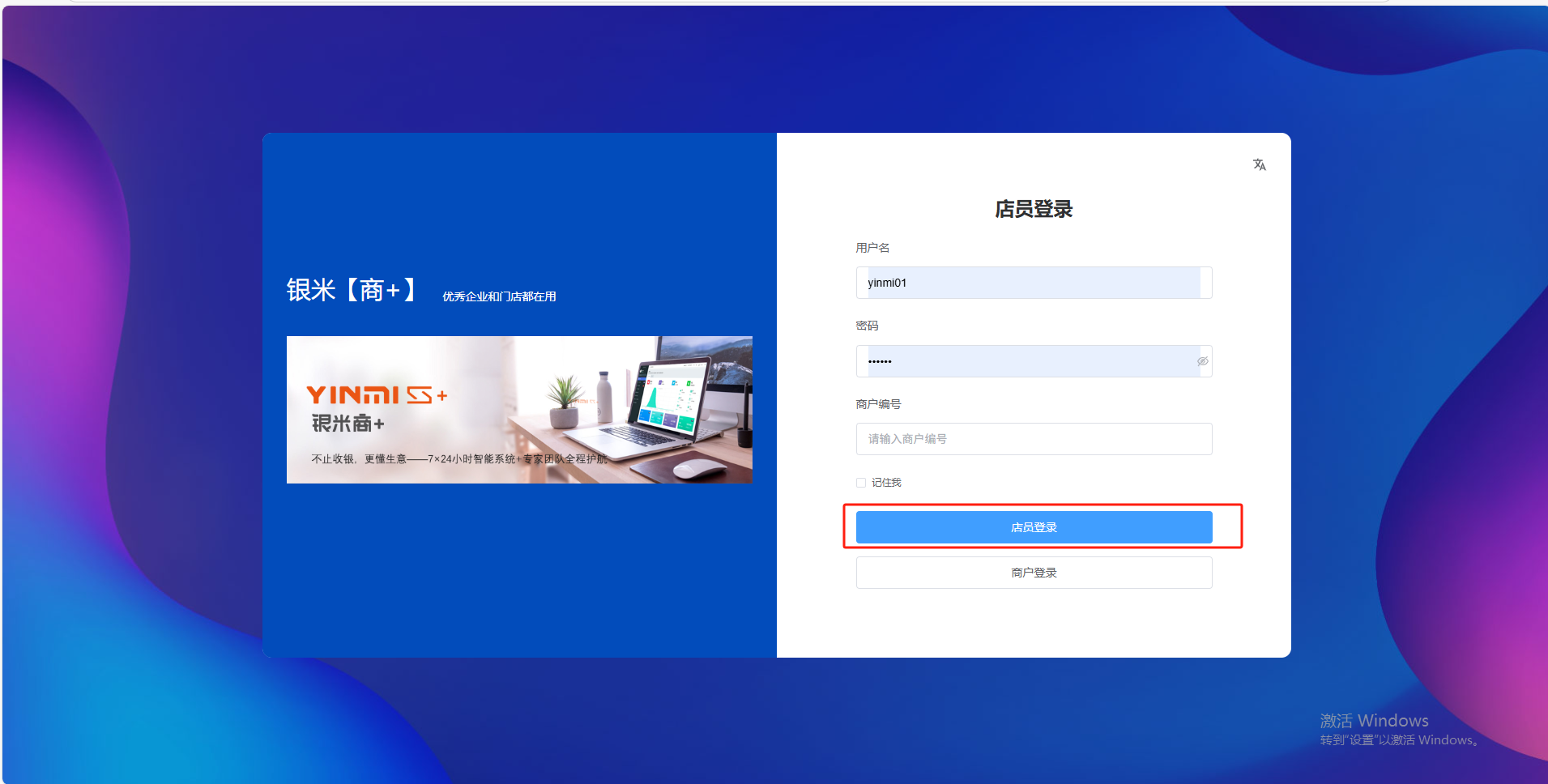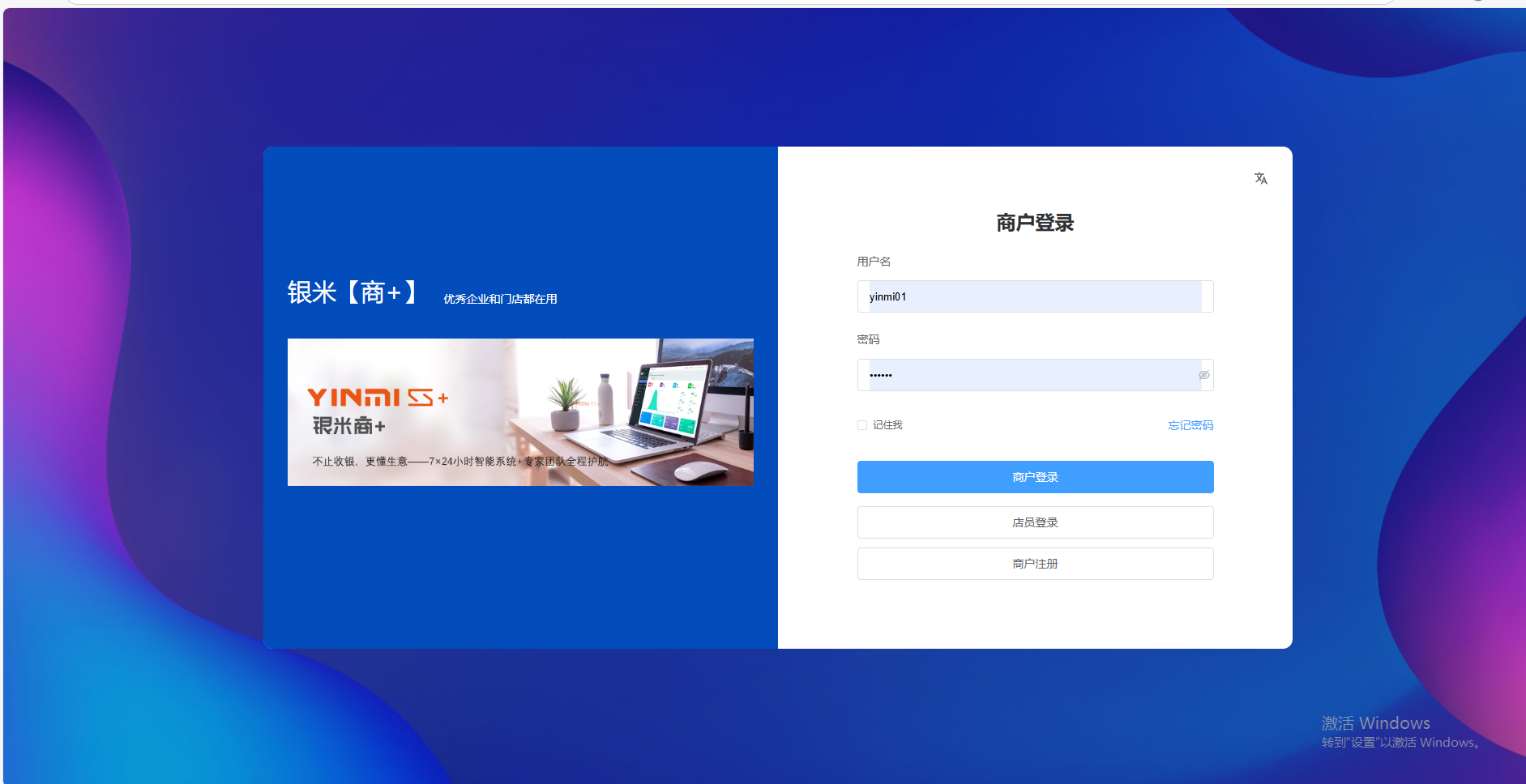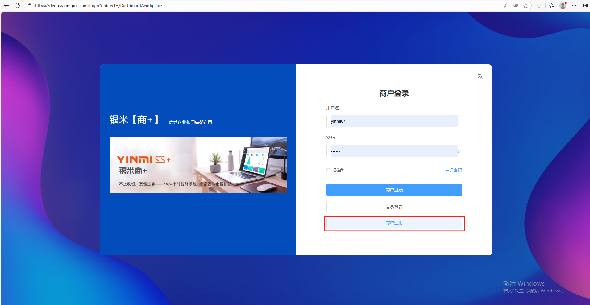 ``` 登录系统 ``` 一、登录“银米餐饮版”官网商户后台,点击 (https://demo.yinmipos.com),进入登录页面。包含:商户登录、店员登录、商户注册。 如图所示  1、商户登录直接输入用户名、密码,点击”商户登录“即可。 如图所示  2、如忘记登录密码,点击忘记密码,输入用户名,注册手机号,点击发送验证码即可。 如图所示  3、店员登录直接输入用户名、密码、商户密码,点击”店员登录“即可。 如图所示  4、如没有注册账户,点击”商户注册“,进入商户注册页面进行注册。 如图所示