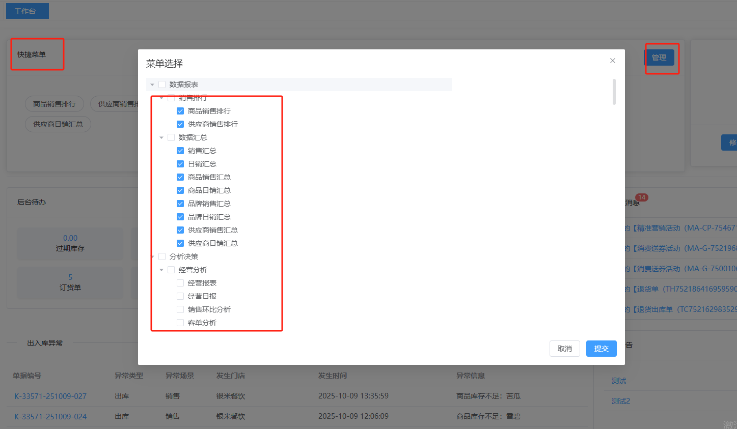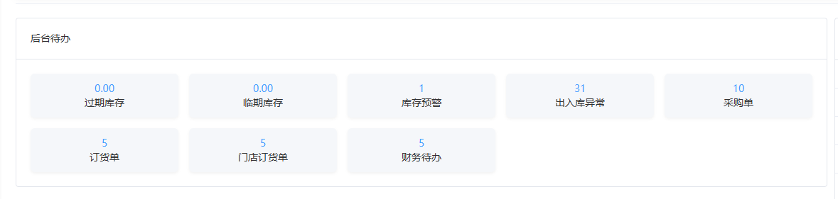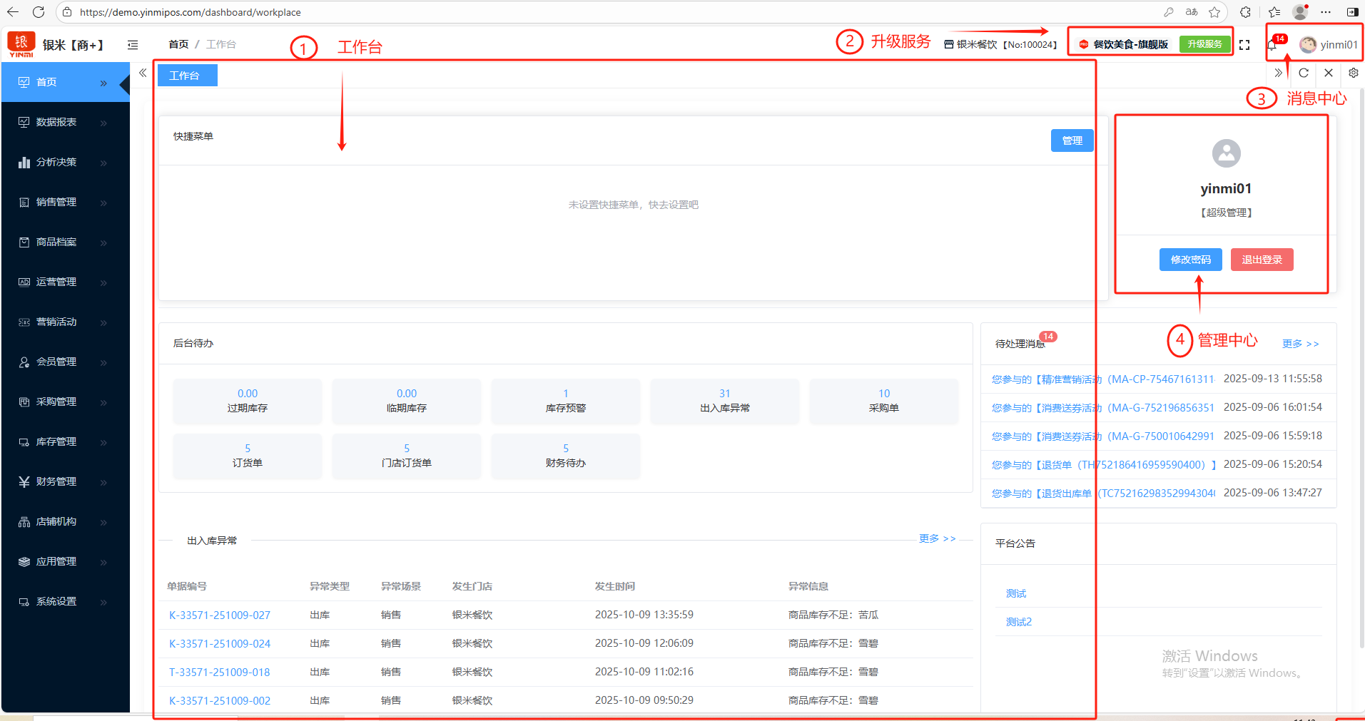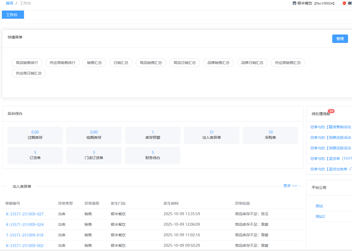 ### **后台首页** ”后台首页“是商户后台的综合页面。包含:营业概况、工作台、升级服务、消息中心、管理中心。 如图所示  一、营业概况是一份高度浓缩的经营快照,它通过汇总关键业绩指标,让管理者在最短时间内对生意的健康度、效率和趋势有一个全面且直观的认知。按时间:今天、昨天、进7天、本月。按门店:全部门店和单店。 如图所示  二、工作台是商户后台的信息综合平台。包含:快捷菜单、后台待办、出入库异常、待处理消息、平台公告。 如图所示  1、快捷菜单是商户自主设置最重要的信息查询平台。点击”管理“勾选所需要查询的栏目即可设置。 如图所示  2、后台待办是商户需要快速处理的待办事项。如图所示  3、出入库异常是销售的异常事件,点击”单据编号“即可查看具体详情。如图所示  4、待处理消息是门店需要处理的事项,点击”活动情况“即可查看具体详情。如图所示  5、平台公告是公司平台发布的各类公告,点击即可查看详情。如图所示  三、升级服务是平台通过技术迭代与服务优化,帮助商家提升运营效率、优化顾客体验、并创造新的增长点。 如图所示  四、消息中心是一个非常重要的信息枢纽。一个集中接收、处理和提醒各类系统消息与业务动态的功能模块,旨在让经营者和员工能够及时响应,确保店铺顺畅运营。如处理完毕,点击”标记已读“即可关闭该消息。 如图所示  五、管理中心是商户修改密码、退出登录的按钮。点击”修改密码“输入旧密码、新密码、确认新密码,提交即可。如要退出后台,点击”退出登录“即可。 如图所示