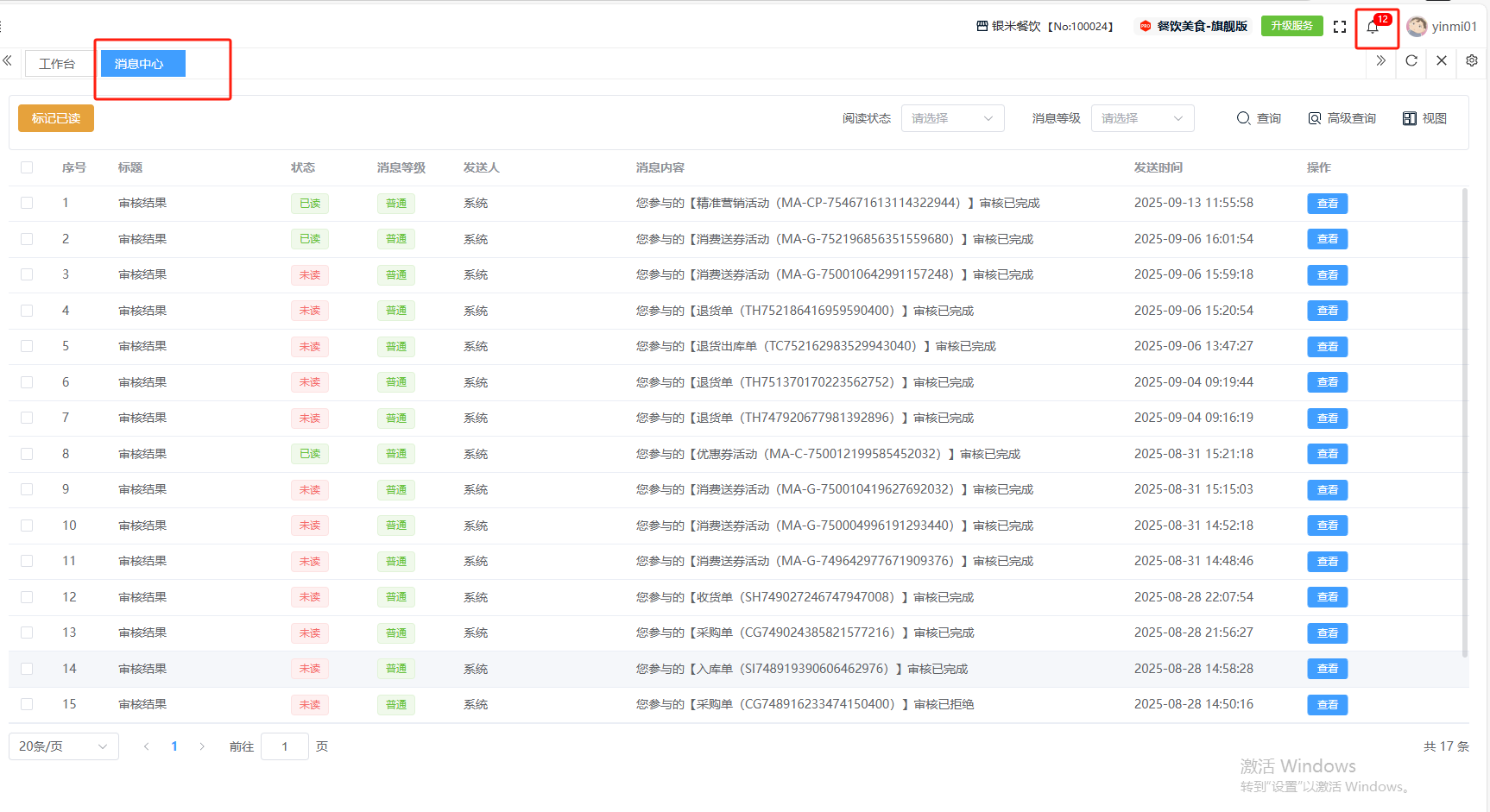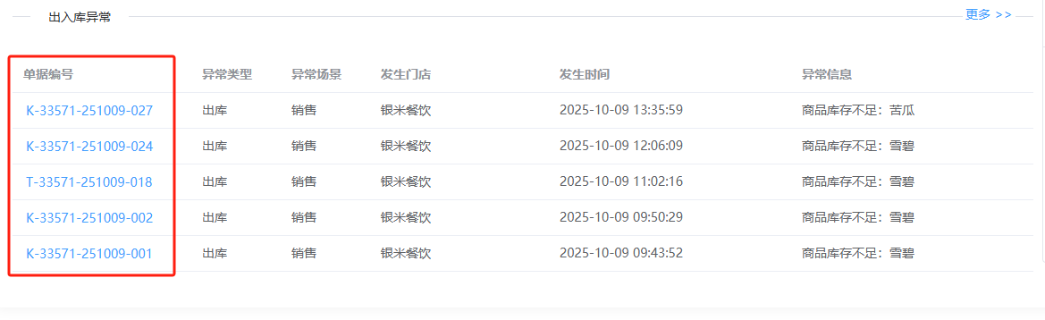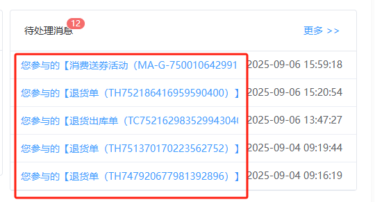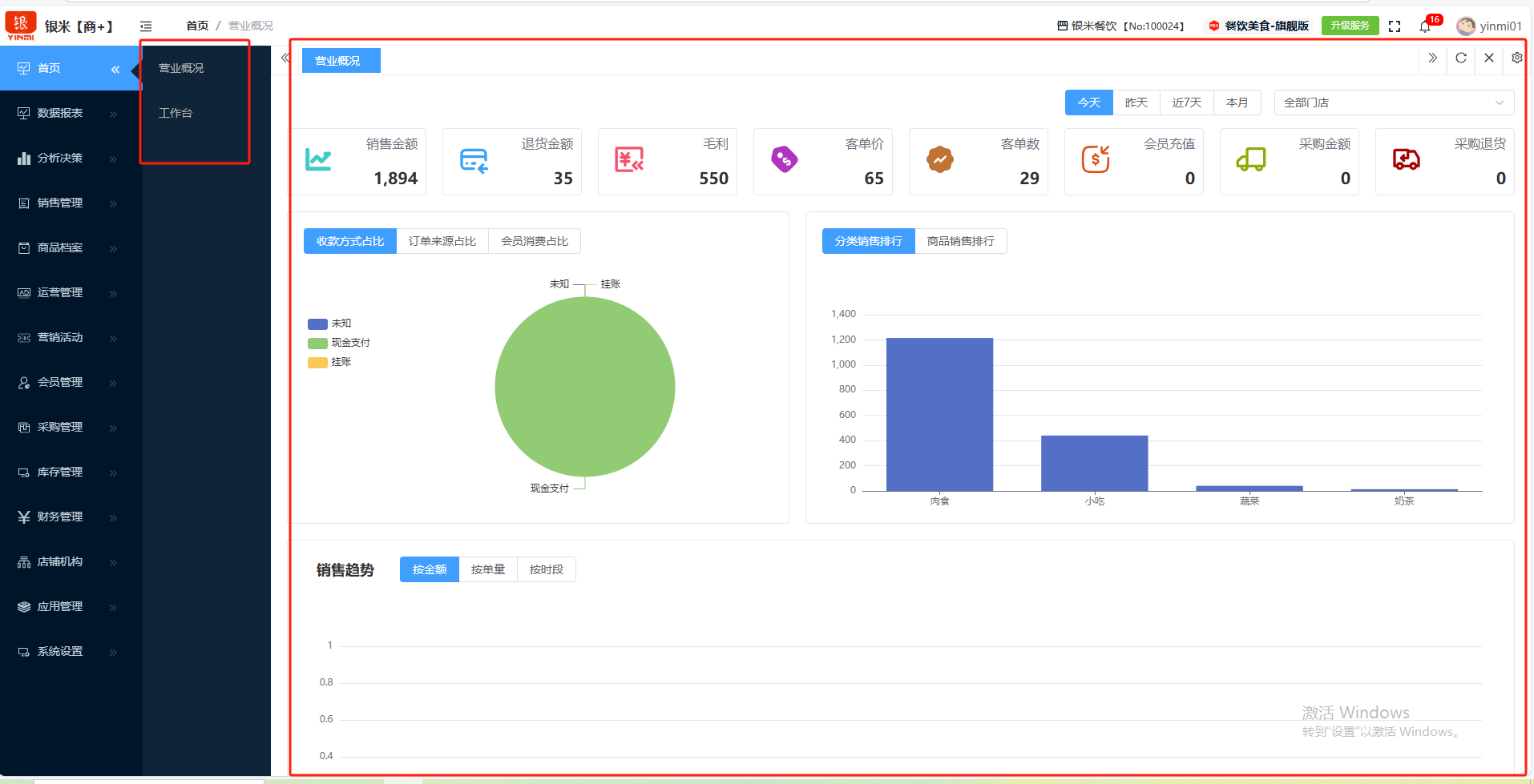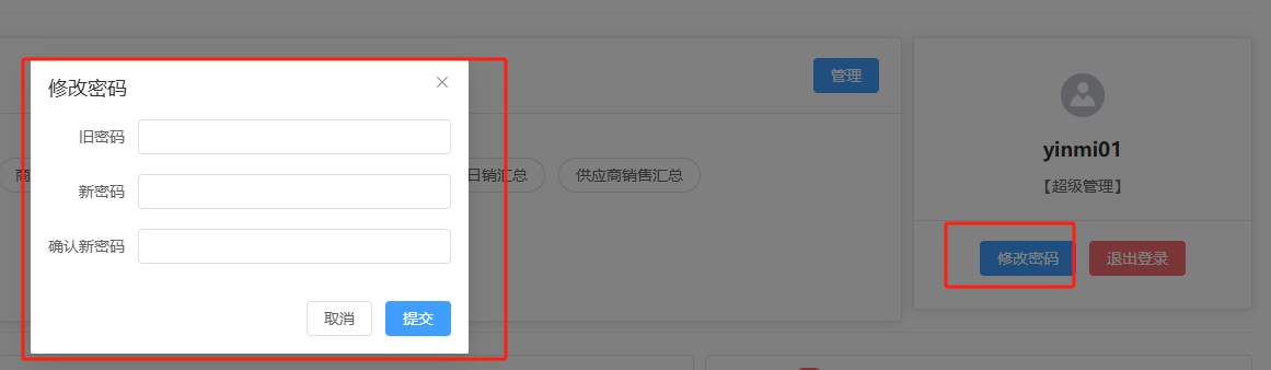 ### **后台首页** ”后台首页“是商户后台的综合页面。包含:营业概况、工作台、升级服务、消息中心、管理中心。 如图所示  一、营业概况是一份高度浓缩的经营快照,它通过汇总关键业绩指标,让管理者在最短时间内对生意的健康度、效率和趋势有一个全面且直观的认知。按时间:今天、昨天、进7天、本月。按门店:全部门店和单店。 如图所示  二、工作台是商户后台的信息综合平台。包含:快捷菜单、后台待办、出入库异常、待处理消息、平台公告。 如图所示  1、快捷菜单是商户自主设置最重要的信息查询平台。点击”管理“勾选所需要查询的栏目即可设置。 如图所示  2、后台待办是商户需要快速处理的待办事项。如图所示  3、出入库异常是销售的异常事件,点击”单据编号“即可查看具体详情。如图所示  4、待处理消息是门店需要处理的事项,点击”活动情况“即可查看具体详情。如图所示  5、平台公告是公司平台发布的各类公告,点击即可查看详情。如图所示  三、升级服务是平台通过技术迭代与服务优化,帮助商家提升运营效率、优化顾客体验、并创造新的增长点。 如图所示  四、消息中心是一个非常重要的信息枢纽。一个集中接收、处理和提醒各类系统消息与业务动态的功能模块,旨在让经营者和员工能够及时响应,确保店铺顺畅运营。如处理完毕,点击”标记已读“即可关闭该消息。 如图所示  五、管理中心是商户修改密码、退出登录的按钮。点击”修改密码“输入旧密码、新密码、确认新密码,提交即可。如要退出后台,点击”退出登录“即可。 如图所示