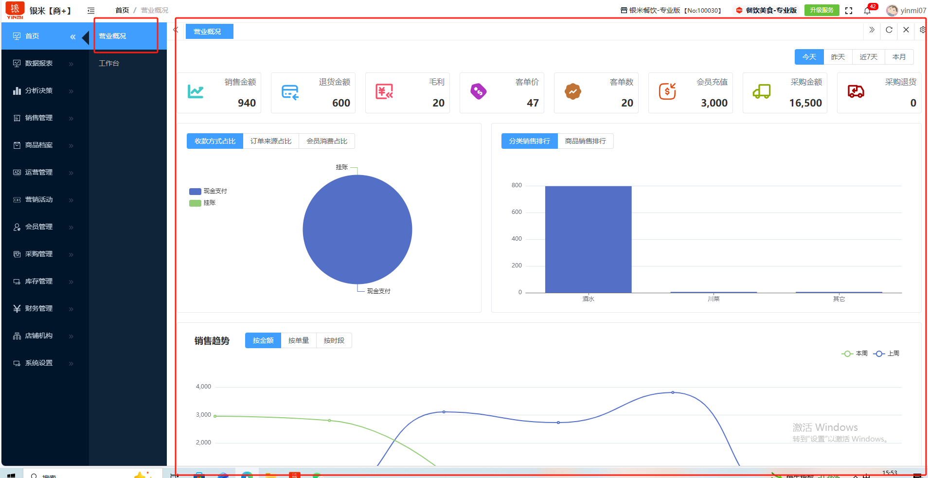 ### **后台首页** ”后台首页“是商户后台的综合页面。包含:营业概况、工作台、升级服务、消息中心、管理中心。 如图所示  一、营业概况是一份高度浓缩的经营快照,它通过汇总关键业绩指标,让管理者在最短时间内对生意的健康度、效率和趋势有一个全面且直观的认知。可查看:销售金额、退货金额、毛利、客单价、客单数、会员充值、采购金额、采购退货。按时间:今天、昨天、进7天、本月。 如图所示  二、工作台是商户后台的信息综合平台。包含:快捷菜单、后台待办、出入库异常、待处理消息、平台公告。 如图所示  1、快捷菜单是商户自主设置最重要的信息查询平台。点击”管理“勾选所需要查询的栏目即可设置。 如图所示  2、后台待办是商户需要快速处理的待办事项。如图所示  3、出入库异常是销售的异常事件,点击”单据编号“即可查看具体详情。如图所示  4、待处理消息是门店需要处理的事项,点击”活动情况“即可查看具体详情。如图所示  5、平台公告是公司平台发布的各类公告,点击即可查看详情。如图所示  三、升级服务是平台通过技术迭代与服务优化,帮助商家提升运营效率、优化顾客体验、并创造新的增长点。 如图所示  四、消息中心是一个非常重要的信息枢纽。一个集中接收、处理和提醒各类系统消息与业务动态的功能模块,旨在让经营者和员工能够及时响应,确保店铺顺畅运营。如处理完毕,点击”标记已读“即可关闭该消息。 如图所示  五、管理中心是商户修改密码、退出登录的按钮。点击”修改密码“输入旧密码、新密码、确认新密码,提交即可。如要退出后台,点击”退出登录“即可。 如图所示