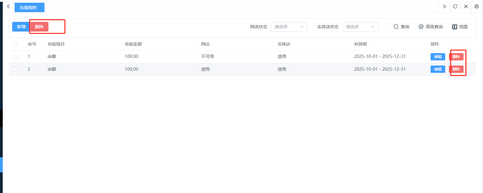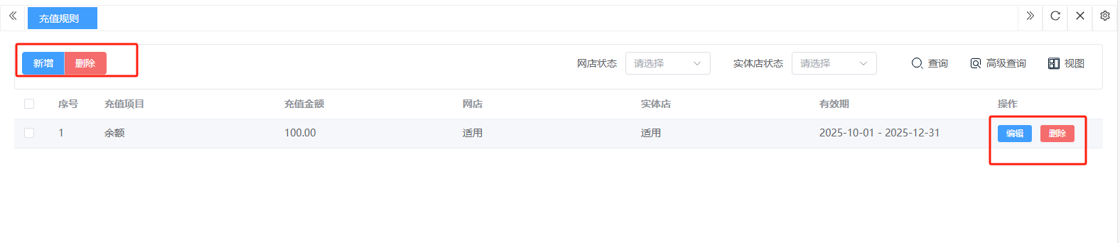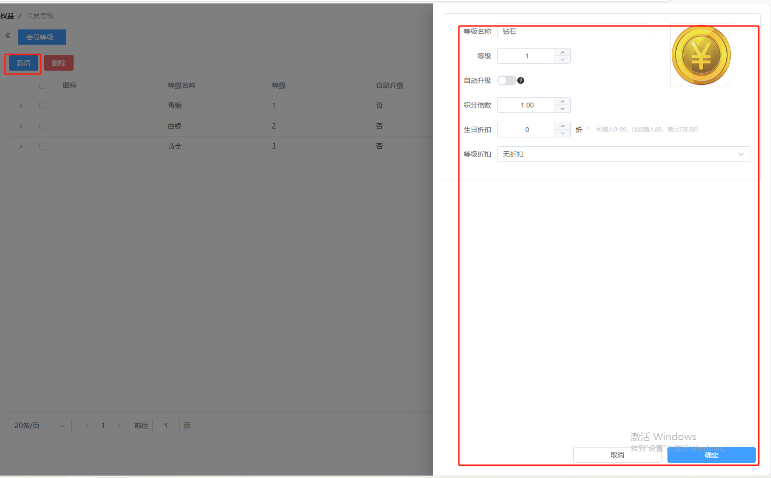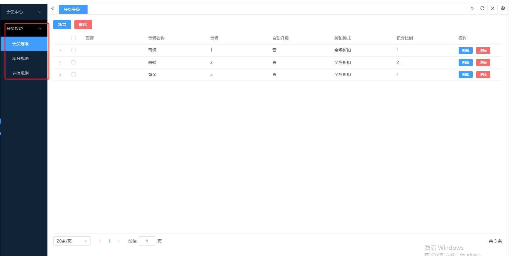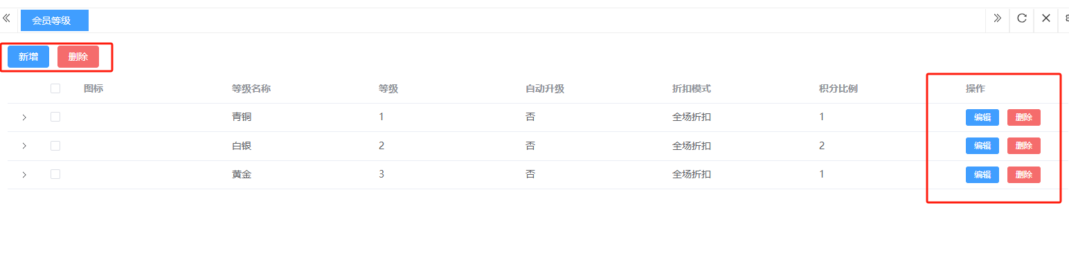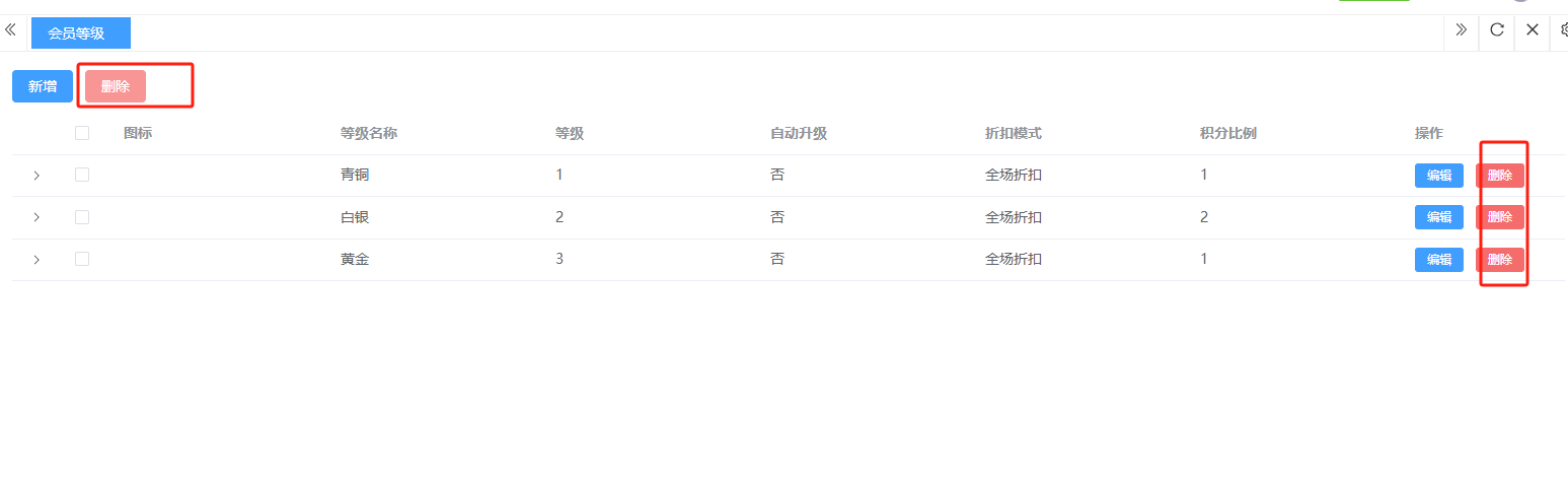## 会员权益 会员权益是通过提供专属折扣、消费积分、身份特权及储值福利等方式,提升客户忠诚度并刺激复购的体系。包含:会员等级、积分规则 、充值规则。 如图所示  一、会员等级是通过设定不同层级与对应权益,激励会员通过消费或行为积累升级,从而实现用户分层管理与价值最大化的体系。包含:图标、等级名称、等级、自动升级、折扣模式、积分比例。功能包含:新增、编辑、删除。 如图所示  1、点击“新增”、录入所有相关内容,点击“保存 ”即可完成新增。如图所示  A、录入等级名称。如图所示  B、设置会员等级。如图所示  C、设置积分倍数。如图所示  D、设置生日折扣。如图所示  E、选择“等级折扣”,无折扣:不享受任何折扣。如图所示  全场折扣:全场商品都享受该折扣。需要设置折扣比例。如图所示  分类折扣:分类商品享受该折扣。需要选择分类,设置折扣比例。如图所示  2、点击“编辑”可修改会员等级的所有内容,修改完成后点击“确定”即可完成。如图所示  3、点击”删除“,右侧为”行删除“,左上角为”列删除“。如图所示  二、积分规则是通过赋予会员行为相应积分值,并提供多样化积分兑换路径,从而激励会员持续参与、提升终身价值的量化管理体系。包含:积分增加规则、积分兑换规则。 如图所示  1、积分增加规则,设置累加规则金额,选择促销商品不积分、会员折扣,会员价不积分、积分抵扣金额不积分(可不选、单选或多选)。完成后点击”保存设置“即可生效。 如图所示  2、积分兑换规则,兑换方式设置是否启用状态。如图所示  比例模式设置,多少积分兑换1元。如图所示  抵扣上限设置。选择允许单笔订单金额抵扣最高比例(需要设置百分比)、单笔订单最多抵扣(需要设置多少积分)。必选1条即可完成。如图所示  选择计算规则,按可用比例计算或按整数倍计算。完成后点击”保存设置“即可设置成功。如图所示  三、充值规则是会员储值体系中的核心管理规范,旨在通过预设的储值方案与配套福利,激励会员预存资金,锁定长期消费关系。包含:充值项目、充值金额、网店、实体店、有效期。功能包含:新增、编辑、删除。  1、点击“新增”、录入所有相关内容,点击“确定”即可完成新增。如图所示  A、选择是否启用。如图所示  B、选择适用会员,选择”全部“即所有等级会员均可参加。如图所示  C、选择适用门店,选择”全部“即所有门店均可参加。如图所示  D、选择适用范围,网点、实体店。如图所示  E、选择充值项目。如图所示  F、设置充值金额。如图所示  G、选择赠送优惠劵。如图所示  H、选择赠送类型,余额(需要设置赠送金额)、积分(需要设置赠送积分)。如图所示  I、选择充值会员自动升级的等级。如图所示  J、设置起止的时间。如图所示  K、选择是否每个会员仅限使用一次。如图所示  2、点击“编辑”可修改充值规则的所有内容,修改完成后点击“确定”即可完成。如图所示  3、点击”删除“,右侧为”行删除“,左上角为”列删除“。如图所示