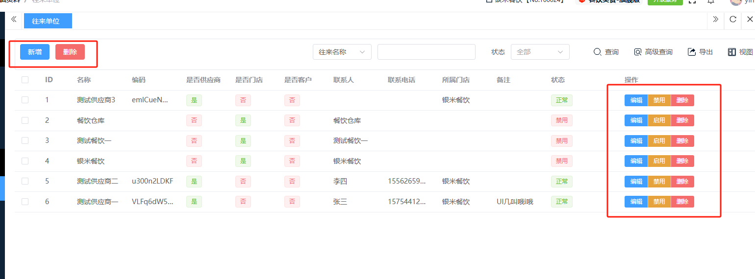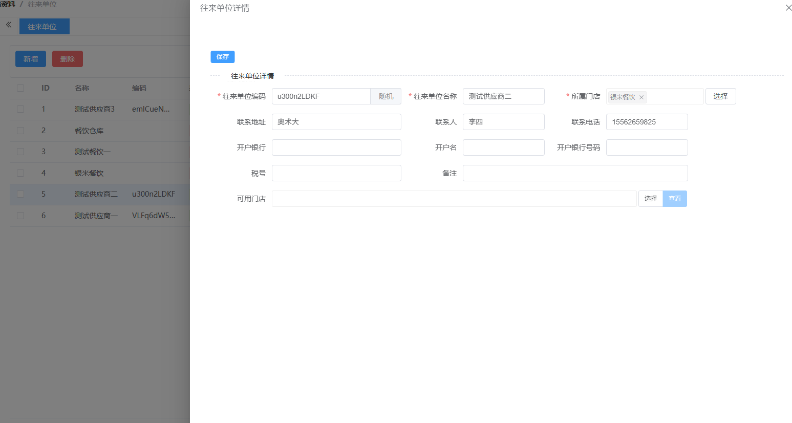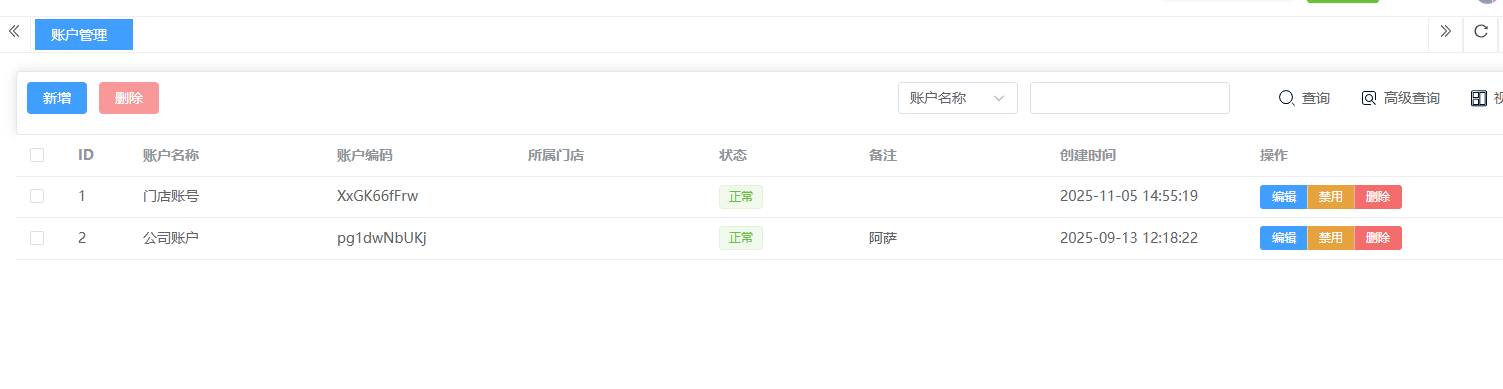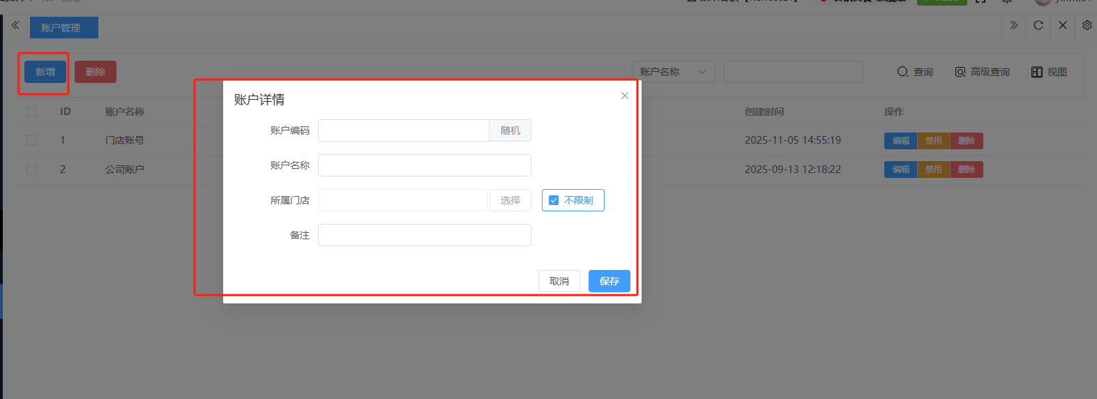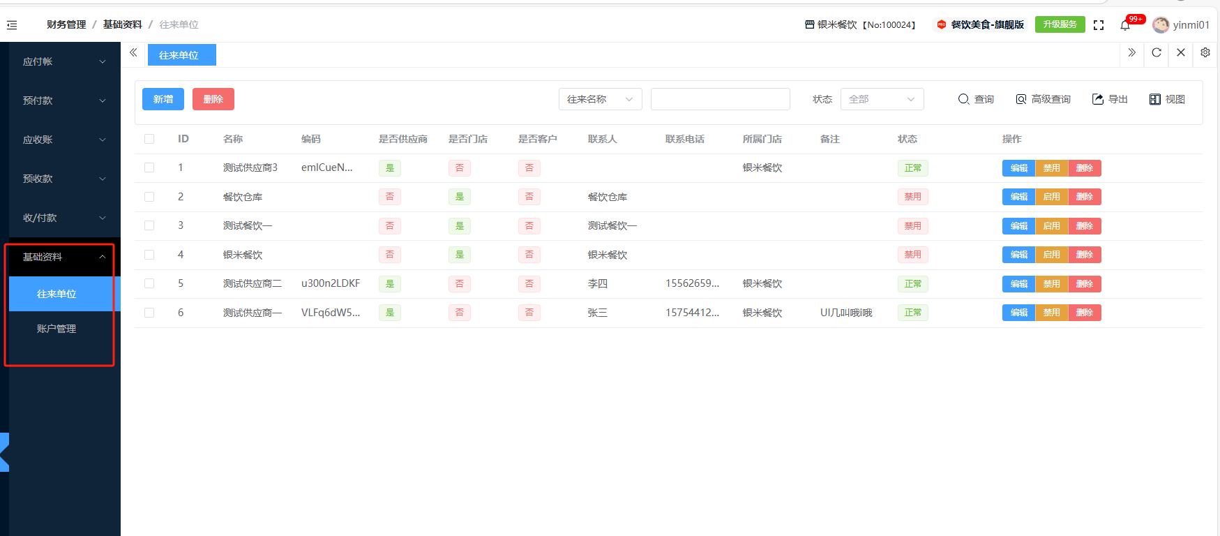 ## 基础资料 基础资料是财务管理系统中用于描述业务实体核心属性、支撑所有财务流程运行的标准化主数据。包含:往来单位、账户管理。 如图所示  一、往来单位是企业经营活动中,与企业发生业务往来(如采购、销售、收款、付款等)的外部组织或个人的统称,是基础资料的核心组成部分。包含:名称、编码、是否供应商等。功能包含:新增、编辑、禁用、删除。 如图所示  1、点击“新增”,录入往来单位的详情资料。点击“保存”即可完成新增。如图所示  2、点击“编辑”可修改往来单位的所有内容,修改完成后点击“保存”即可完成。如图所示  3、点击“禁用”可修改状态为“禁用”或者“启用”。如图所示  4、点击”删除“,右侧为”行删除“,左上角为”列删除“。如图所示  二、账户管理是企业对银行账户、内部核算账户及虚拟账户进行全生命周期管理的财务活动,涵盖开户、操作、监控到销户的全过程。包含:账户名称、账户编码、所属门店等。功能包含:新增、编辑、禁用、删除。 如图所示  1、点击“新增”,录入账户的详情资料。点击“保存”即可完成新增。如图所示  2、点击“编辑”可修改账户的所有内容,修改完成后点击“保存”即可完成。如图所示  3、点击“禁用”可修改状态为“禁用”或者“启用”。如图所示  4、点击”删除“,右侧为”行删除“,左上角为”列删除“。如图所示