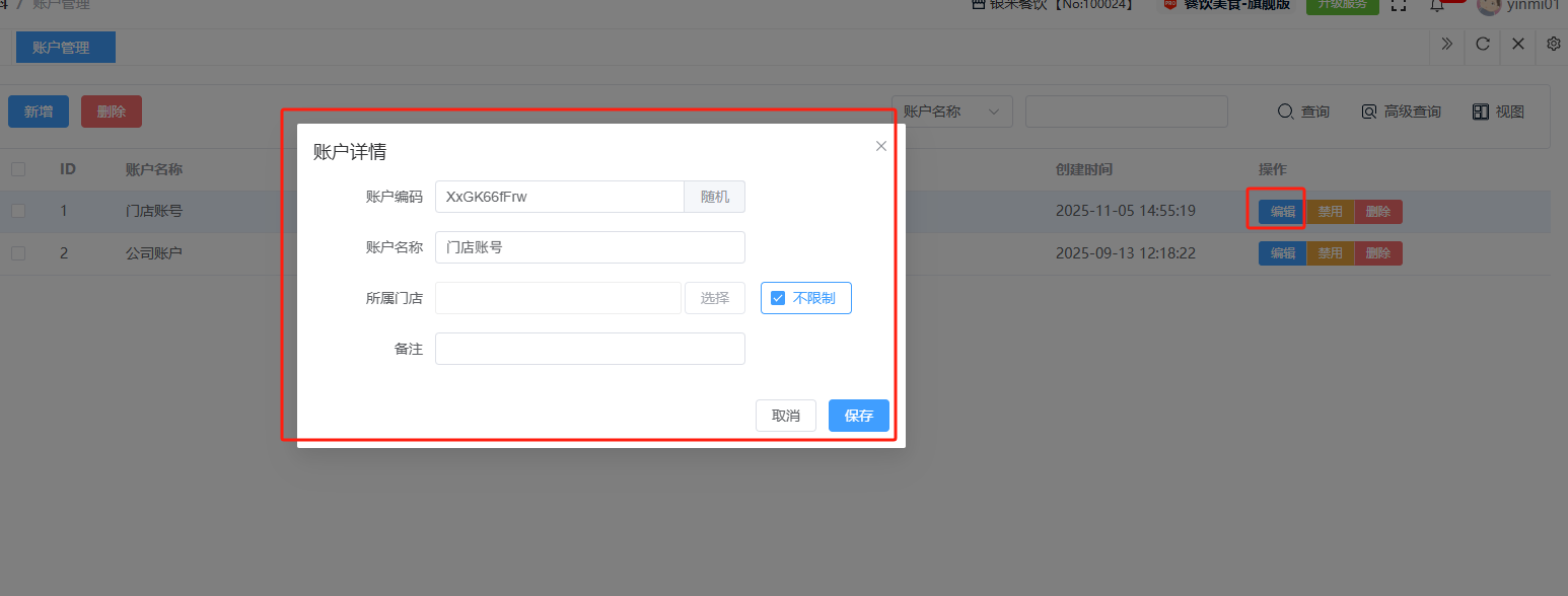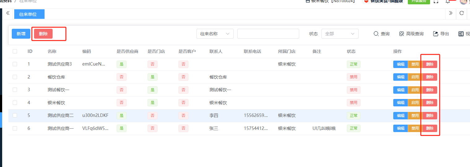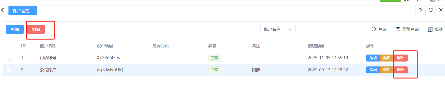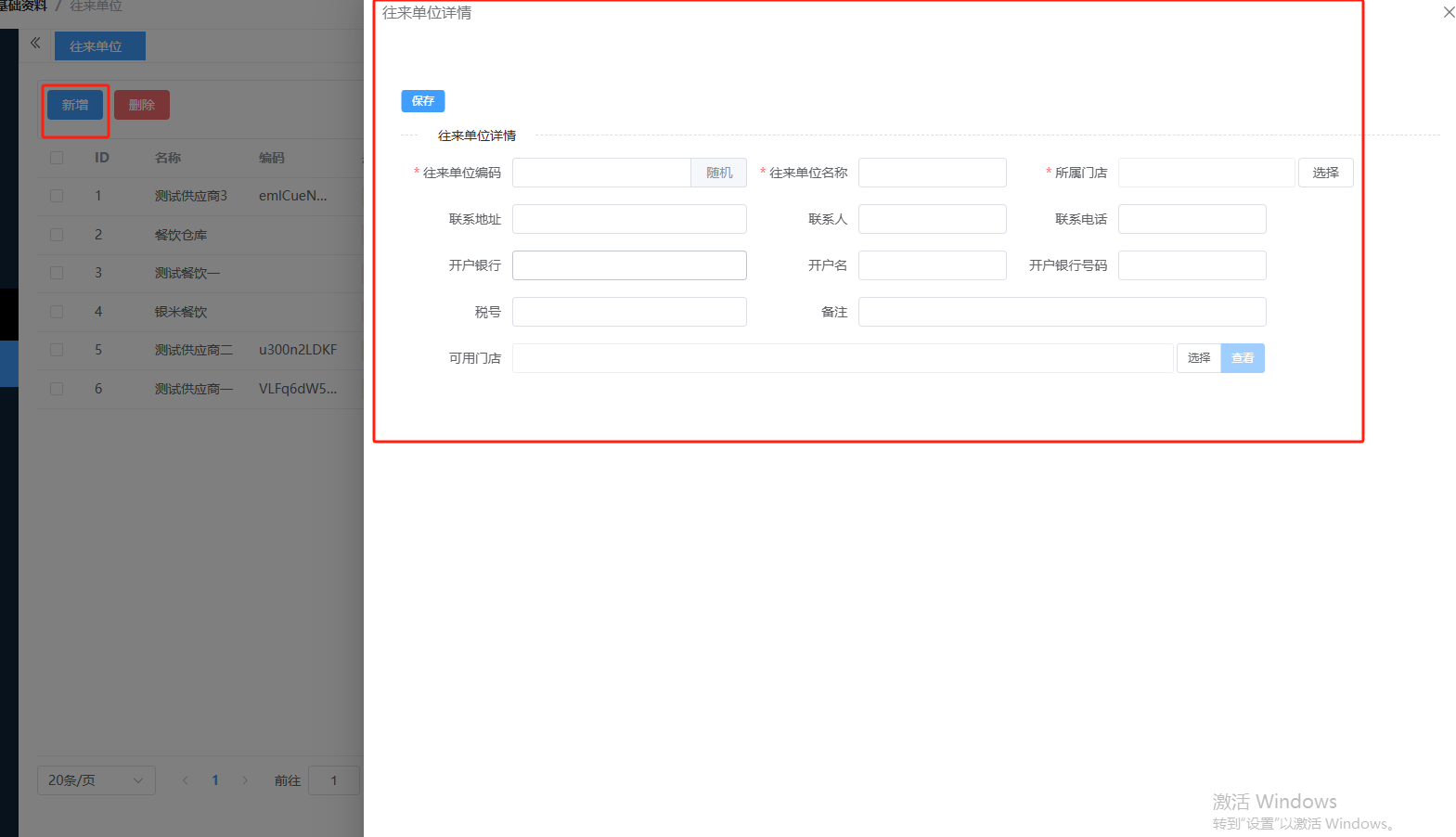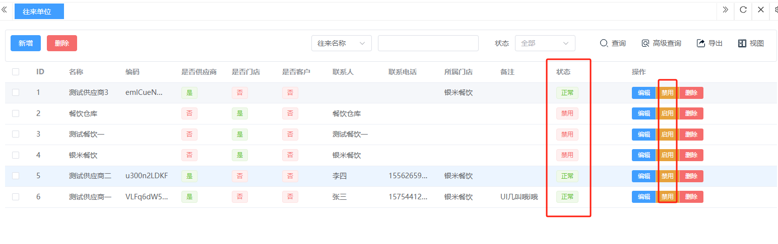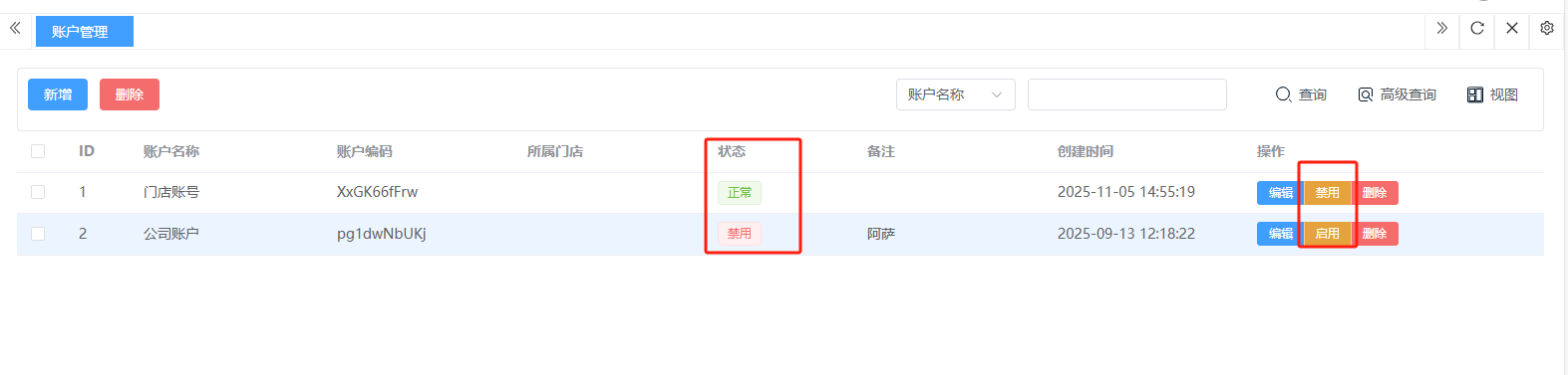 ## 基础资料 基础资料是财务管理系统中用于描述业务实体核心属性、支撑所有财务流程运行的标准化主数据。包含:往来单位、账户管理。 如图所示  一、往来单位是企业经营活动中,与企业发生业务往来(如采购、销售、收款、付款等)的外部组织或个人的统称,是基础资料的核心组成部分。包含:名称、编码、是否供应商等。功能包含:新增、编辑、禁用、删除。 如图所示  1、点击“新增”,录入往来单位的详情资料。点击“保存”即可完成新增。如图所示  2、点击“编辑”可修改往来单位的所有内容,修改完成后点击“保存”即可完成。如图所示  3、点击“禁用”可修改状态为“禁用”或者“启用”。如图所示  4、点击”删除“,右侧为”行删除“,左上角为”列删除“。如图所示  二、账户管理是企业对银行账户、内部核算账户及虚拟账户进行全生命周期管理的财务活动,涵盖开户、操作、监控到销户的全过程。包含:账户名称、账户编码、所属门店等。功能包含:新增、编辑、禁用、删除。 如图所示  1、点击“新增”,录入账户的详情资料。点击“保存”即可完成新增。如图所示  2、点击“编辑”可修改账户的所有内容,修改完成后点击“保存”即可完成。如图所示  3、点击“禁用”可修改状态为“禁用”或者“启用”。如图所示  4、点击”删除“,右侧为”行删除“,左上角为”列删除“。如图所示