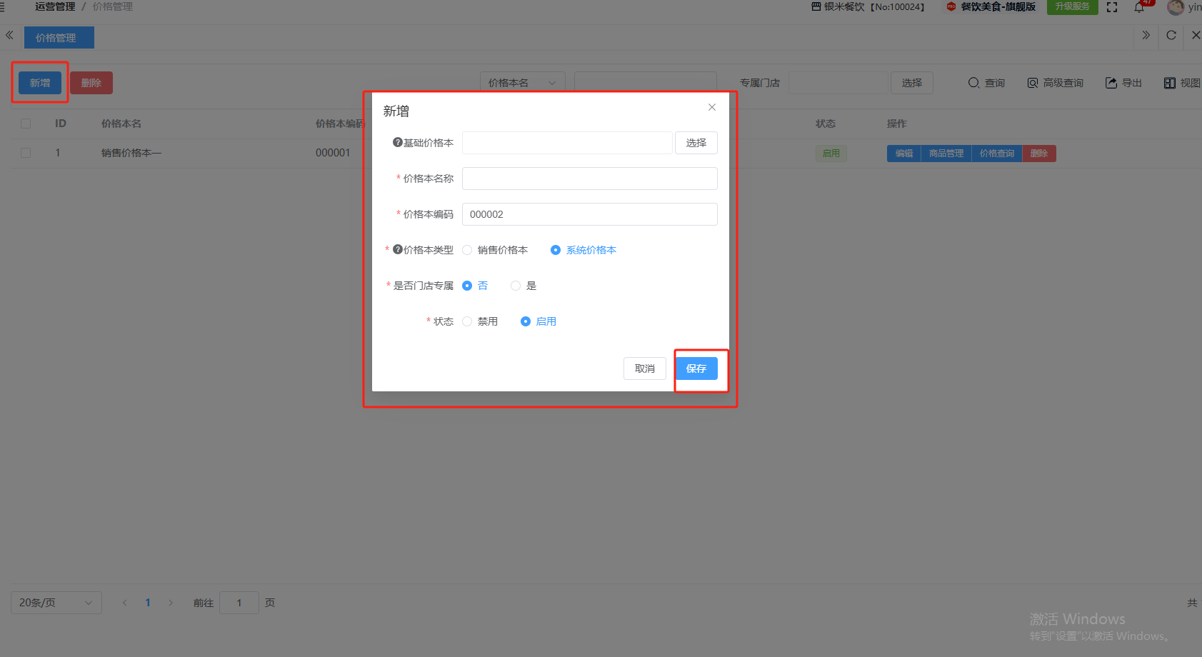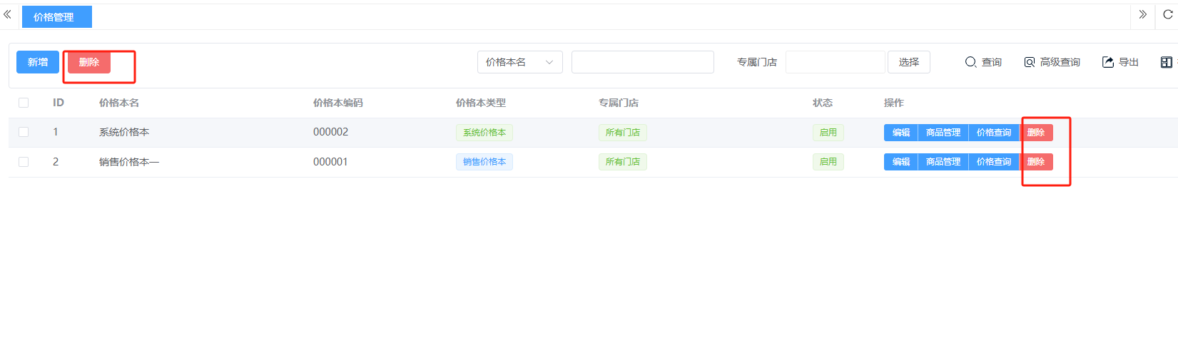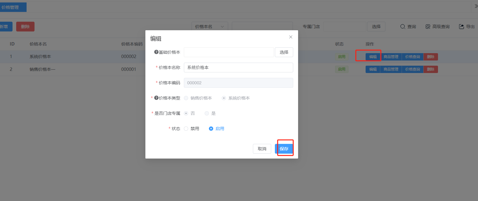 ## 价格管理 价格管理是企业对商品/服务的定价、调价、执行及监控进行系统性规划和控制的全过程,其核心目标是实现收入与利润最大化,同时维护品牌定位和市场竞争力。包含:价格本名、价格本编码、专属门店、状态、操作。功能包含:新增 、编辑、商品管理、价格查询、删除。 如图所示  一、点击“新增”录入相关内容后,点击“保存”即可完成新增价格本。如图所示  1、选择基础价格本(从某个价格本中继承商品价格数据,可继承的价格本选择范围受到当前【价格本类型】和【价格本门店专属】的影响)。如图所示  2、录入价格本的名称。如图所示  3、价格本编码为系统排序,如需设置,可以录入新编码。如图所示  4、选择价格本类型,销售价格本(主要用于门店商品定价,用于销售使用)、系统价格本(用于系统内部(如采购协议价,配销价)。如图所示  5、是否门店专属,选择“否”即所有门店都适用、选择“是”则需要选择专属门店。如图所示  6、选择状态,禁用或者启用。如图所示  二、点击“编辑”、可修改基础价格本、价格本名称、状态。完成修改后点击“保存”即可。 如图所示  三、点击“商品管理”即可进入商品管理页面。功能包含:新增、编辑、删除。如图所示  1、点击“新增“,即可新增商品。如图所示  2、点击”编辑“、可修改商品的价格、会员价、批发价。修改完成后点击”保存“即可。如图所示  3、点击”删除“,右侧为”行删除“,左上角为”列删除“。如图所示  四、点击”价格查询“、可进入该价格本查看所有商品的价格。如图所示  五、点击”删除“,右侧为”行删除“,左上角为”列删除“。如图所示