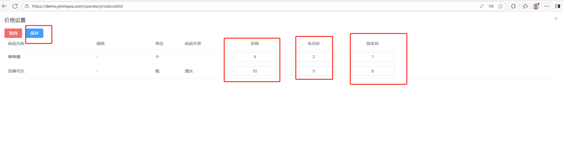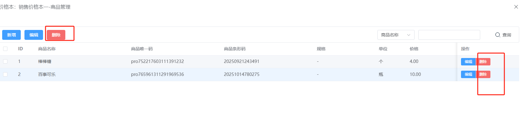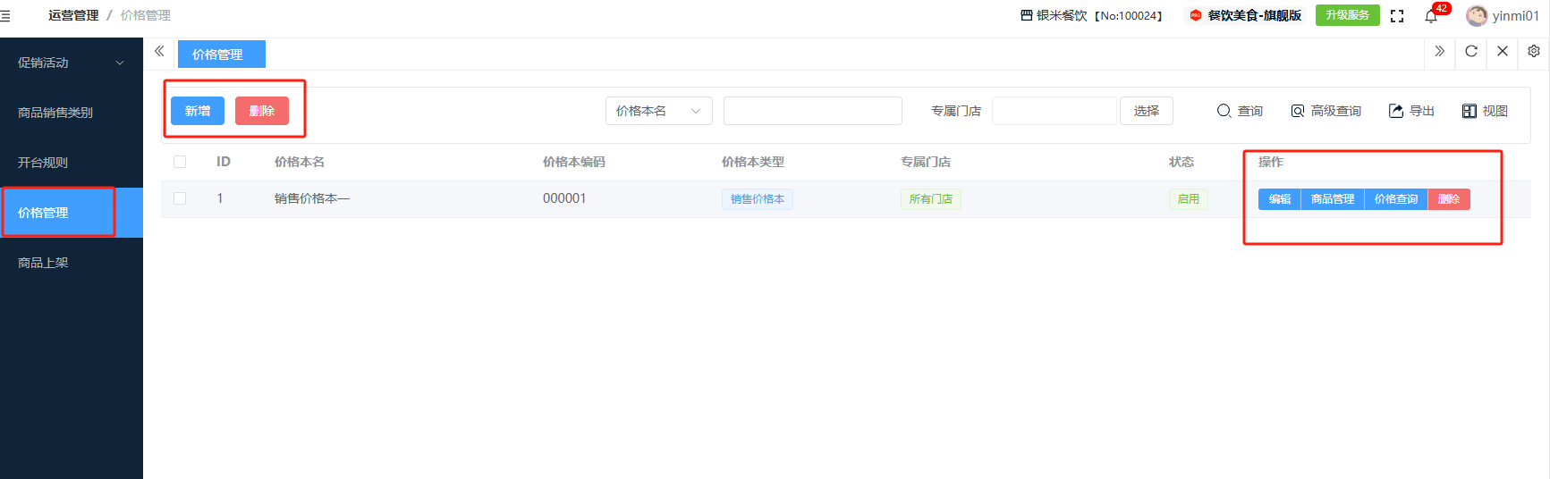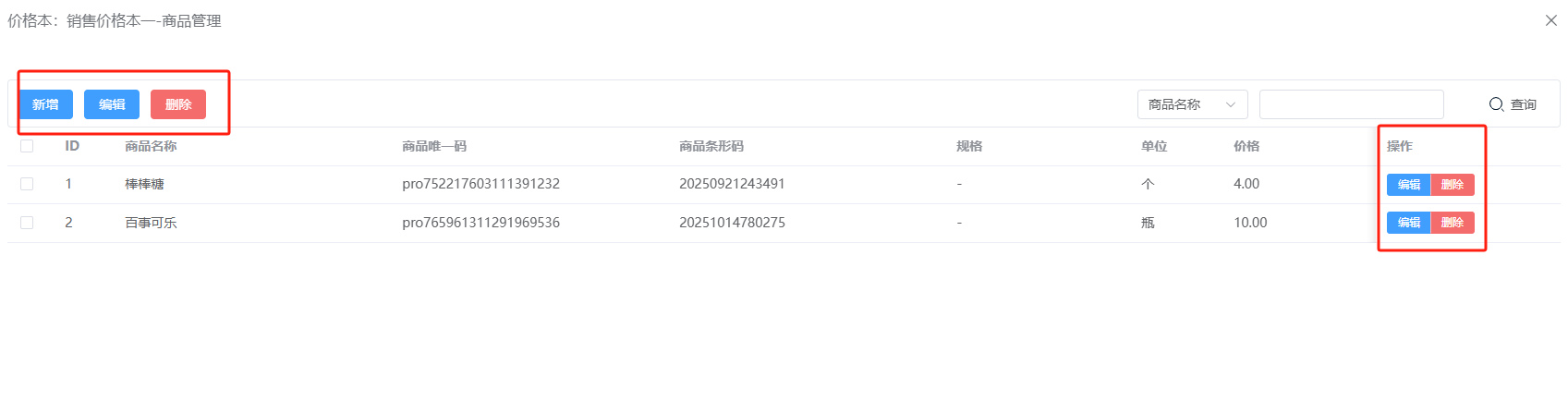 ## 价格管理 价格管理是企业对商品/服务的定价、调价、执行及监控进行系统性规划和控制的全过程,其核心目标是实现收入与利润最大化,同时维护品牌定位和市场竞争力。包含:价格本名、价格本编码、专属门店、状态、操作。功能包含:新增 、编辑、商品管理、价格查询、删除。 如图所示  一、点击“新增”录入相关内容后,点击“保存”即可完成新增价格本。如图所示  1、选择基础价格本(从某个价格本中继承商品价格数据,可继承的价格本选择范围受到当前【价格本类型】和【价格本门店专属】的影响)。如图所示  2、录入价格本的名称。如图所示  3、价格本编码为系统排序,如需设置,可以录入新编码。如图所示  4、选择价格本类型,销售价格本(主要用于门店商品定价,用于销售使用)、系统价格本(用于系统内部(如采购协议价,配销价)。如图所示  5、是否门店专属,选择“否”即所有门店都适用、选择“是”则需要选择专属门店。如图所示  6、选择状态,禁用或者启用。如图所示  二、点击“编辑”、可修改基础价格本、价格本名称、状态。完成修改后点击“保存”即可。 如图所示  三、点击“商品管理”即可进入商品管理页面。功能包含:新增、编辑、删除。如图所示  1、点击“新增“,即可新增商品。如图所示  2、点击”编辑“、可修改商品的价格、会员价、批发价。修改完成后点击”保存“即可。如图所示  3、点击”删除“,右侧为”行删除“,左上角为”列删除“。如图所示  四、点击”价格查询“、可进入该价格本查看所有商品的价格。如图所示  五、点击”删除“,右侧为”行删除“,左上角为”列删除“。如图所示