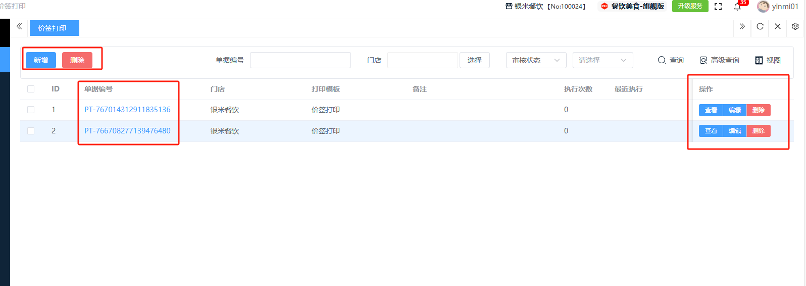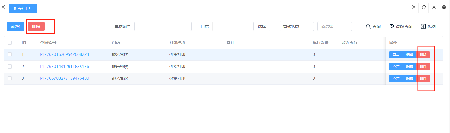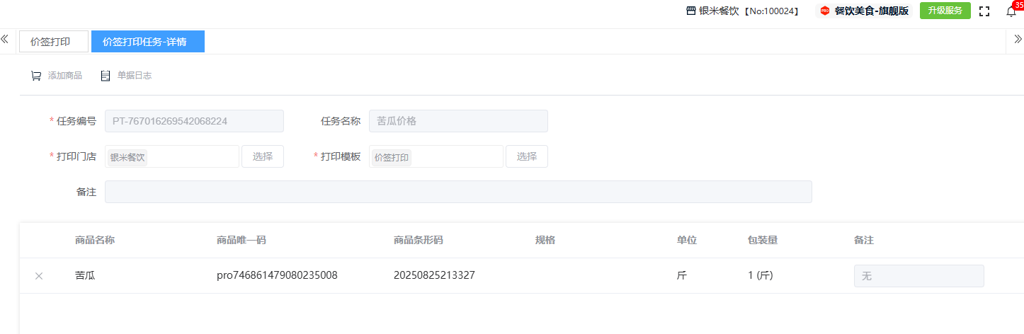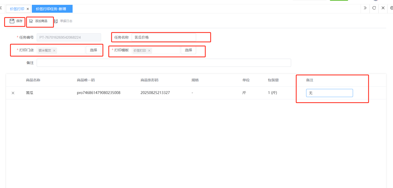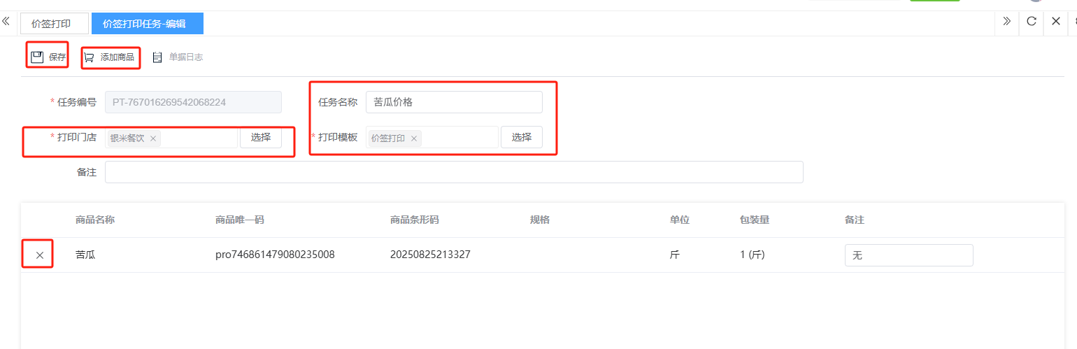 ## **价签打印** 价签打印是通过系统连接专用打印机,批量生成并输出统一、规范的商品价格标签的过程,其核心是确保线上线下价格一致、提升运营效率并维护价格形象。包含:单据编号、门店、打印模板、备注、执行次数、最近执行。功能包含:新增、查看、编辑、删除。 如图所示 1、点击“新增”,录入任务名称、选择打印门店、选择打印模板、点击“添加商品”添加商品、备注、确定后点击“保存”即可完成新增。 如图所示  2、点击“查看”或“单据编号”即可查看打印任务详情。如图所示  3、点击“编辑”,可修改任务名称、打印门店、打印模板、点击“添加商品”添加商品、备注、确定后点击“保存”即可完成编辑。  4、点击”删除“,右侧为”行删除“,左上角为”列删除“。如图所示