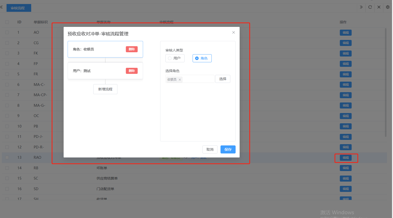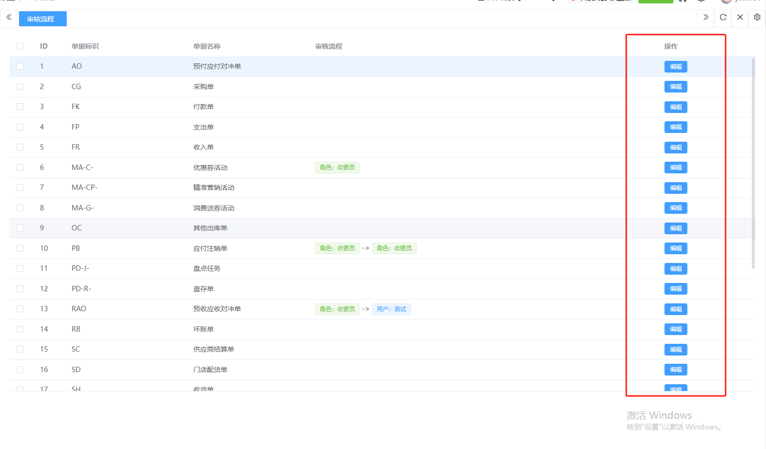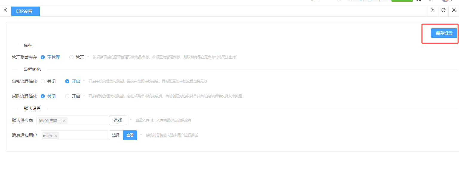 ## 其它设置 其它设置是系统参数配置中的补充模块,用于管理未归入主要分类但影响系统运行的特殊参数和边缘功能。包含:短信设置、ERP设置、审核流程。  一、短信设置是系统用于配置短信通知规则和接口参数的功能模块,实现业务场景的自动消息触达与营销沟通。包含:短信接口、短信模板 。 如图所示  二、ERP设置是企业资源规划系统的核心配置中枢,用于统一制定业务规则、集成流程和数据标准,确保各模块协同运作。按照内容设置完成后,点击”保存设置“即可完成。 如图所示  1、管理联营库存,选择不管理(不计库存)、管理(无库存时不能出库)。如图所示  2、流程简化,选择审核流程简化(开启或关闭)、采购流程简化(开启或关闭)。如图所示  3、默认设置,选择默认供应商、选择消息通知用户。如图所示  三、审核流程是企业针对关键业务操作建立的多层级审批机制,通过预设规则实现权责分离与风险管控。包含:单据标识、单据名称、审核流程。功能包含:编辑。 如图所示  1、点击“编辑”,可设置单据的审核流程。选择审核人类型,选择角色,设置完成后点击“保存”即可。如图所示