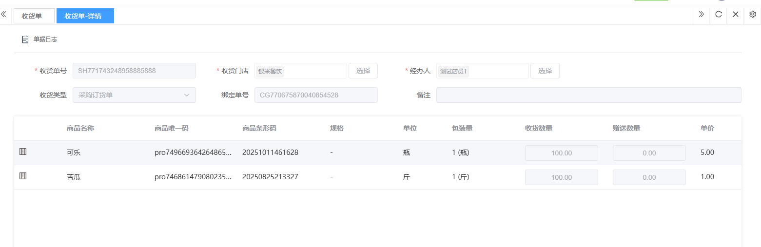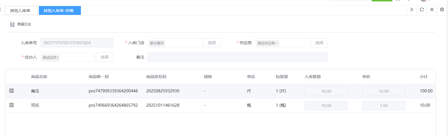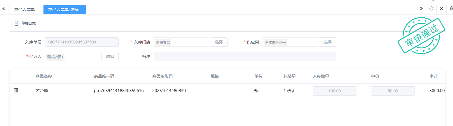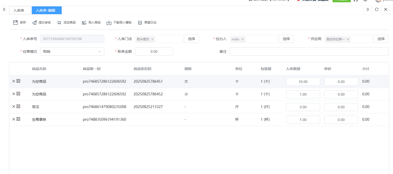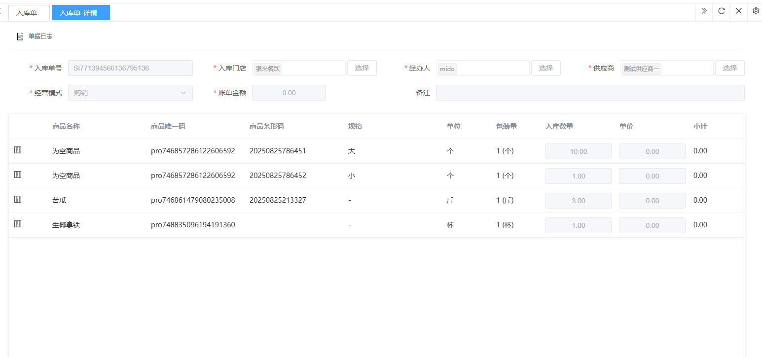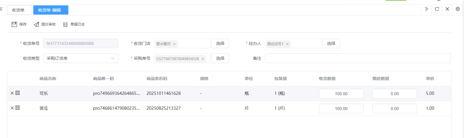 ## 入库 入库是商品、物料或资产到达仓库后,经过验收、清点、交接等流程,正式进入仓库存储区域的全过程。包含:收货单、入库单、其他入库单。 如图所示  一、收货单是仓库在收到货物时,用于记录实际到货信息、确认货物交接的原始凭证。包含:单据编号、收货方、收货门店、收货类型等。功能包含:新增、查看、编辑、审核、删除、明细。 如图所示  1、点击“新增”、录入所有相关内容,点击“保存 ”即可完成新增。如图所示  A、选择收货门店、经办人。如图所示  B、选择收货类型自动,填入单号后自动识别单号。如图所示  选择采购订货单、选择采购单号。如图所示  选择门店配货单、选择配货单号。如图所示  选择门店退货出库单、选择退货出库单号。如图所示  C、选择收货单据后,录入收货数量和赠送数量,点击“保存”即可。如图所示  D、点击“X”可删除商品。点击“⚅”可拆分商品。如图所示  E、点击“⚅”可进入拆分页面。包含:收货数量和赠送数量。点击新增即可新增商品录入,数量 、生产日期、批号,点击“确认”即可完成。如图所示  2、点击“查看”或者“单据编号”可查看收货单的详情。如图所示  3、点击“编辑”可修改收货单的所有内容,修改完成后点击“保存”即可完成,然后点击”提交审核“。如图所示  4、点击“审核“,选择”通过“或者”拒绝“,即可完成审核。如图所示  5、点击”删除“,右侧为”行删除“,左上角为”列删除“。如图所示  6、点击“明细”,便于查看商品的收货明细。如图所示  二、入库单是货物通过验收后,由仓库开具的、用于正式记录商品入库信息并更新库存账目的核心凭证。包含:单据编号、入库门店、供应商、销售模式等。功能包含:新增、查看、编辑、审核、删除、明细。 如图所示  1、点击“新增”、录入所有相关内容,点击“保存 ”即可完成新增。如图所示  A、选择入库门店、经办人、供应商。如图所示  B、选择经营模式购销(公司自主采购)、代销(公司代理销售 )、联营(公司和供应商联营)。如图所示  C、点击“添加商品”,选择入库商品,需要输入入库数量和单价。点击“X”可删除商品。点击“⚅”可拆分商品。 如图所示 2、点击“查看”或者“单据编号”可查看入库单的详情。如图所示  3、点击“编辑”可修改入库单的所有内容,修改完成后点击“保存”即可完成,然后点击”提交审核“。如图所示  4、点击“审核“,选择”通过“或者”拒绝“,即可完成审核。如图所示  5、点击”删除“,右侧为”行删除“,左上角为”列删除“。如图所示  6、点击“明细”,便于查看商品的入库明细。如图所示  三、其他入库单用于记录非标准采购或生产入库以外的其他形式库存增加业务,是确保所有库存变动均有迹可循的关键管理工具。包含:单据编号、入库门店、供应商、销售模式等。功能包含:新增、查看、编辑、审核、删除、明细。 如图所示  1、点击“新增”、录入所有相关内容,点击“保存 ”即可完成新增。如图所示  A、选择入库门店、经办人、供应商、备注。如图所示  B、点击“添加商品”,选择入库商品,需要输入入库数量和单价。点击“X”可删除商品。点击“⚅”可拆分商品。 如图所示  2、点击“查看”或者“单据编号”可查看其他入库单的详情。如图所示  3、点击“编辑”可修改其他入库单的所有内容,修改完成后点击“保存”即可完成,然后点击”提交审核“。如图所示  4、点击“审核“,选择”通过“或者”拒绝“,即可完成审核。如图所示  5、点击”删除“,右侧为”行删除“,左上角为”列删除“。如图所示  6、点击“明细”,便于查看商品的入库明细。如图所示