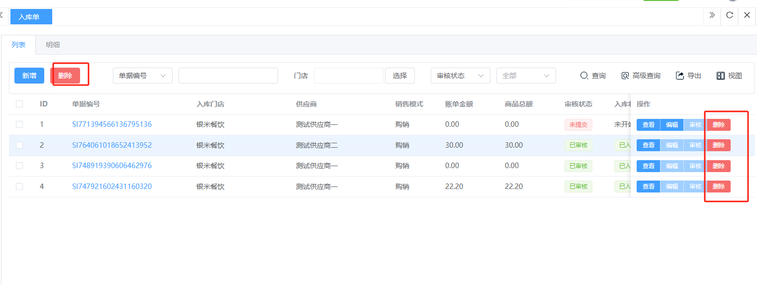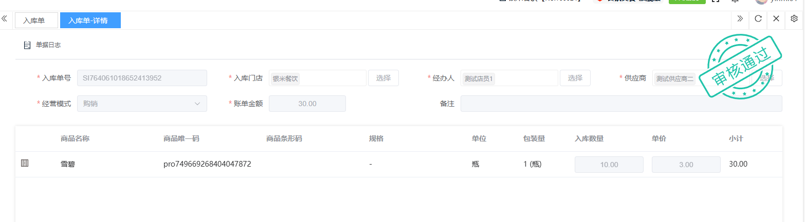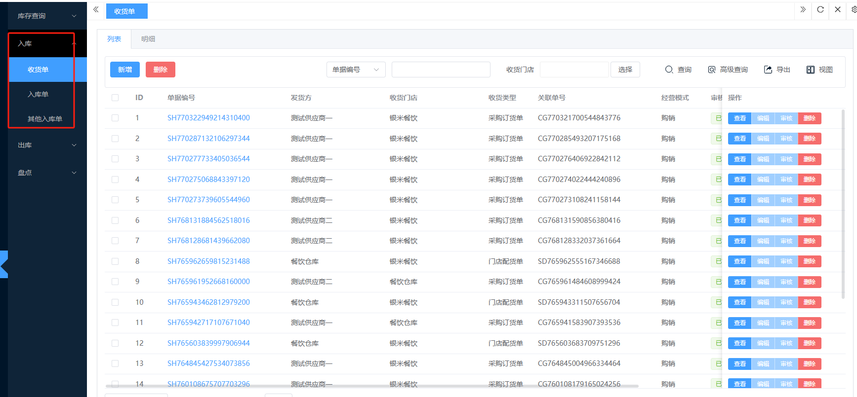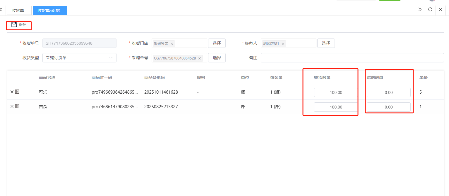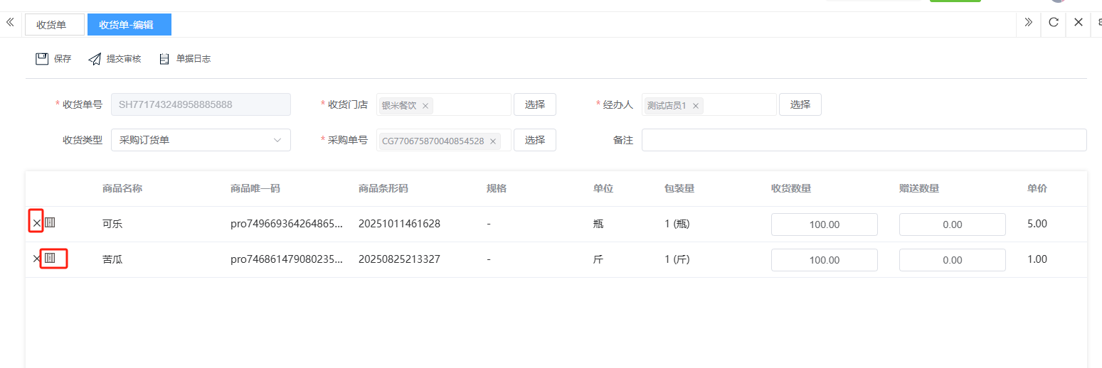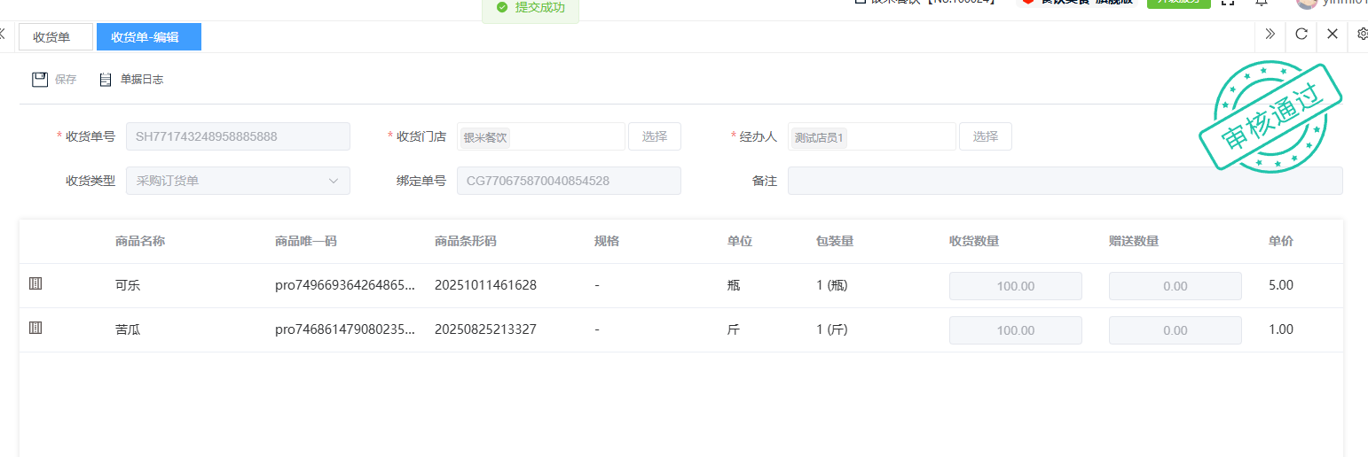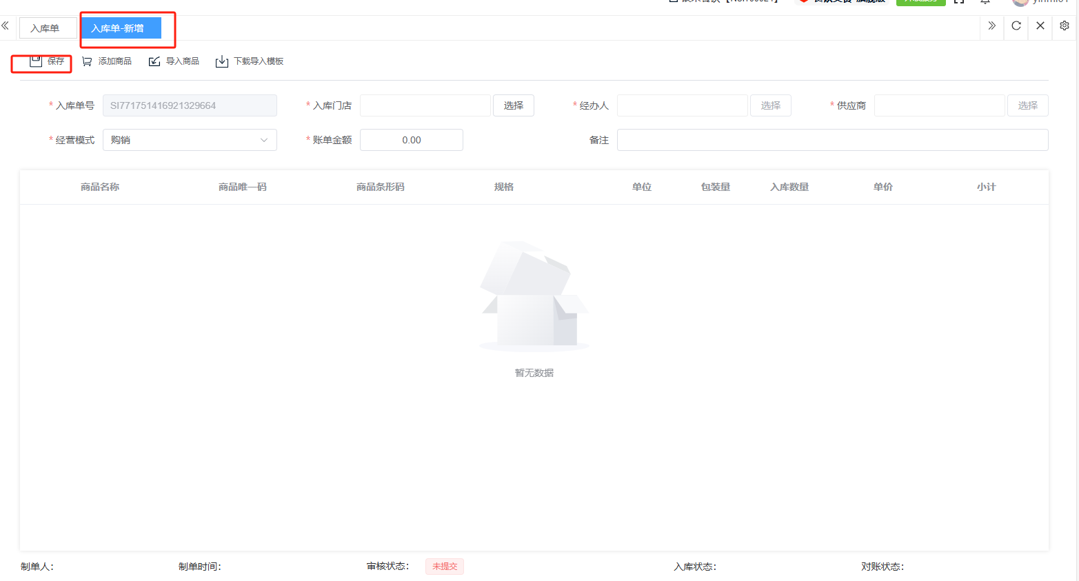 ## 入库 入库是商品、物料或资产到达仓库后,经过验收、清点、交接等流程,正式进入仓库存储区域的全过程。包含:收货单、入库单、其他入库单。 如图所示  一、收货单是仓库在收到货物时,用于记录实际到货信息、确认货物交接的原始凭证。包含:单据编号、收货方、收货门店、收货类型等。功能包含:新增、查看、编辑、审核、删除、明细。 如图所示  1、点击“新增”、录入所有相关内容,点击“保存 ”即可完成新增。如图所示  A、选择收货门店、经办人。如图所示  B、选择收货类型自动,填入单号后自动识别单号。如图所示  选择采购订货单、选择采购单号。如图所示  选择门店配货单、选择配货单号。如图所示  选择门店退货出库单、选择退货出库单号。如图所示  C、选择收货单据后,录入收货数量和赠送数量,点击“保存”即可。如图所示  D、点击“X”可删除商品。点击“⚅”可拆分商品。如图所示  E、点击“⚅”可进入拆分页面。包含:收货数量和赠送数量。点击新增即可新增商品录入,数量 、生产日期、批号,点击“确认”即可完成。如图所示  2、点击“查看”或者“单据编号”可查看收货单的详情。如图所示  3、点击“编辑”可修改收货单的所有内容,修改完成后点击“保存”即可完成,然后点击”提交审核“。如图所示  4、点击“审核“,选择”通过“或者”拒绝“,即可完成审核。如图所示  5、点击”删除“,右侧为”行删除“,左上角为”列删除“。如图所示  6、点击“明细”,便于查看商品的收货明细。如图所示  二、入库单是货物通过验收后,由仓库开具的、用于正式记录商品入库信息并更新库存账目的核心凭证。包含:单据编号、入库门店、供应商、销售模式等。功能包含:新增、查看、编辑、审核、删除、明细。 如图所示  1、点击“新增”、录入所有相关内容,点击“保存 ”即可完成新增。如图所示  A、选择入库门店、经办人、供应商。如图所示  B、选择经营模式购销(公司自主采购)、代销(公司代理销售 )、联营(公司和供应商联营)。如图所示  C、点击“添加商品”,选择入库商品,需要输入入库数量和单价。点击“X”可删除商品。点击“⚅”可拆分商品。 如图所示 2、点击“查看”或者“单据编号”可查看入库单的详情。如图所示  3、点击“编辑”可修改入库单的所有内容,修改完成后点击“保存”即可完成,然后点击”提交审核“。如图所示  4、点击“审核“,选择”通过“或者”拒绝“,即可完成审核。如图所示  5、点击”删除“,右侧为”行删除“,左上角为”列删除“。如图所示  6、点击“明细”,便于查看商品的入库明细。如图所示  三、其他入库单用于记录非标准采购或生产入库以外的其他形式库存增加业务,是确保所有库存变动均有迹可循的关键管理工具。包含:单据编号、入库门店、供应商、销售模式等。功能包含:新增、查看、编辑、审核、删除、明细。 如图所示  1、点击“新增”、录入所有相关内容,点击“保存 ”即可完成新增。如图所示  A、选择入库门店、经办人、供应商、备注。如图所示  B、点击“添加商品”,选择入库商品,需要输入入库数量和单价。点击“X”可删除商品。点击“⚅”可拆分商品。 如图所示  2、点击“查看”或者“单据编号”可查看其他入库单的详情。如图所示  3、点击“编辑”可修改其他入库单的所有内容,修改完成后点击“保存”即可完成,然后点击”提交审核“。如图所示  4、点击“审核“,选择”通过“或者”拒绝“,即可完成审核。如图所示  5、点击”删除“,右侧为”行删除“,左上角为”列删除“。如图所示  6、点击“明细”,便于查看商品的入库明细。如图所示