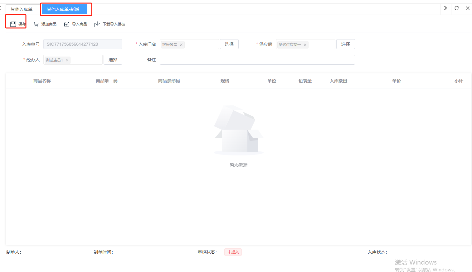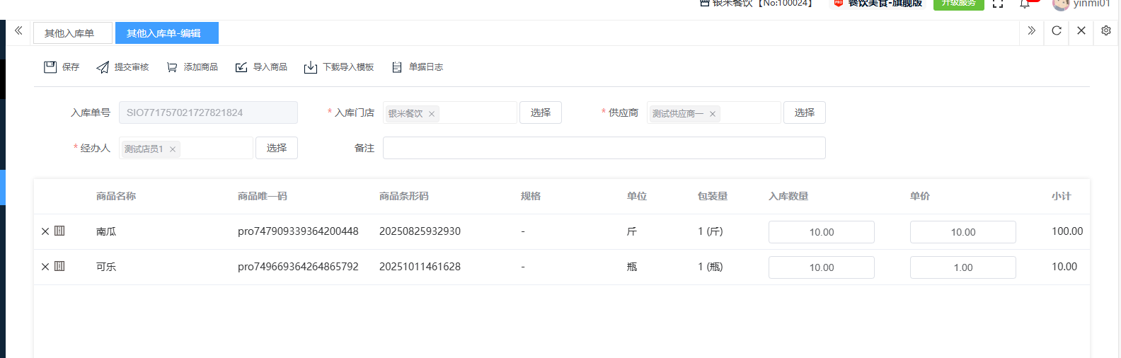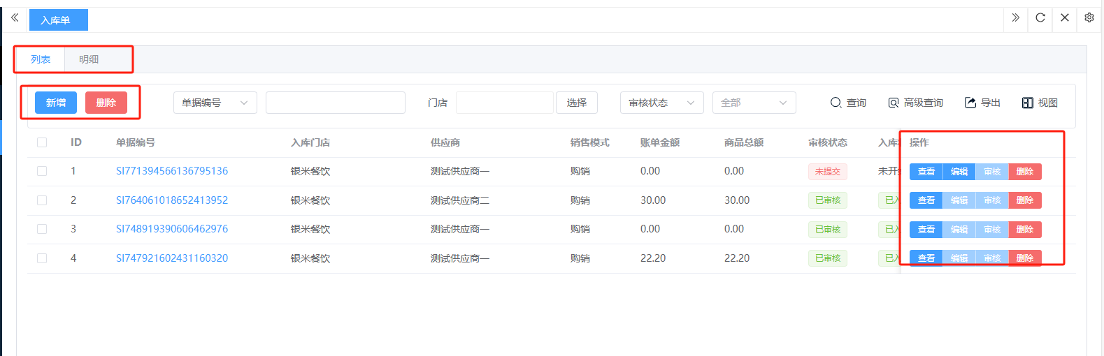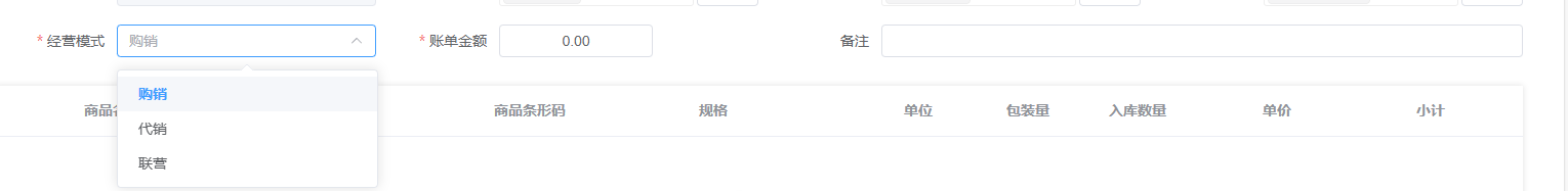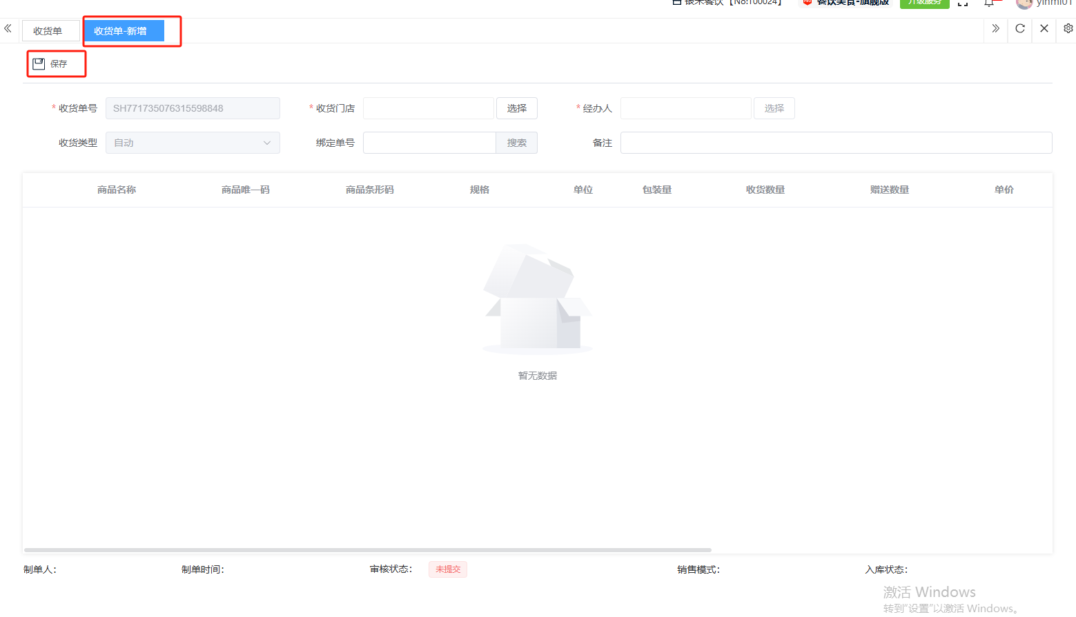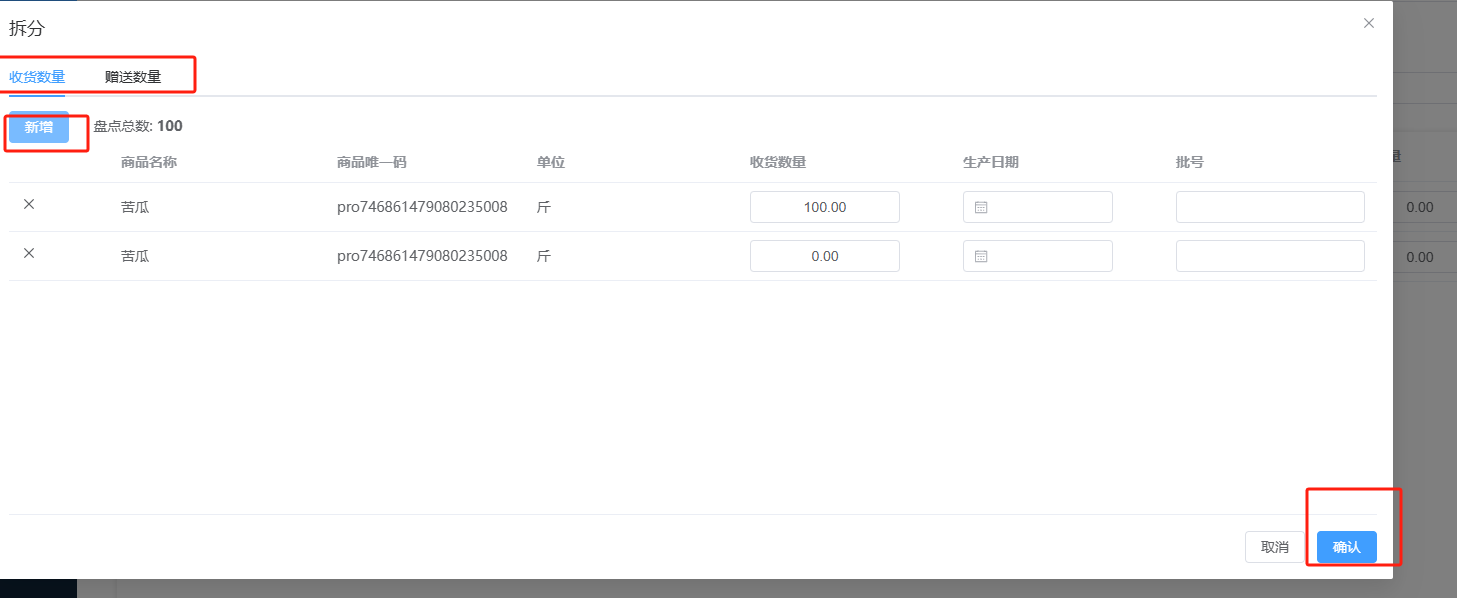 ## 入库 入库是商品、物料或资产到达仓库后,经过验收、清点、交接等流程,正式进入仓库存储区域的全过程。包含:收货单、入库单、其他入库单。 如图所示  一、收货单是仓库在收到货物时,用于记录实际到货信息、确认货物交接的原始凭证。包含:单据编号、收货方、收货门店、收货类型等。功能包含:新增、查看、编辑、审核、删除、明细。 如图所示  1、点击“新增”、录入所有相关内容,点击“保存 ”即可完成新增。如图所示  A、选择收货门店、经办人。如图所示  B、选择收货类型自动,填入单号后自动识别单号。如图所示  选择采购订货单、选择采购单号。如图所示  选择门店配货单、选择配货单号。如图所示  选择门店退货出库单、选择退货出库单号。如图所示  C、选择收货单据后,录入收货数量和赠送数量,点击“保存”即可。如图所示  D、点击“X”可删除商品。点击“⚅”可拆分商品。如图所示  E、点击“⚅”可进入拆分页面。包含:收货数量和赠送数量。点击新增即可新增商品录入,数量 、生产日期、批号,点击“确认”即可完成。如图所示  2、点击“查看”或者“单据编号”可查看收货单的详情。如图所示  3、点击“编辑”可修改收货单的所有内容,修改完成后点击“保存”即可完成,然后点击”提交审核“。如图所示  4、点击“审核“,选择”通过“或者”拒绝“,即可完成审核。如图所示  5、点击”删除“,右侧为”行删除“,左上角为”列删除“。如图所示  6、点击“明细”,便于查看商品的收货明细。如图所示  二、入库单是货物通过验收后,由仓库开具的、用于正式记录商品入库信息并更新库存账目的核心凭证。包含:单据编号、入库门店、供应商、销售模式等。功能包含:新增、查看、编辑、审核、删除、明细。 如图所示  1、点击“新增”、录入所有相关内容,点击“保存 ”即可完成新增。如图所示  A、选择入库门店、经办人、供应商。如图所示  B、选择经营模式购销(公司自主采购)、代销(公司代理销售 )、联营(公司和供应商联营)。如图所示  C、点击“添加商品”,选择入库商品,需要输入入库数量和单价。点击“X”可删除商品。点击“⚅”可拆分商品。 如图所示 2、点击“查看”或者“单据编号”可查看入库单的详情。如图所示  3、点击“编辑”可修改入库单的所有内容,修改完成后点击“保存”即可完成,然后点击”提交审核“。如图所示  4、点击“审核“,选择”通过“或者”拒绝“,即可完成审核。如图所示  5、点击”删除“,右侧为”行删除“,左上角为”列删除“。如图所示  6、点击“明细”,便于查看商品的入库明细。如图所示  三、其他入库单用于记录非标准采购或生产入库以外的其他形式库存增加业务,是确保所有库存变动均有迹可循的关键管理工具。包含:单据编号、入库门店、供应商、销售模式等。功能包含:新增、查看、编辑、审核、删除、明细。 如图所示  1、点击“新增”、录入所有相关内容,点击“保存 ”即可完成新增。如图所示  A、选择入库门店、经办人、供应商、备注。如图所示  B、点击“添加商品”,选择入库商品,需要输入入库数量和单价。点击“X”可删除商品。点击“⚅”可拆分商品。 如图所示  2、点击“查看”或者“单据编号”可查看其他入库单的详情。如图所示  3、点击“编辑”可修改其他入库单的所有内容,修改完成后点击“保存”即可完成,然后点击”提交审核“。如图所示  4、点击“审核“,选择”通过“或者”拒绝“,即可完成审核。如图所示  5、点击”删除“,右侧为”行删除“,左上角为”列删除“。如图所示  6、点击“明细”,便于查看商品的入库明细。如图所示