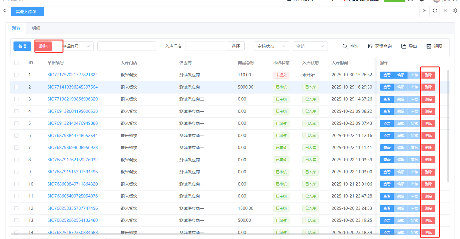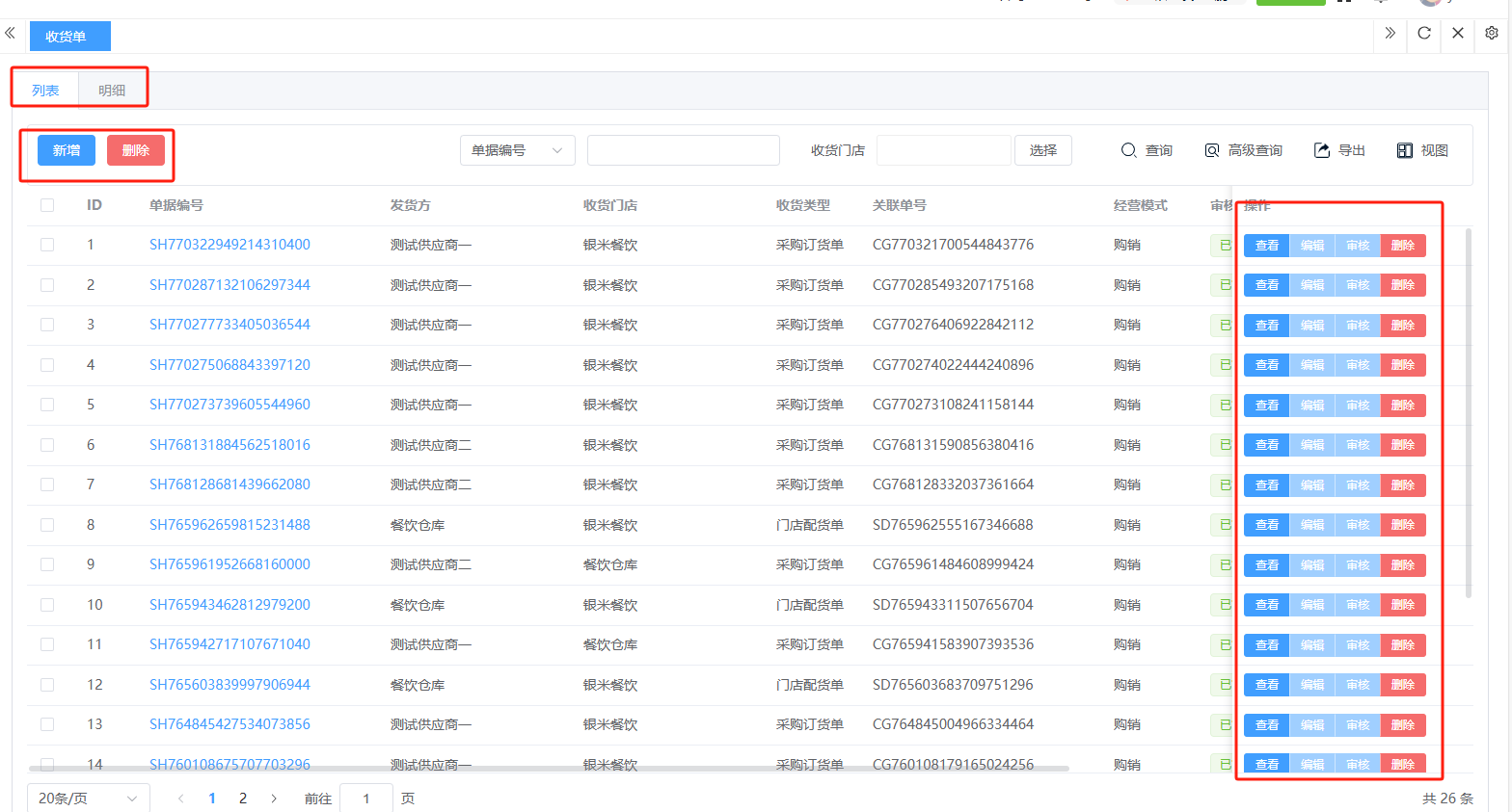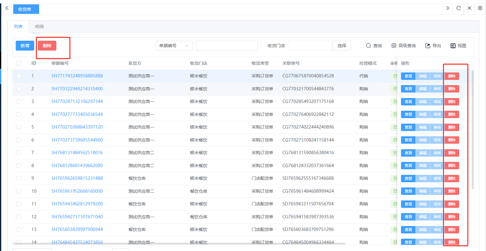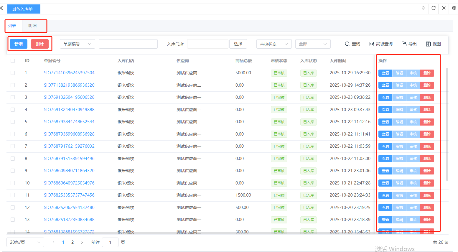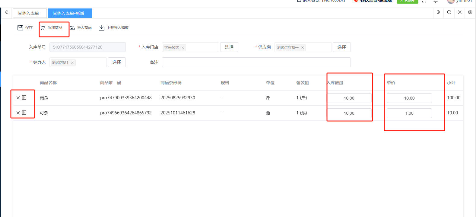 ## 入库 入库是商品、物料或资产到达仓库后,经过验收、清点、交接等流程,正式进入仓库存储区域的全过程。包含:收货单、入库单、其他入库单。 如图所示  一、收货单是仓库在收到货物时,用于记录实际到货信息、确认货物交接的原始凭证。包含:单据编号、收货方、收货门店、收货类型等。功能包含:新增、查看、编辑、审核、删除、明细。 如图所示  1、点击“新增”、录入所有相关内容,点击“保存 ”即可完成新增。如图所示  A、选择收货门店、经办人。如图所示  B、选择收货类型自动,填入单号后自动识别单号。如图所示  选择采购订货单、选择采购单号。如图所示  选择门店配货单、选择配货单号。如图所示  选择门店退货出库单、选择退货出库单号。如图所示  C、选择收货单据后,录入收货数量和赠送数量,点击“保存”即可。如图所示  D、点击“X”可删除商品。点击“⚅”可拆分商品。如图所示  E、点击“⚅”可进入拆分页面。包含:收货数量和赠送数量。点击新增即可新增商品录入,数量 、生产日期、批号,点击“确认”即可完成。如图所示  2、点击“查看”或者“单据编号”可查看收货单的详情。如图所示  3、点击“编辑”可修改收货单的所有内容,修改完成后点击“保存”即可完成,然后点击”提交审核“。如图所示  4、点击“审核“,选择”通过“或者”拒绝“,即可完成审核。如图所示  5、点击”删除“,右侧为”行删除“,左上角为”列删除“。如图所示  6、点击“明细”,便于查看商品的收货明细。如图所示  二、入库单是货物通过验收后,由仓库开具的、用于正式记录商品入库信息并更新库存账目的核心凭证。包含:单据编号、入库门店、供应商、销售模式等。功能包含:新增、查看、编辑、审核、删除、明细。 如图所示  1、点击“新增”、录入所有相关内容,点击“保存 ”即可完成新增。如图所示  A、选择入库门店、经办人、供应商。如图所示  B、选择经营模式购销(公司自主采购)、代销(公司代理销售 )、联营(公司和供应商联营)。如图所示  C、点击“添加商品”,选择入库商品,需要输入入库数量和单价。点击“X”可删除商品。点击“⚅”可拆分商品。 如图所示 2、点击“查看”或者“单据编号”可查看入库单的详情。如图所示  3、点击“编辑”可修改入库单的所有内容,修改完成后点击“保存”即可完成,然后点击”提交审核“。如图所示  4、点击“审核“,选择”通过“或者”拒绝“,即可完成审核。如图所示  5、点击”删除“,右侧为”行删除“,左上角为”列删除“。如图所示  6、点击“明细”,便于查看商品的入库明细。如图所示  三、其他入库单用于记录非标准采购或生产入库以外的其他形式库存增加业务,是确保所有库存变动均有迹可循的关键管理工具。包含:单据编号、入库门店、供应商、销售模式等。功能包含:新增、查看、编辑、审核、删除、明细。 如图所示  1、点击“新增”、录入所有相关内容,点击“保存 ”即可完成新增。如图所示  A、选择入库门店、经办人、供应商、备注。如图所示  B、点击“添加商品”,选择入库商品,需要输入入库数量和单价。点击“X”可删除商品。点击“⚅”可拆分商品。 如图所示  2、点击“查看”或者“单据编号”可查看其他入库单的详情。如图所示  3、点击“编辑”可修改其他入库单的所有内容,修改完成后点击“保存”即可完成,然后点击”提交审核“。如图所示  4、点击“审核“,选择”通过“或者”拒绝“,即可完成审核。如图所示  5、点击”删除“,右侧为”行删除“,左上角为”列删除“。如图所示  6、点击“明细”,便于查看商品的入库明细。如图所示