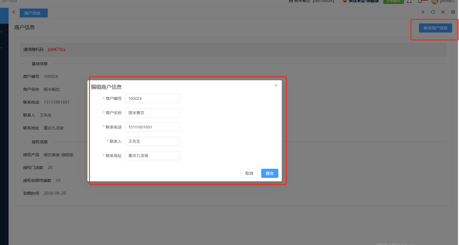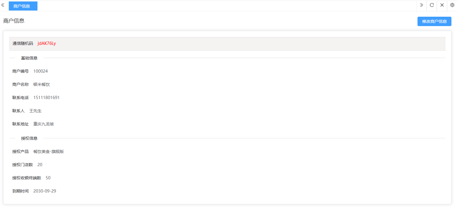 ## 商户信息 商户信息是连锁经营管理体系中记录合作方核心资料的数据基础,作为门店机构的经营主体依据,贯穿合同管理、结算对账、绩效评估全流程。包含:通信随机码、基础信息、授权信息。 如图所示  一、点击“修改商户信息”,可用修改商户的所有信息,修改完成后点击“提交”即可完成。如图所示