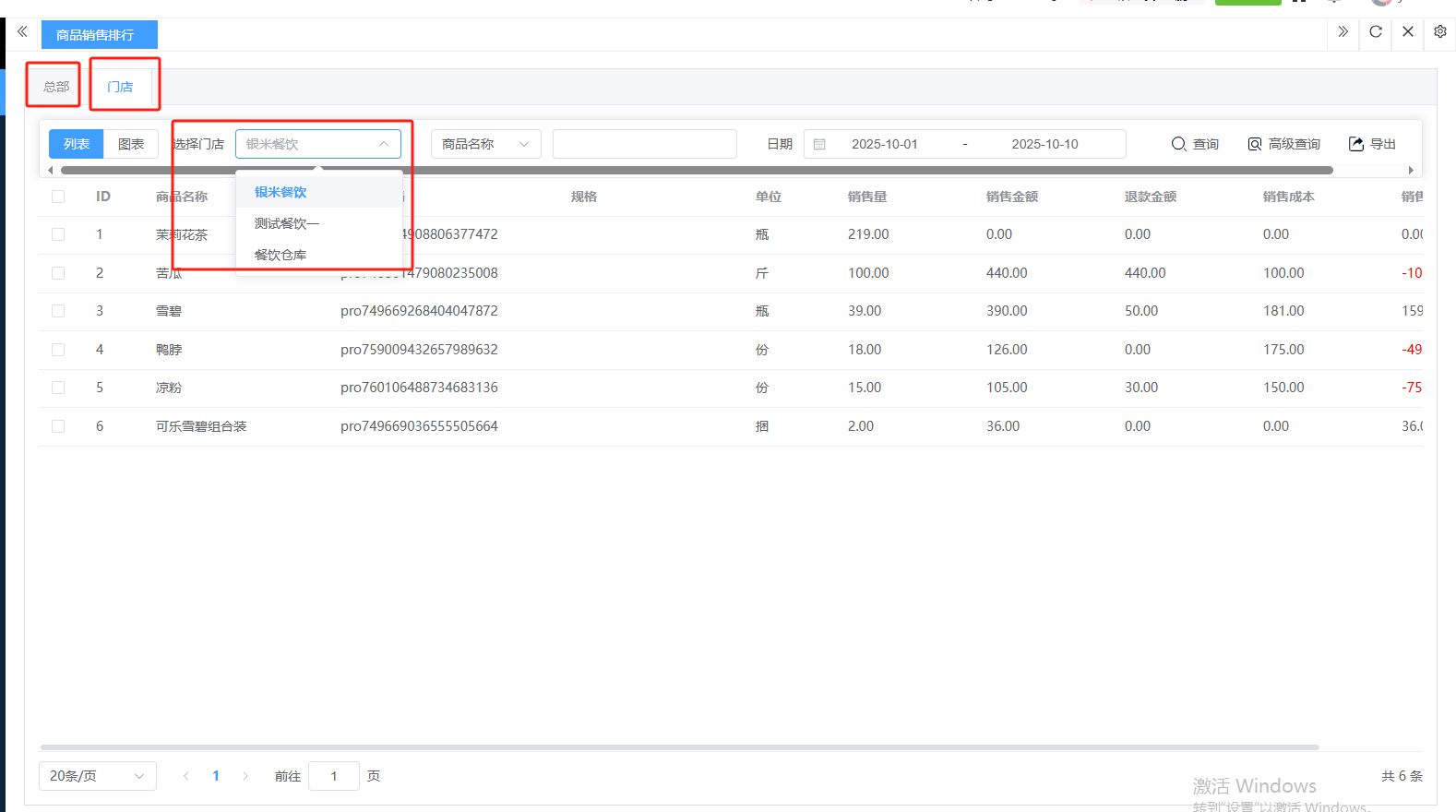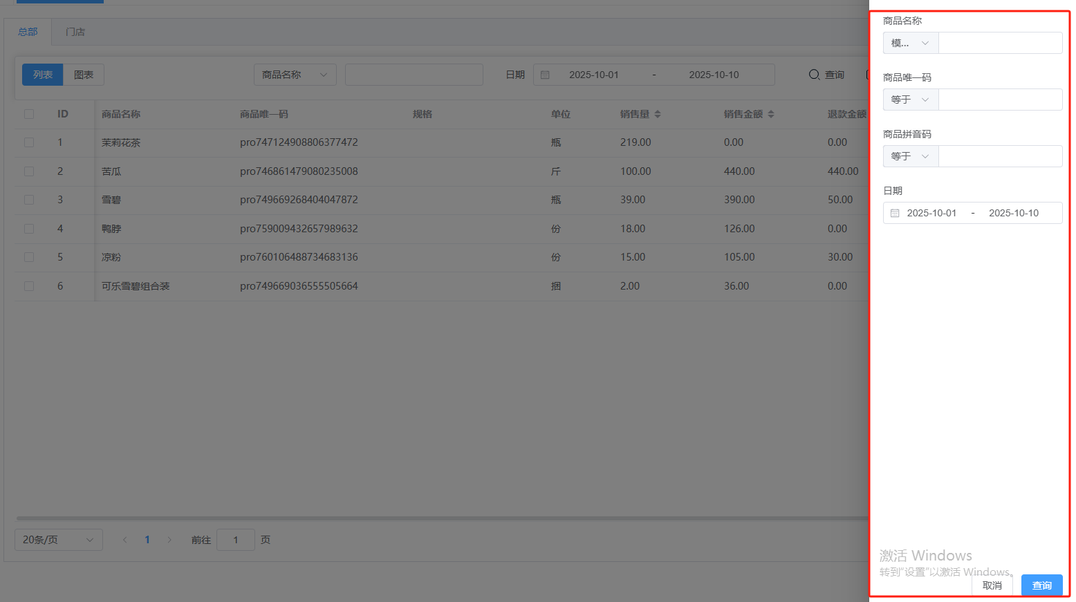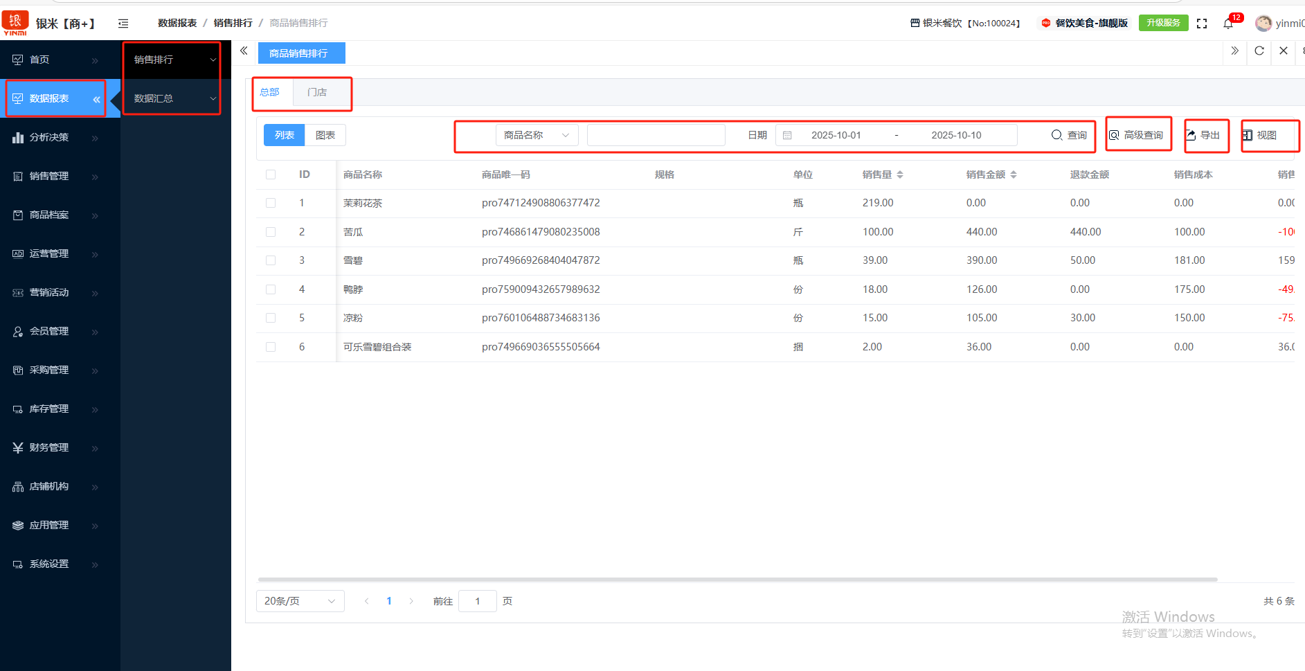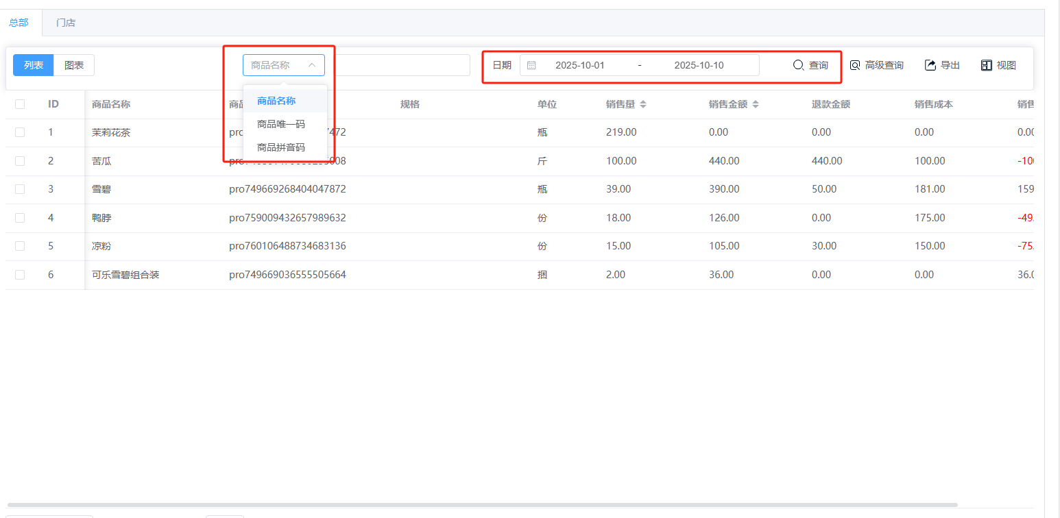 ## **数据报表** 数据报表是将日常经营中产生的各类数据,自动汇总、分析并转化为直观的报告和图表,帮助商家“看懂”生意、做出科学决策的“智慧大脑”,分为:销售排行、数据汇总。功能包含:总部和门店查询、商品和日期查询、高级查询、导出、视图。 如图所示  1、可按总部和门店查看。如查看门店,选择门店即可。如图所示  2、可按商品名称、唯一码、拼音码或者日期查询。如图所示  3、可点击”高级查询“,输入商品名称、唯一码 、拼音码或者日期,点击查询即可。如图所示  4、导出是将数据(如报表、列表)转换为可在电脑上独立存储、编辑和分享的文件。点击”导出“,再点击”创建导出任务“,查看详情,下载表格。无需导出点击”删除“即可。 如图所示  5、视图是允许用户根据不同角色和场景,自定义屏幕上显示哪些信息、以何种方式布局,从而实现个性化、高效的操作界面。如图所示