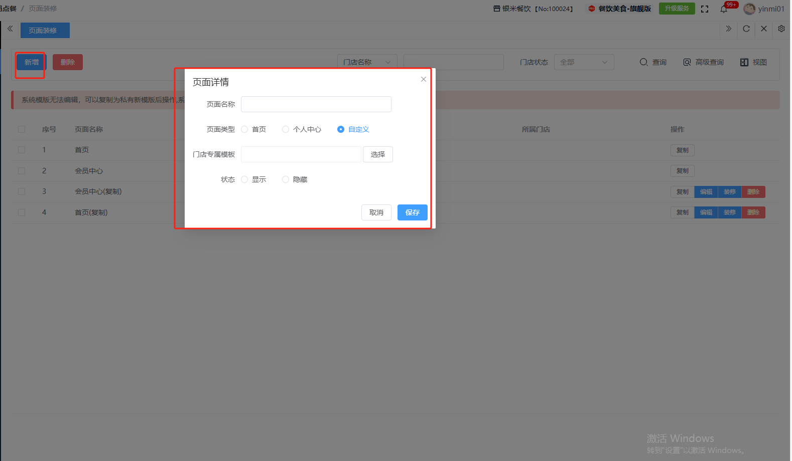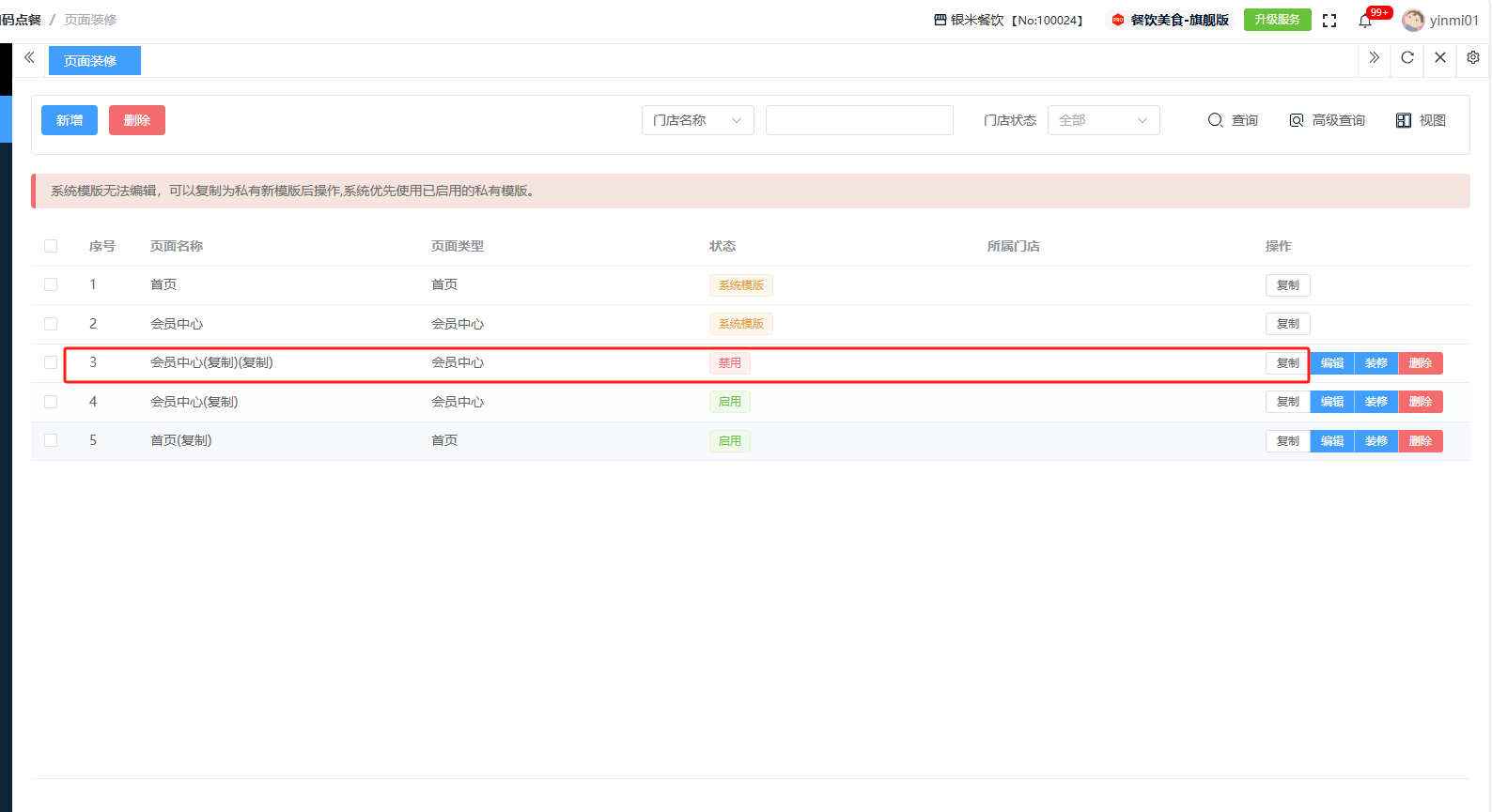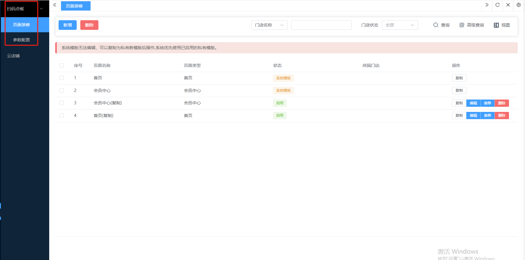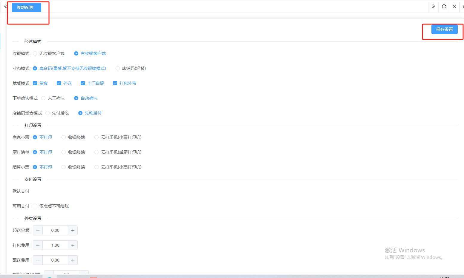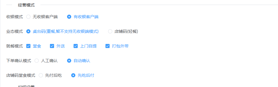 ## 扫码点餐 扫码点餐是餐饮企业通过二维码技术实现的数字化点餐解决方案,顾客通过手机扫描桌码即可自助完成浏览菜单、选菜下单和在线支付的全流程。包含:页面装修、参数配置。 如图所示  一、页面装修是企业对线上店铺界面进行可视化编辑与风格定制的功能模块,无需编码能力即可自主设计品牌化线上门店。包含:页面名称、页面类型、状态、所属门店等。功能包含:新增、复制、编辑、装修、删除。 如图所示  1、点击“新增”、录入页面名称、选择页面类型、选择门店专属模板、选择状态(显示或隐藏),点击“保存”即可完成新增。如图所示  2、点击“复制”,即可生成一个相同的装修页面、如图所示  3、点击“编辑”可修改页面装修的所有内容,修改完成后点击“保存”即可完成。如图所示  4、点击“装修”即可进入装修页面进行装修。如图所示  5、点击”删除“,右侧为”行删除“,左上角为”列删除“。如图所示  二、参数配置是对扫码点餐进行集中化管理的控制中心,通过调整参数值实现业务策略的灵活切换与系统行为的精准控制。设置完成所有内容后,点击“保存配置”即可完成。 如图所示  1、配置“经营模式”,选择收银模式(有无收银客户端)、业态模式(桌台码或店铺码)、就餐模式(堂食、外送、上门自提、打包外带,可多选)、下单确认模式(人工确认或自动确认)、店铺码堂食模式(先付后吃或先吃后付)。 如图所示  2、配置“打印模式”,选择商家小票(不打印、收银终端、云打印机)、选择厨打清单(不打印、收银终端、云打印机)、选择结算小票(不打印、收银终端、云打印机)。如图所示  3、配置“支付模式”,默认支付、可用支付。  4、配置“外卖模式”,设置起送金额、打包费用、配送费用、配送半径、免费配送半径、免配送加打包费金额。 如图所示
