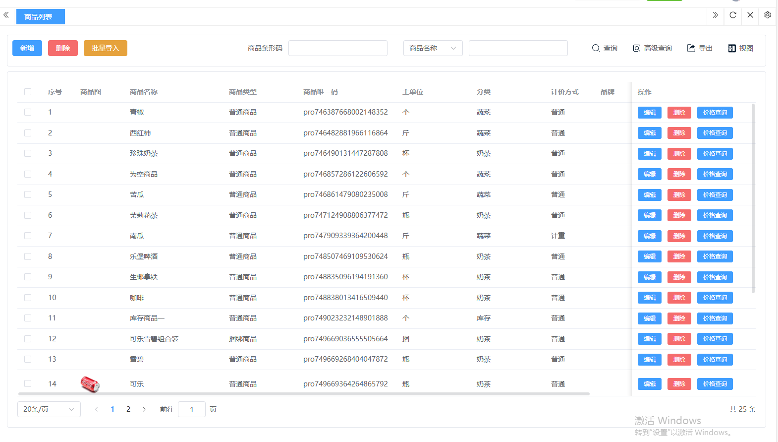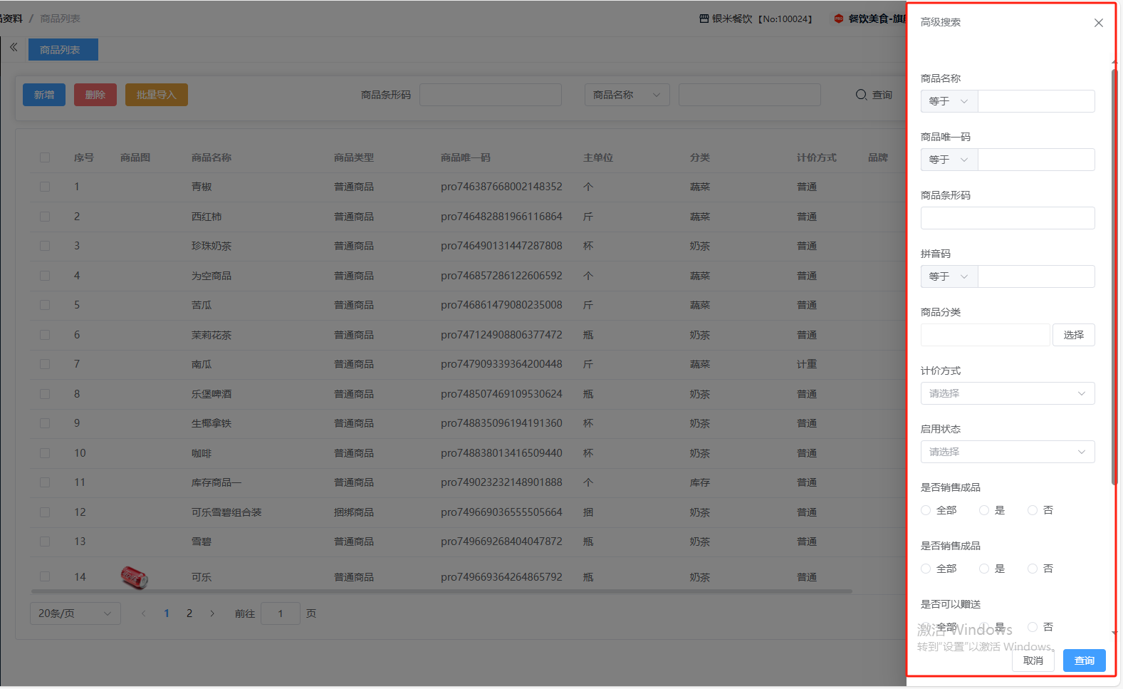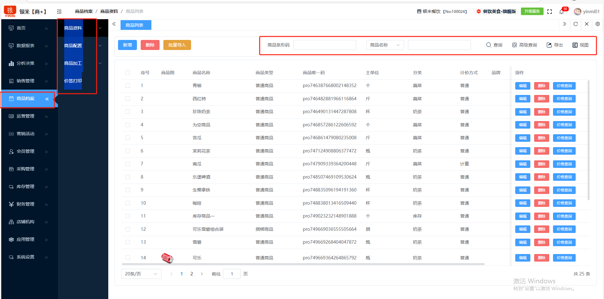 ## **商品档案** 商品档案是存储在系统中的、所有可销售商品的“数字身份证”集合,它定义了每一个商品的唯一身份、特征、来源和财务信息,是所有业务流转(销售、采购、库存)的数据核心。包含:商品资料、商品配置、商品加工、价签打印。功能包含:查询、高级查询、导出、视图。 如图所示  1、可按商品条形码,商品名称等查询。如图所示  2、可点击”高级查询“,输入商品名称、商品唯一码 、商品条形码等,点击查询即可。如图所示  3、导出是将数据(如报表、列表)转换为可在电脑上独立存储、编辑和分享的文件。点击”导出“,再点击”创建导出任务“,查看详情,下载表格。无需导出点击”删除“即可。 如图所示  4、视图是允许用户根据不同角色和场景,自定义屏幕上显示哪些信息、以何种方式布局,从而实现个性化、高效的操作界面。如图所示