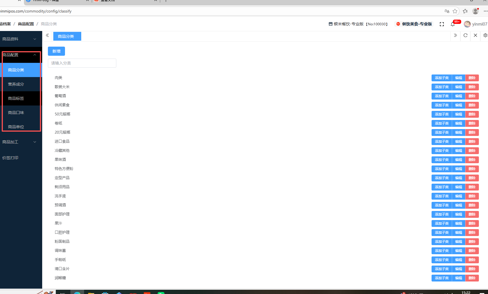 ## 商品配置 商品配置是基于企业经营策略和市场分析,对商品的结构、陈列、定价及促销进行系统性规划和安排的过程,其核心目标是最大化销售机会和整体利润。包含:商品分类、营养成分、商品标签、商品口味、商品单位。 如图所示  一、商品分类是根据商品的属性、功能、用途或目标客户等维度,对其进行系统性的、分层次的归类和组织,目的是为了高效的管理、精准的分析和便捷的购物。功能包含:新增、添加子类、编辑、删除。 如图所示  1、点击“新增”即可新增分类,选择父级分类(不选则本分类为一级分类)、录入分类名称、选择销售可见或者隐藏、设置排序数字(0为最高级别),点击“提交”即可。如图所示  2、点击“添加子类”,父级分类(可修改)、录入分类名称、选择销售可见或者隐藏、设置排序数字(0为最高级别),点击“提交”即可增加子级分类。如图所示  3、点击“编辑”,选择父级分类(可修改)、分类名称(可修改)、选择销售可见或者隐藏、设置排序数字(0为最高级别),点击“提交”即可。如图所示  4、点击“删除”、点击“确认”即可删除。如图所示  二、营养成分是对食品中能量、营养素和功能性成分含量的标准化数据描述,其核心价值是履行法律义务、支持消费者健康决策并塑造品牌信任。功能包含:新增、编辑、删除。 如图所示  1、点击“新增”即可,录入名称、录入单位,点击“提交”即可。如图所示  2、点击“编辑”即可,修改名称、修改单位,点击“提交”即可。如图所示  3、点击”删除“,右侧为”行删除“,左上角为”列删除“。如图所示  三、商品标签是附着于商品或其包装上,用于标识商品核心信息、辅助运营管理和影响购买决策的载体,它连接了线下物理商品与线上数字系统。包含:新增标签组、新增标签。 如图所示  1、点击“新增标签组”、录入名称,点击“提交”即可。如图所示  2、点击“编辑”即可修改,完成点提交。点击“删除”即可删除 。如图所示  3、点击“新增标签”、录入名称,点击“提交”即可。如需删除、点击"x"即可。如图所示  四、商品口味是描述商品风味特征的属性,用于区分同一品牌和规格下的不同风味产品,其核心价值在于满足消费者多样化的偏好、驱动精准营销和优化产品组合。包含:新增口味、新增商品口味。 如图所示  1、点击“新增口味”,录入分类名称、选择是否必选、、设置排序数字(0为最高级别),点击“提交”即可。 如图所示  2、点击“新增商品口味”,录入名称、价格、设置排序数字(0为最高级别)、选择关联商品,点击“确定”即可。如图所示  五、商品单位是用于标准化计量、定价、交易和管理商品数量的基本度量单位。包含:新增、编辑、删除。 如图所示  1、点击“新增”、录入名称,点击“确认”即可。如图所示  2、点击“编辑”即可修改,完成点提交。如图所示  3、点击”删除“,右侧为”行删除“,左上角为”列删除“。如图所示