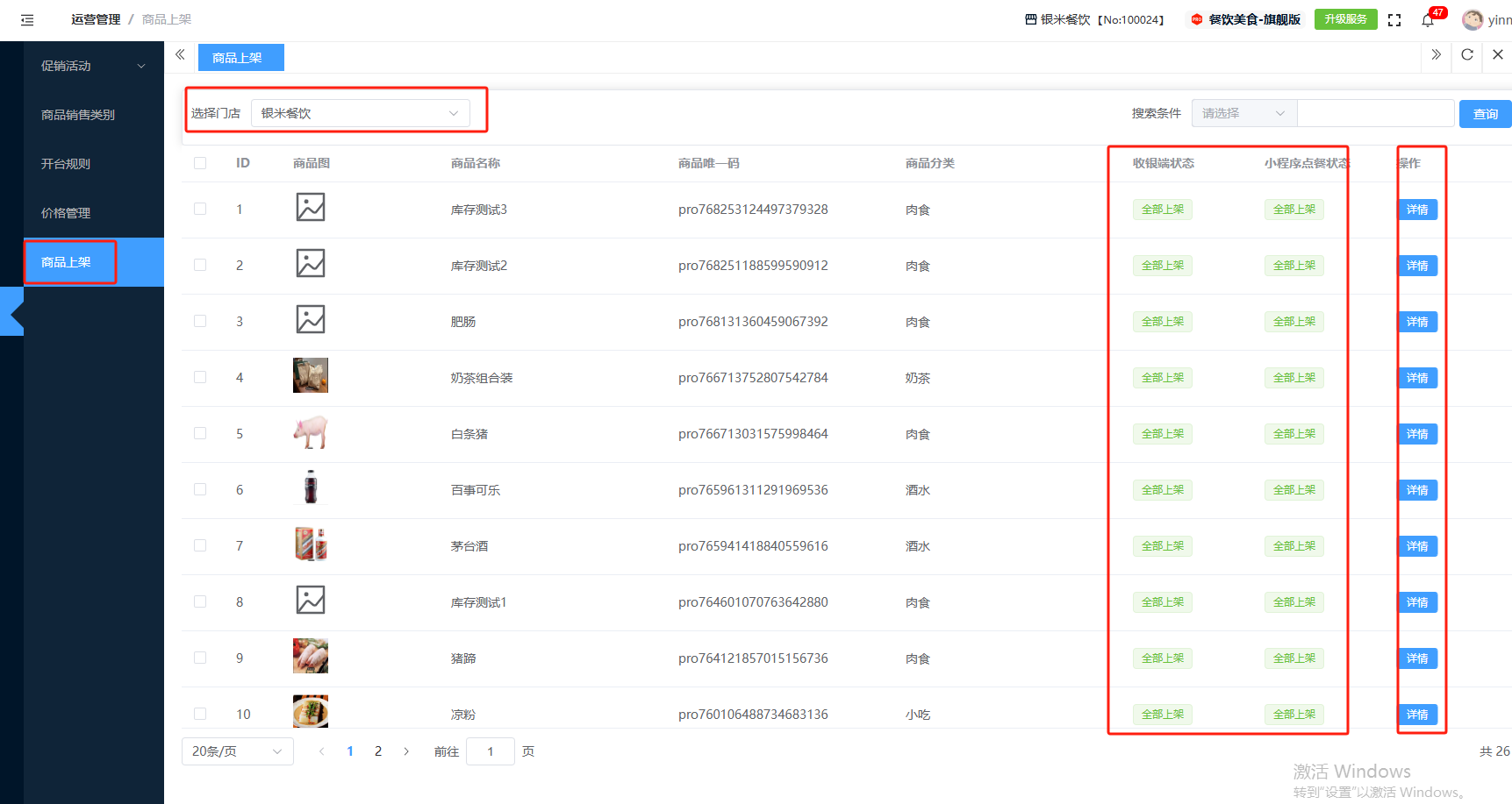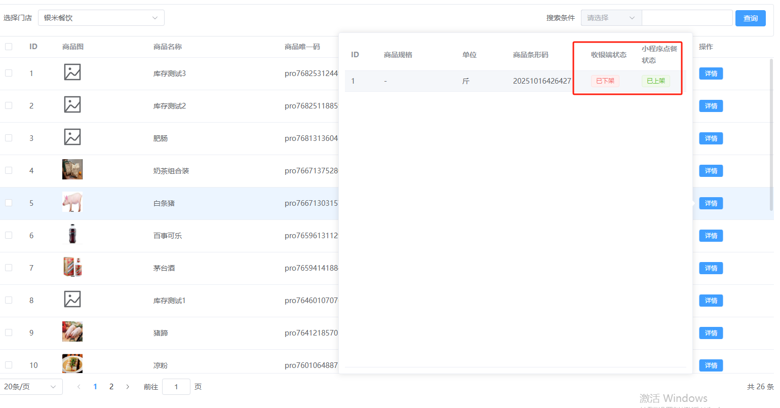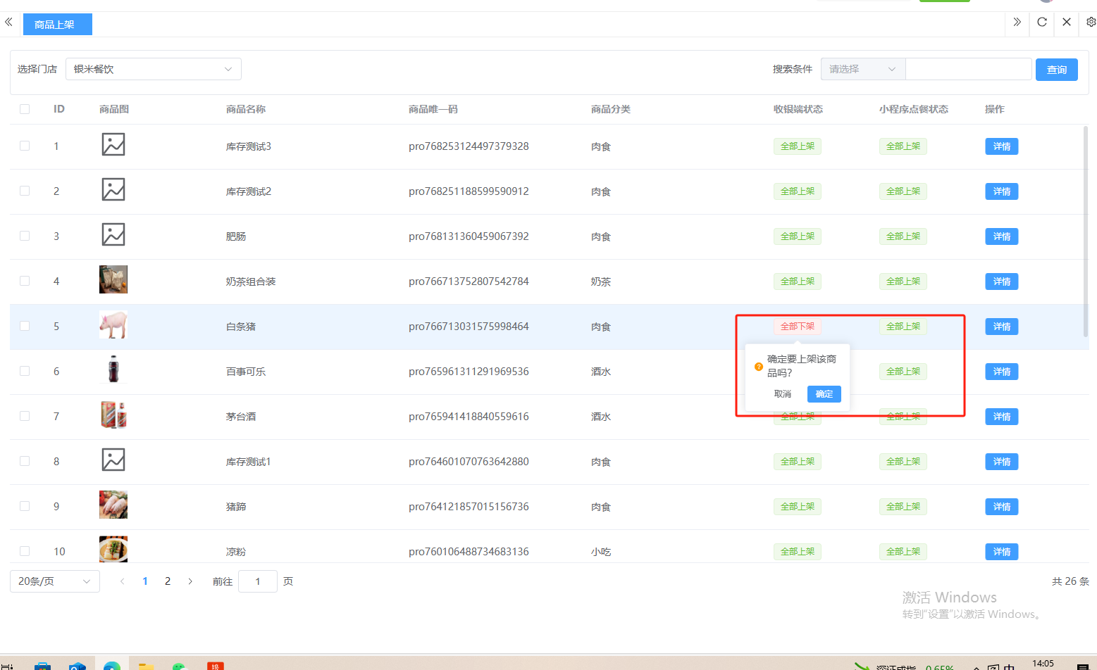 ## 商品上架 商品上架是在商品管理系统中,通过一系列操作使新建或停售的商品进入“可销售”状态,并在指定销售渠道(如线下门店、线上商城)进行展示的过程。包含:商品图、商品名称、商品唯一码、商品分类、收银端状态、小程序点餐状态、操作。功能包含:选择门店、商品上下架。 如图所示  一、点击页面的状态(收银端或小程序点餐),按提示确定商品是否上下架即可。如图所示  二、点击“详情”、按提示确定商品是否上下架即可。如图所示