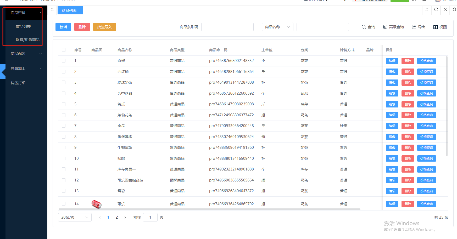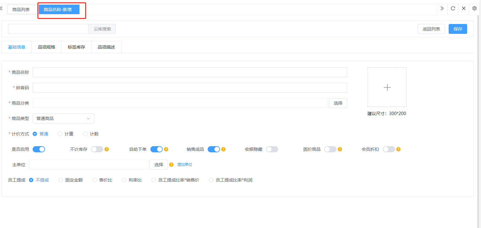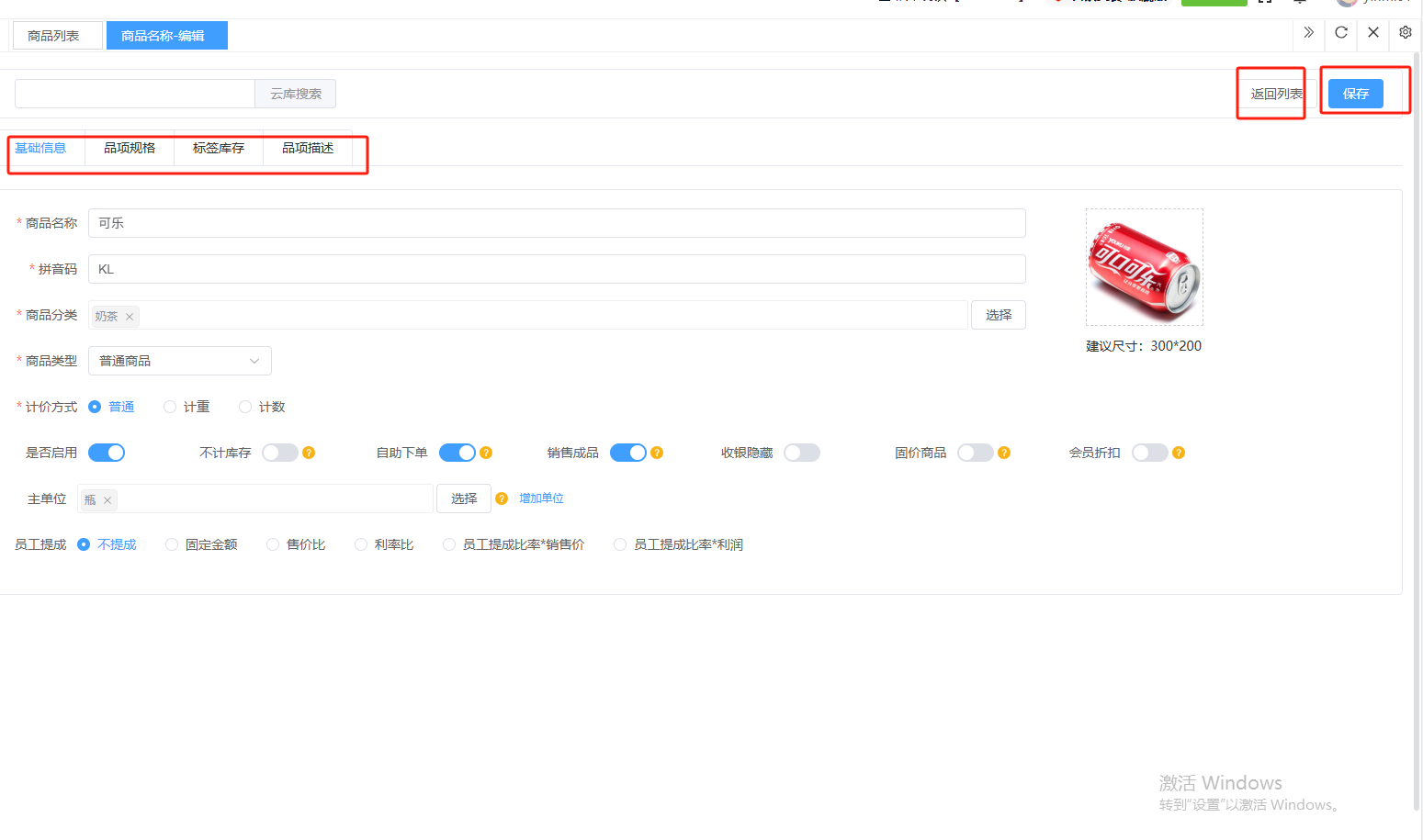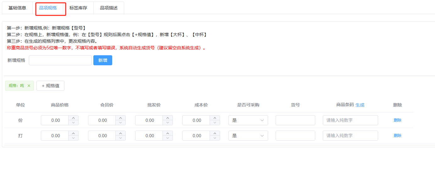 ## 商品资料 商品资料是描述一个商品所有属性的数据集合,它是构建商品档案的基石,其准确性和完整性直接决定了商品档案的价值和整个信息系统的可靠性。包含:商品列表、联营/租赁商品。 如图所示  一、商品列表是系统中所有商品档案以清单形式的可视化展示,它是用户(如收银员、店员、管理者)进行商品搜索、查询、选择和管理的主要操作界面。展示包含:商品图、商品名称、商品类型、商品唯一码等。功能包含:编辑、删除,价格查询、新增、批量导入。 如图所示  1、点击”编辑“进入商品详情页面,包含:基础信息、品项规格、标签库存、品项描述。无需修改点击”返回列表“,如需修改,修改后点击”保存“即修改生效。(详见商品新增) 如图所示  2、点击”删除“,右侧为”行删除“,左上角为”列删除“。如图所示  3、价格查询是通过系统快速、准确地获取商品当前售价及相关价格信息。点击”价格查询“即可显示该商品的单位、规格、价格本、价格。查询完点击”确认“即可返回。 如图所示  4、商品新增是为新商品在系统中建立唯一数字身份的过程,它是该商品进入采购、库存、销售和财务分析等所有业务流程的起点。点击”新增“即可进行商品新增页面。 如图所示  A、基础信息是系统初始化时录入的、相对静态的核心参数和数据,它定义了企业的运营框架和规则,是所有业务流(进、销、存、财)能够顺畅、准确运转的前提。按要求需要录入”商品名称“、”拼音码“。如图所示  选择”商品分类“,选择好后点击”确认“即可。(具体类型详见”商品分类“)如图所示  选择”商品分类“,选择好后点击”确认“即可。(具体类型详见”商品组合“)。如图所示  选择”计价方式“。普通(正常商品)、计重(称重商品)、计数(以某重量为单位的商品)。如图所示  选择”是否启用“(是否禁用商品)、不计库存(商品销售不扣除库存)、自助下单(商品可在用户客户端自己下单)、销售成品(是否最终销售商品)、收银隐藏(收银员看不见商品)、固价商品(商品固定价格,不参与会员活动等折扣)、会员折扣(开启时应用会员折扣价格,关闭应用会员价)。  选择“主单位”(商品单价计量单位,商品最小单位),点击“增加单位”可设置其他单位。如图所示  选择单位,点击“新增”即可新增单位,输入单位名称,点击确认即可。如图所示  选择“员工提成”,不提成、固定金额(按固定金额)、售价比(按销售金额)、利率比(按利润金额)、员工提成比率X销售价、员工提成比率X利润。如图所示 选择图片,点击"+",导入图片即可。如图所示  B、品项规格是商品可供销售的最小单元的具体描述,它明确了商品的计量单位、包装含量和销售方式,是商品在系统中被识别和管理的基准。录入商品价格、会员价、批发价、成本价、是否可采购、货号、商品条码(点击生成为随机生成条码)、删除。**注意:称重商品货号必须为5位唯一数字,不填写或者填写错误,系统自动生成货号(建议留空由系统生成)。** 如图所示  点击”新增"/第一步:新增规格,例:新增规格【型号】第二步:在规格上,新增规格值,例:在【型号】规则后面点击【+规格值】,新增【大杯】、【中杯】第三步:在生成的规格列表中,更改规格内容。如图所示  C、标签库存是指对每一批具有相同特定属性(如生产日期、批次号、保质期)的商品进行独立标识和追踪的库存管理方式,其核心是实现库存的“批次化”或“序列化”管理。如图所示  选择“商品口味”,点击确定即可生效。(详见“商品口味”)。如图所示  选择“商品品牌”,点击“新增”即可增加新品牌。如图所示  选择“商品标签”,点击确定即可生效。(详见“商品标签”)。如图所示  设置库存下限、库存上限、保质期、预警天数(为0时系统将不自动预警)。如图所示  选择报损价格,包含:进货价、销售价。  D、品项描述是用以详细说明商品特性、功能、材质、用途及卖点的文本信息,其核心目标是促成购买决策、减少信息不对称,并提升购物体验。 如图所示  5、批量导入是通过下载标准模板、填写数据文件,并一次性上传至系统,从而快速完成大量数据初始化和更新的方法,其核心价值是“化繁为简,极大提升效率”。点击“批量导入”,点击“上传导入文件”即可。 如图所示  二、联营/租赁商品是指商品所有权属于供应商(或品牌方),商户仅提供场地进行销售并按约定比例抽取佣金的商品。其核心特征是“商户不拥有商品所有权,不承担库存风险”。包含:联营是一种商户(如商场)提供经营场地和管理服务,品牌商提供商品并负责销售,双方按照约定的比例对销售额进行分成的合作模式;租赁是指商户(出租方)将特定的场地、空间、设备或系统的使用权,在一定时期内有偿地授予承租方使用,并收取固定租金的合作模式,其核心是“使用权与所有权的分离”。展示包含:商品图、商品名称、商品唯一码等。功能包含:编辑、删除,新增、选择门店。 如图所示  1、点击”编辑“进入商品详情页面,包含:门店、选择商品、商品模式。修改后点击”保存“即修改生效。(详见新增)。如图所示  2、点击”删除“,右侧为”行删除“,左上角为”列删除“。如图所示  3、、点击”新增“即可进行商品新增页面。新增后点击”保存“即新增生效。如图所示  选择商品