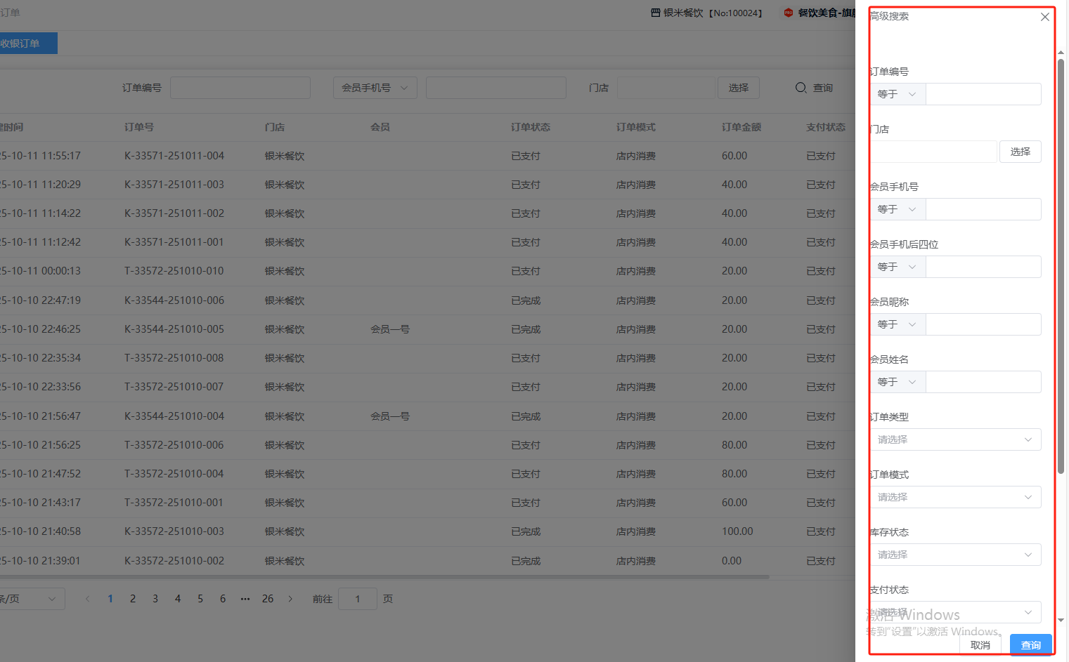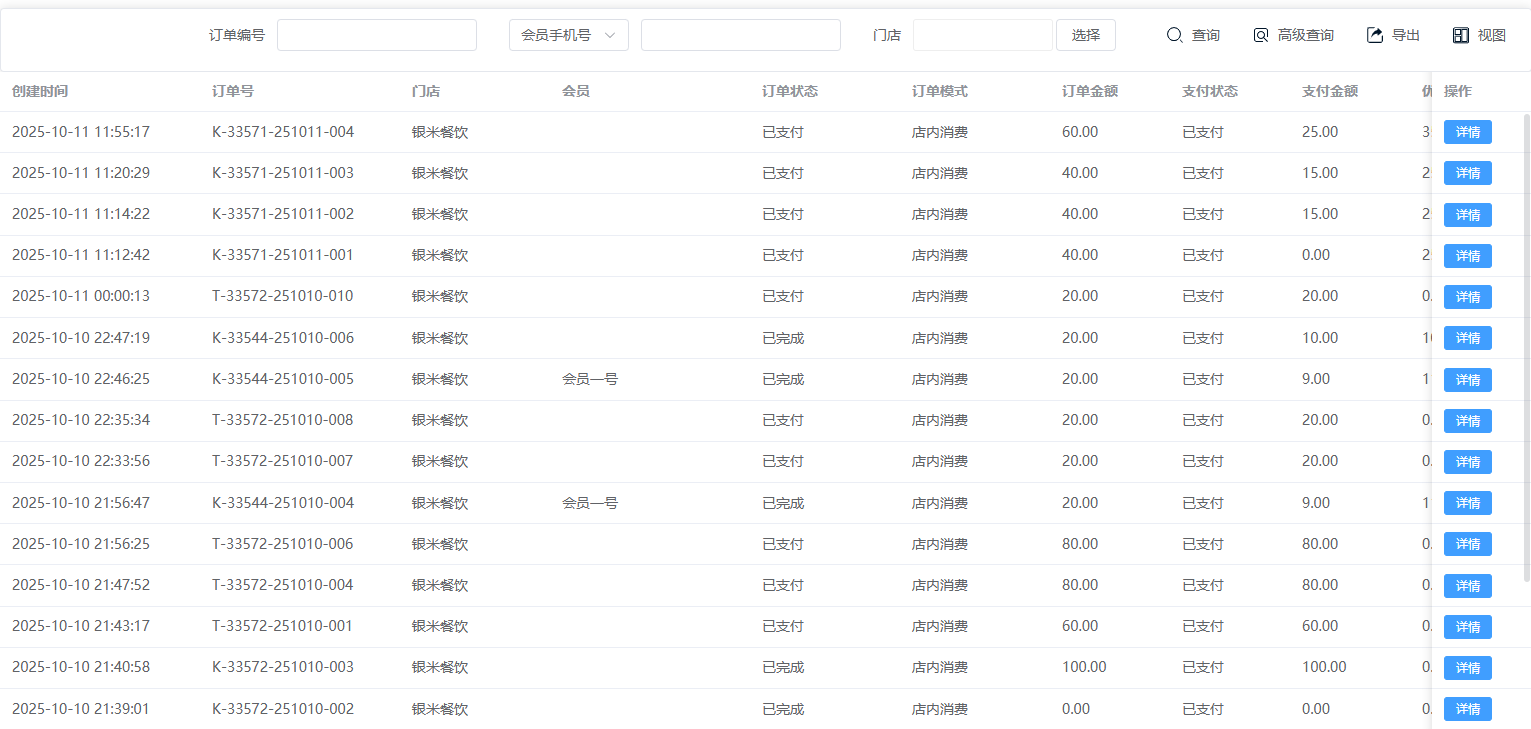 ## 销售管理 销售管理是通过一系列计划、组织、指挥、协调与控制活动,有效整合人员、流程和数据,以达成甚至超越企业销售目标的系统性工程。包含:订单、收款记录、门店订货。功能包含:查询、高级查询、导出、视图。 如图所示  1、可按订单编号、会员手机或者门店查询。如图所示  2、可点击”高级查询“,输入订单编号、会员手机号 、门店等,点击查询即可。如图所示  3、导出是将数据(如报表、列表)转换为可在电脑上独立存储、编辑和分享的文件。点击”导出“,再点击”创建导出任务“,查看详情,下载表格。无需导出点击”删除“即可。 如图所示  4、视图是允许用户根据不同角色和场景,自定义屏幕上显示哪些信息、以何种方式布局,从而实现个性化、高效的操作界面。如图所示