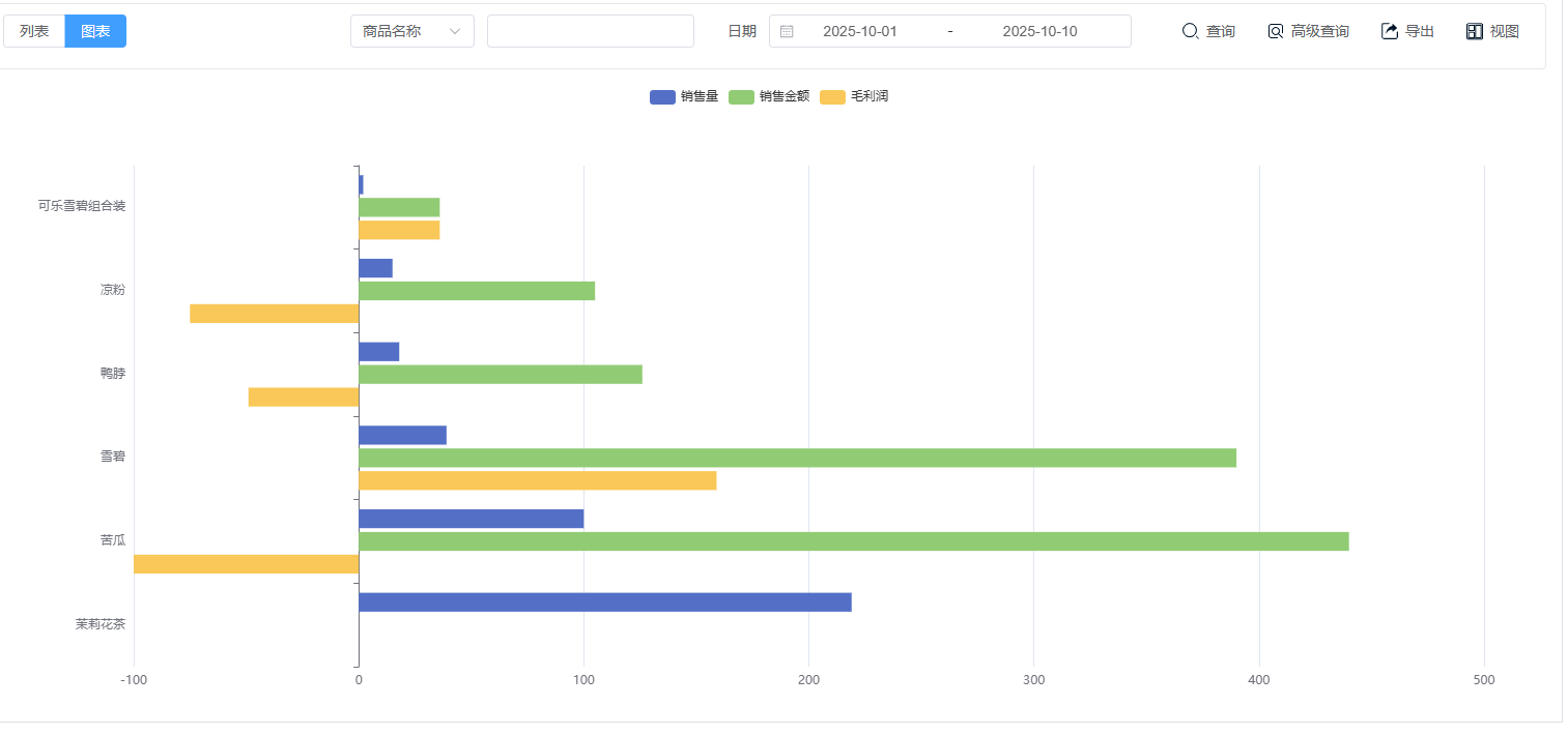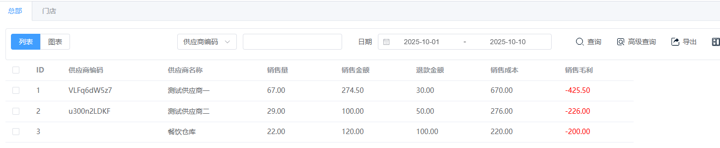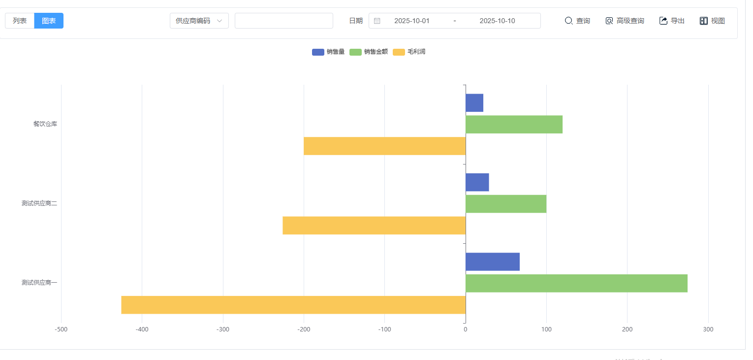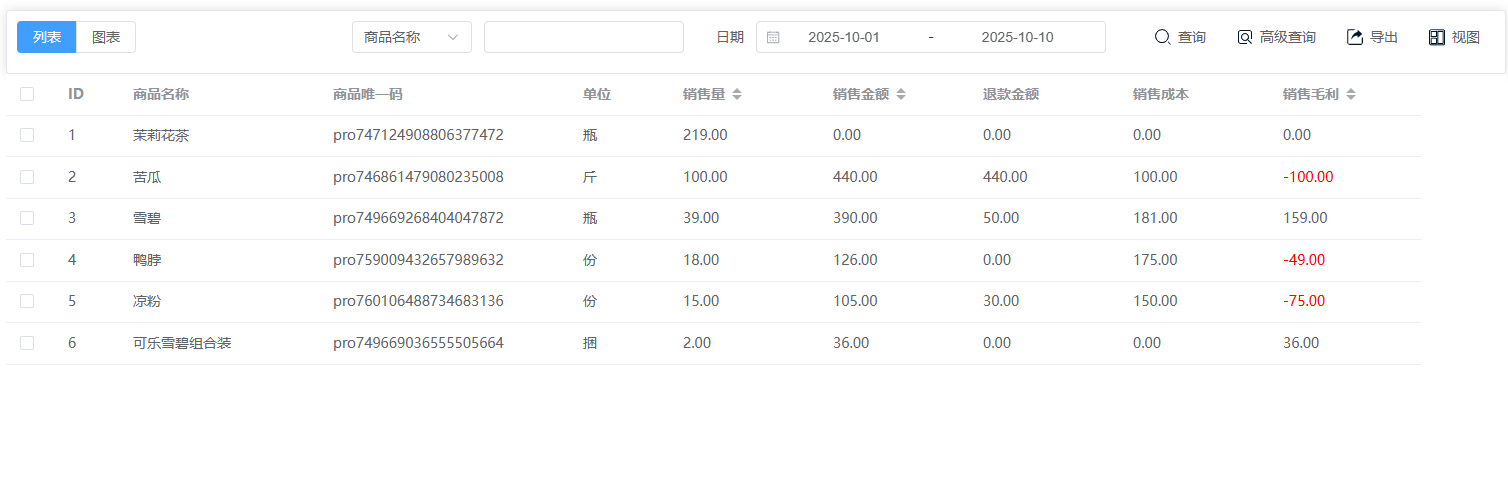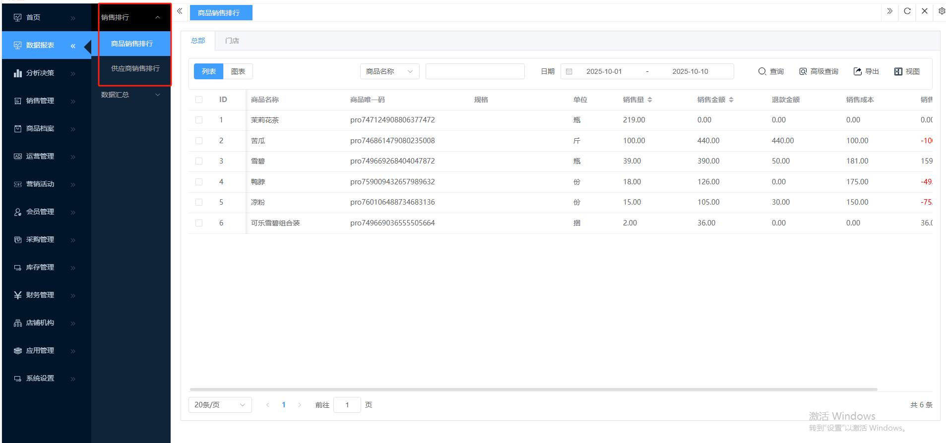 ## 销售排行 ”销售排行“是系统根据预设的统计维度(如销售额、销售量),对商品和供应商进行自动排序后生成的列表。包含:商品销售排行、供应商销售排行。 如图所示  1、商品销售排行是根据商品销售量、销售金额等统计的报告和表格,进行采购、营销和菜单优化的核心依据。查看:商品名称、唯一码、单位、销售量、销售金额、退款金额、销售成本、销售毛利。分为:列表和 图表。 如图所示   2、供应商销售排行是根据供应商的商品销售量、销售金额等统计的报告和表格,是采购谈判、优化供应链的核心数据武器。查看:供应商编码、供应商名称、销售量、销售金额、退款金额、销售成本、销售毛利。分为:列表和图表。 如图所示