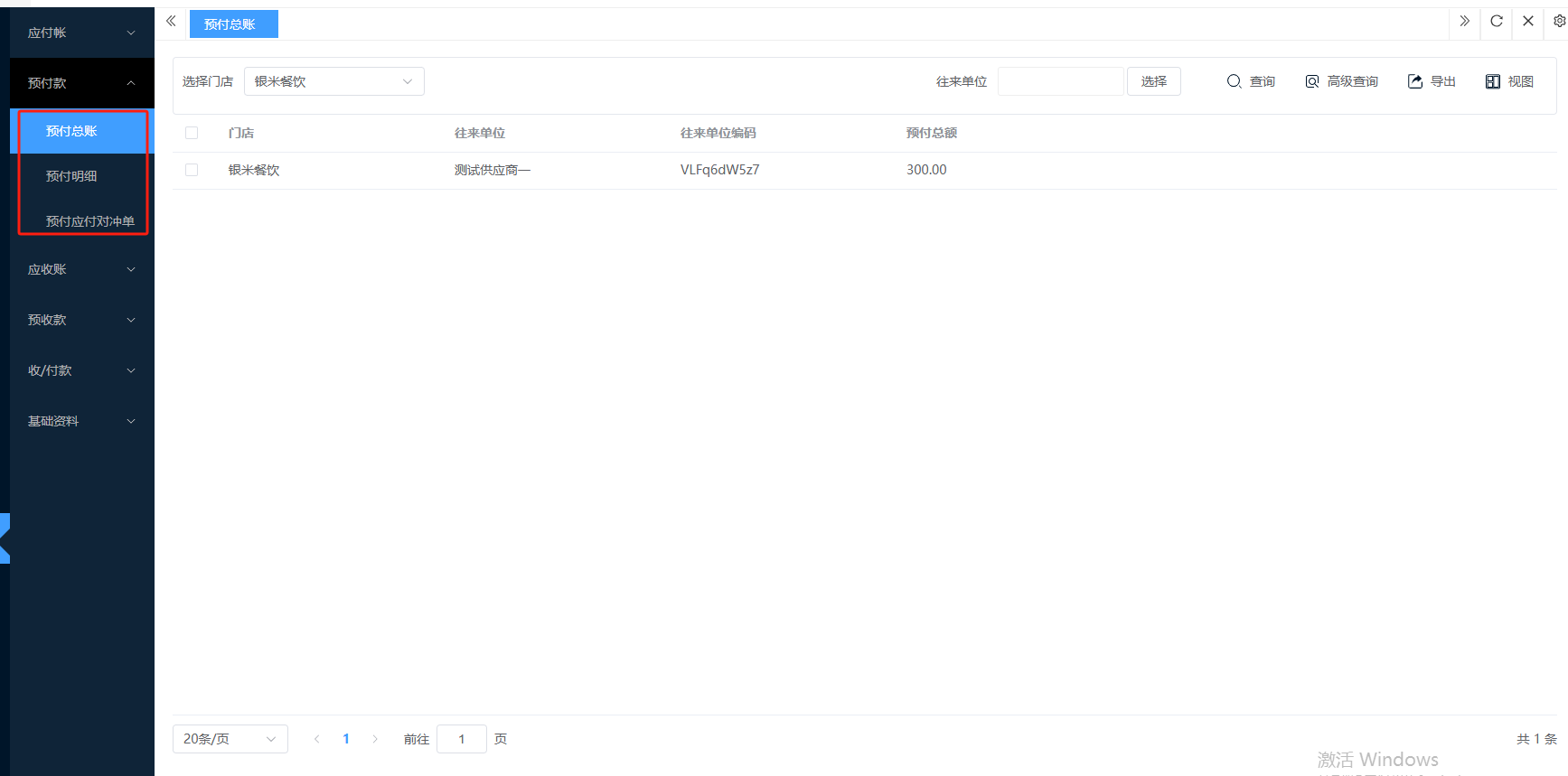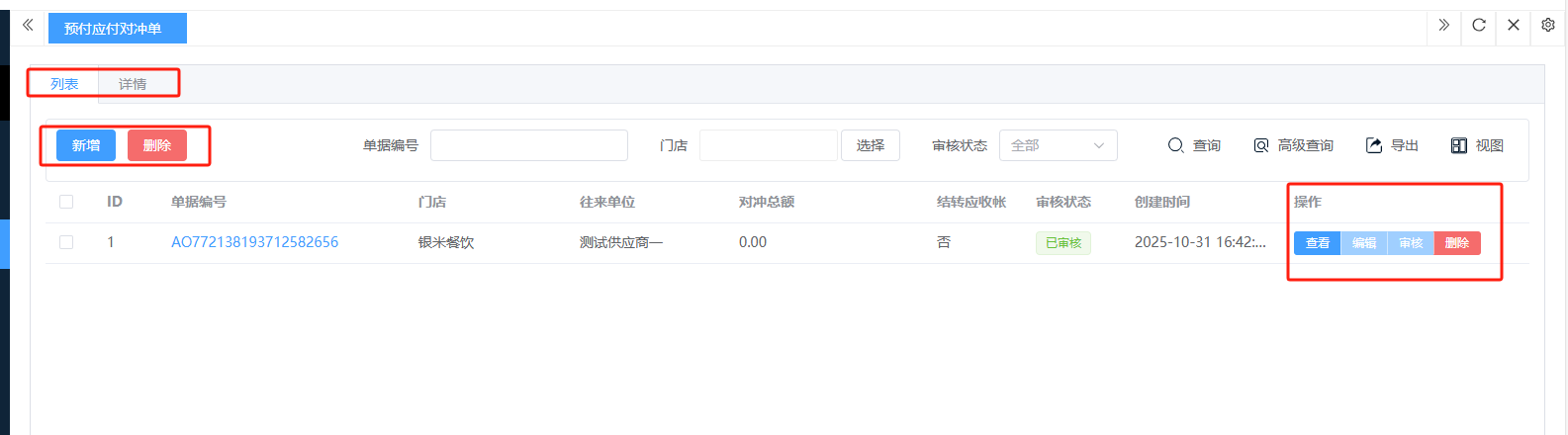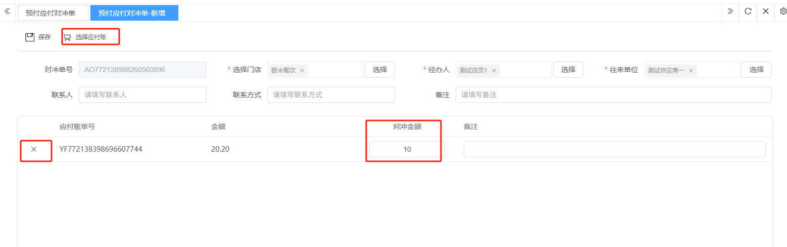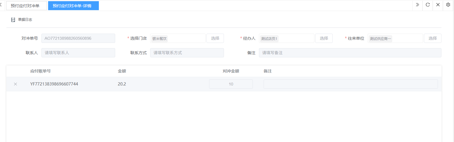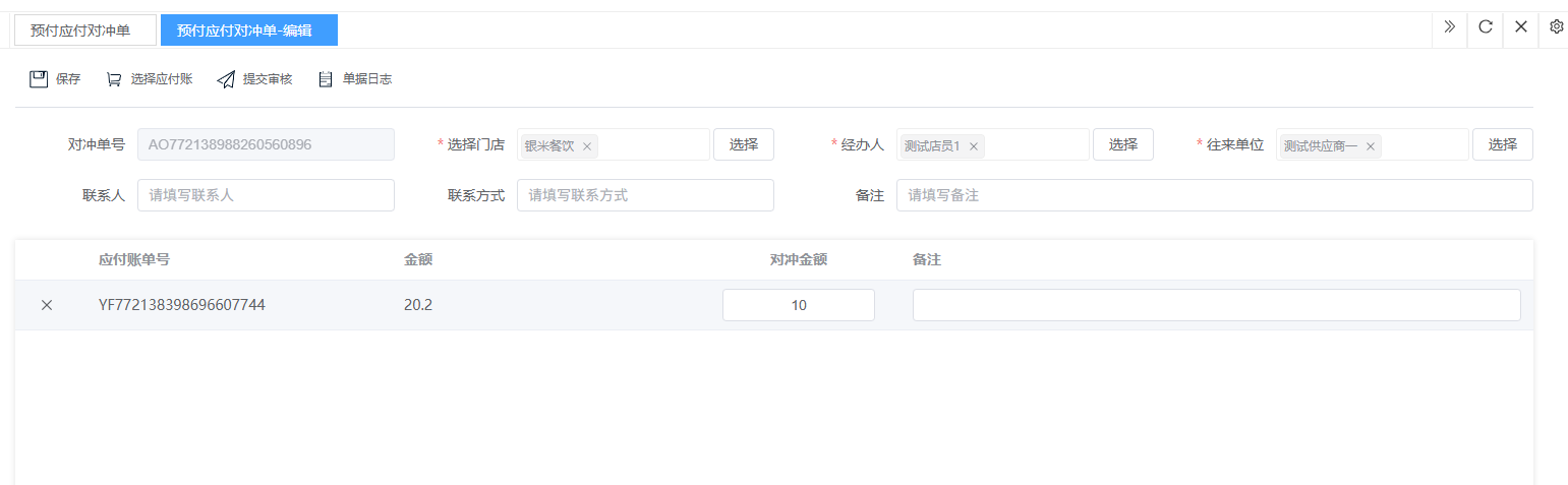 ## 预付款 预付款是企业按照合同约定,在供应商正式交付货物或提供服务前,预先支付的部分款项。包含:预付总账、预付明细、预付应付对冲单。 如图所示  一、预付总账是财务会计系统中,用于汇总核算企业所有预付账款总括情况的统驭性账户,属于资产类科目。可选择门店查看。包含:门店、往来单位、往来单位编码、预付总额。 如图所示  二、预付明细是企业财务管理中,按供应商、项目或合同等维度建立的预付账款辅助核算账,详细记录每笔预付款的支付、核销及余额信息。包含:变动金额、门店、往来单位、变动金额、变动后金额、来源单号(点击进入付款单)。 如图所示  三、预付应付对冲单是企业用于核销预付账款与应付账款的内部会计凭证,当收到供应商发票或货物时,将已预付的款项转为正式应付或直接冲减应付。包含:单据编号、门店、往来单位等。功能包含:新增、查看、编辑、审核、删除、详情。 如图所示  1、点击“新增”、录入所有相关内容,点击“保存 ”即可完成新增。如图所示  A、选择支出门店、往来单位、经办人。如图所示  B、填写联系人、联系方式、备注。如图所示  C、点击“选择应付帐,选择账单,需要输入对冲金额。点击“X”可删除项目。如图所示  2、点击“查看”或者“单据编号”可查看预付应付对冲单的详情。如图所示  3、点击“编辑”可修改预付应付对冲单的所有内容,修改完成后点击“保存”即可完成,然后点击”提交审核“。 如图所示  4、点击“审核“,选择”通过“或者”拒绝“,即可完成审核。如图所示  5、点击”删除“,右侧为”行删除“,左上角为”列删除“。如图所示  6、点击“详情”,便于查看门店的应付账单的明细。如图所示