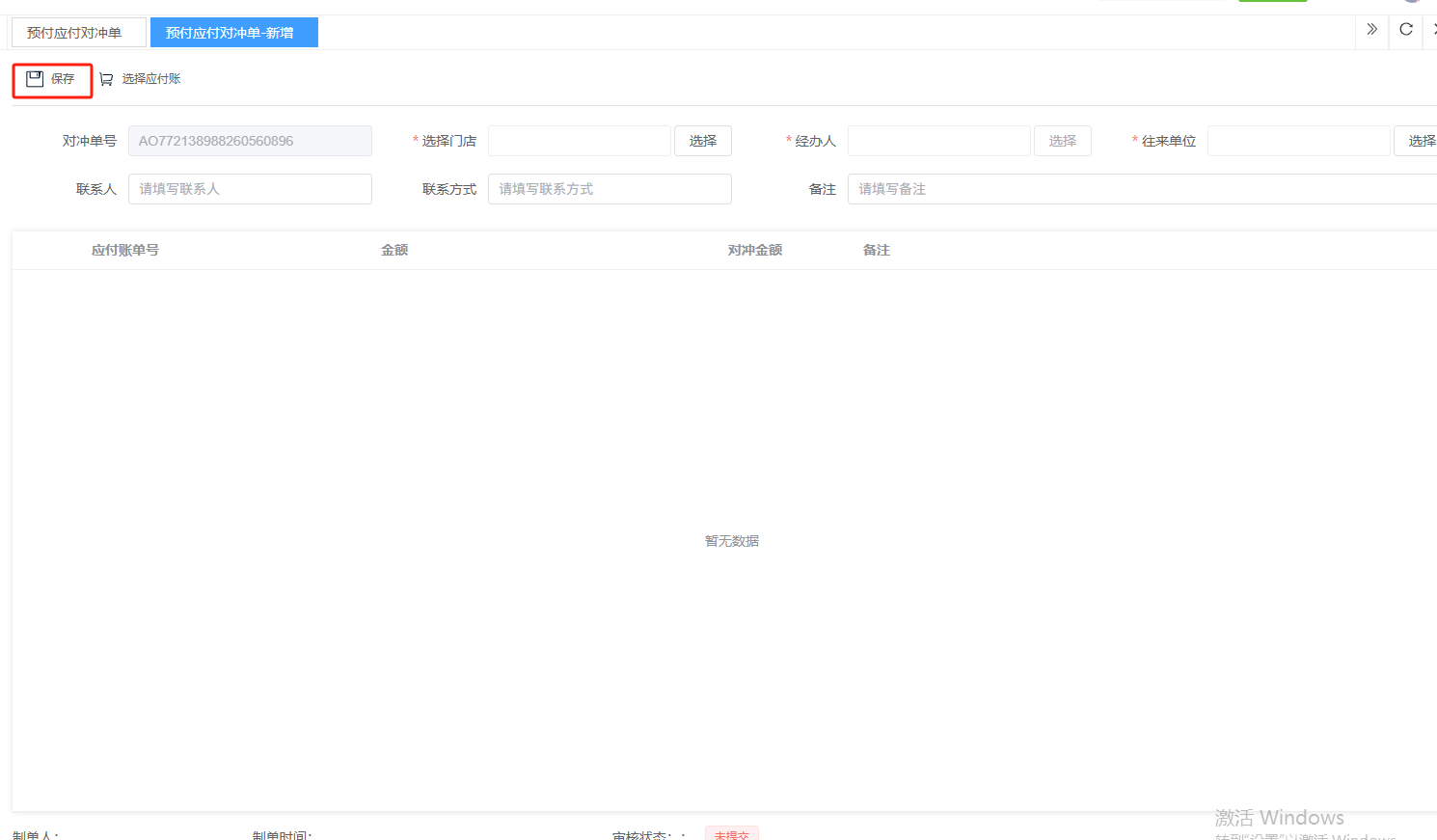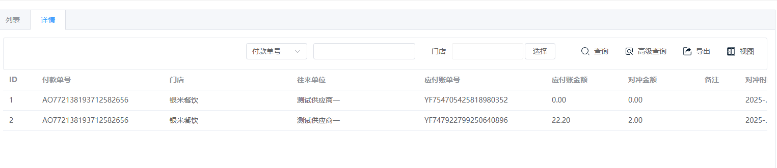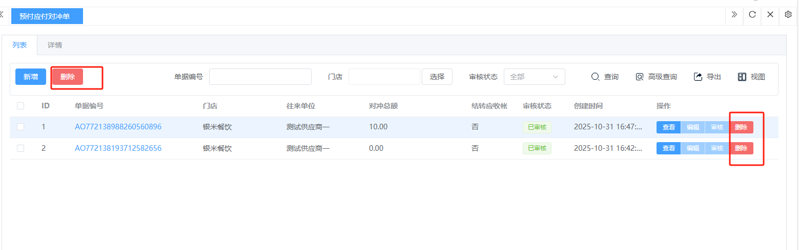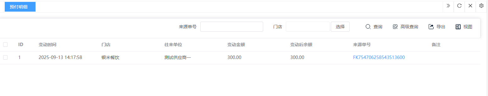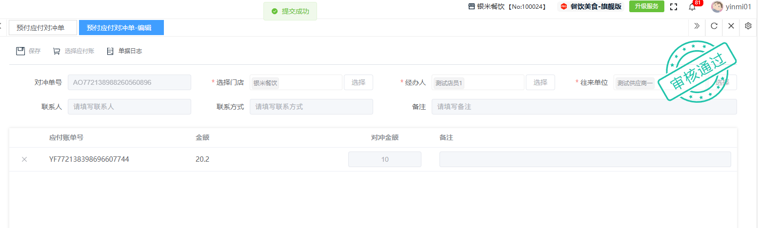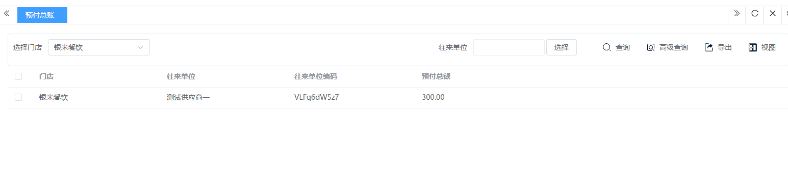 ## 预付款 预付款是企业按照合同约定,在供应商正式交付货物或提供服务前,预先支付的部分款项。包含:预付总账、预付明细、预付应付对冲单。 如图所示  一、预付总账是财务会计系统中,用于汇总核算企业所有预付账款总括情况的统驭性账户,属于资产类科目。可选择门店查看。包含:门店、往来单位、往来单位编码、预付总额。 如图所示  二、预付明细是企业财务管理中,按供应商、项目或合同等维度建立的预付账款辅助核算账,详细记录每笔预付款的支付、核销及余额信息。包含:变动金额、门店、往来单位、变动金额、变动后金额、来源单号(点击进入付款单)。 如图所示  三、预付应付对冲单是企业用于核销预付账款与应付账款的内部会计凭证,当收到供应商发票或货物时,将已预付的款项转为正式应付或直接冲减应付。包含:单据编号、门店、往来单位等。功能包含:新增、查看、编辑、审核、删除、详情。 如图所示  1、点击“新增”、录入所有相关内容,点击“保存 ”即可完成新增。如图所示  A、选择支出门店、往来单位、经办人。如图所示  B、填写联系人、联系方式、备注。如图所示  C、点击“选择应付帐,选择账单,需要输入对冲金额。点击“X”可删除项目。如图所示  2、点击“查看”或者“单据编号”可查看预付应付对冲单的详情。如图所示  3、点击“编辑”可修改预付应付对冲单的所有内容,修改完成后点击“保存”即可完成,然后点击”提交审核“。 如图所示  4、点击“审核“,选择”通过“或者”拒绝“,即可完成审核。如图所示  5、点击”删除“,右侧为”行删除“,左上角为”列删除“。如图所示  6、点击“详情”,便于查看门店的应付账单的明细。如图所示