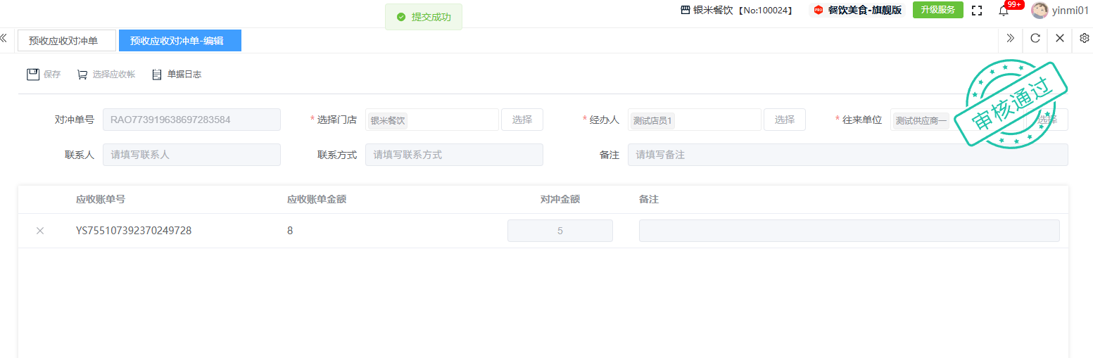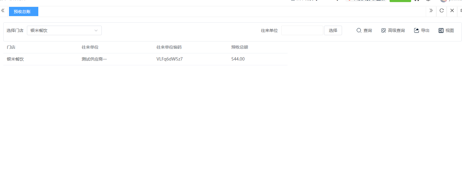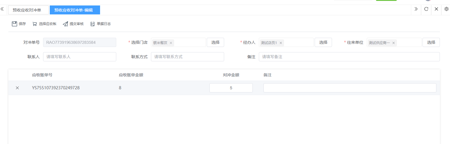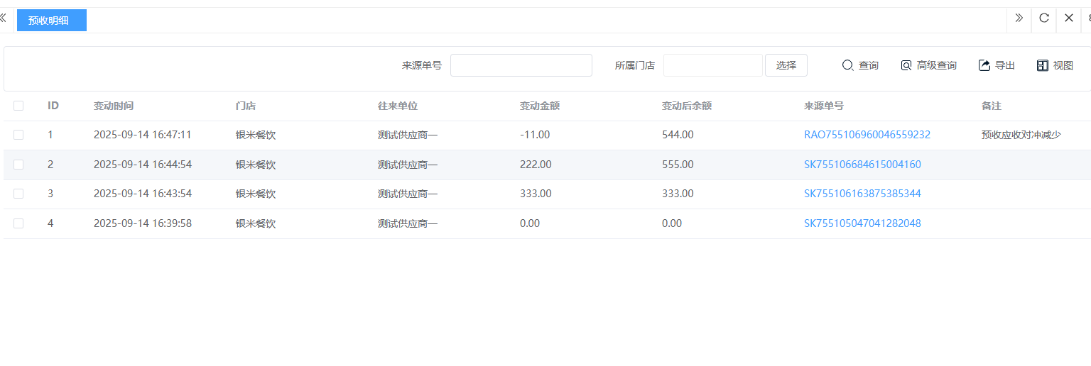 ## 预收款 预收款是企业根据合同约定,在向客户提供商品或服务前,预先收取的款项。包含:预收总账、预收明细、预收应收对冲单。 如图所示  一、预收总账是财务会计系统中,用于汇总核算企业所有预收账款总括情况的统驭性账户,属于负债类科目。可选择门店查看。包含:门店、往来单位、往来单位编码、预收总额。 如图所示  二、预收明细是企业财务管理中,按客户、项目或合同等维度建立的预收账款辅助核算账,详细记录每笔预收款的收取、结转收入及余额信息。包含:变动金额、门店、往来单位、变动金额、变动后金额、来源单号(点击进入预收应收对冲单)。 如图所示  三、预收应收对冲单是企业用于核销预收账款与应收账款的内部会计凭证。当企业向客户完成商品交付或服务提供后,将已预收的款项转为正式收入,并核销对应的应收账款。包含:单据编号、门店、往来单位等。功能包含:新增、查看、编辑、审核、删除、详情。 如图所示  1、点击“新增”、录入所有相关内容,点击“保存 ”即可完成新增。如图所示  A、选择收入门店、往来单位、经办人。如图所示  B、填写联系人、联系方式、备注。如图所示  C、点击“选择应付帐,选择账单,需要输入对冲金额。点击“X”可删除项目。如图所示  2、点击“查看”或者“单据编号”可查看预付应付对冲单的详情。如图所示  3、点击“编辑”可修改预付应付对冲单的所有内容,修改完成后点击“保存”即可完成,然后点击”提交审核“。 如图所示  4、点击“审核“,选择”通过“或者”拒绝“,即可完成审核。如图所示  5、点击”删除“,右侧为”行删除“,左上角为”列删除“。如图所示  6、点击“详情”,便于查看门店的应收账单的明细。如图所示