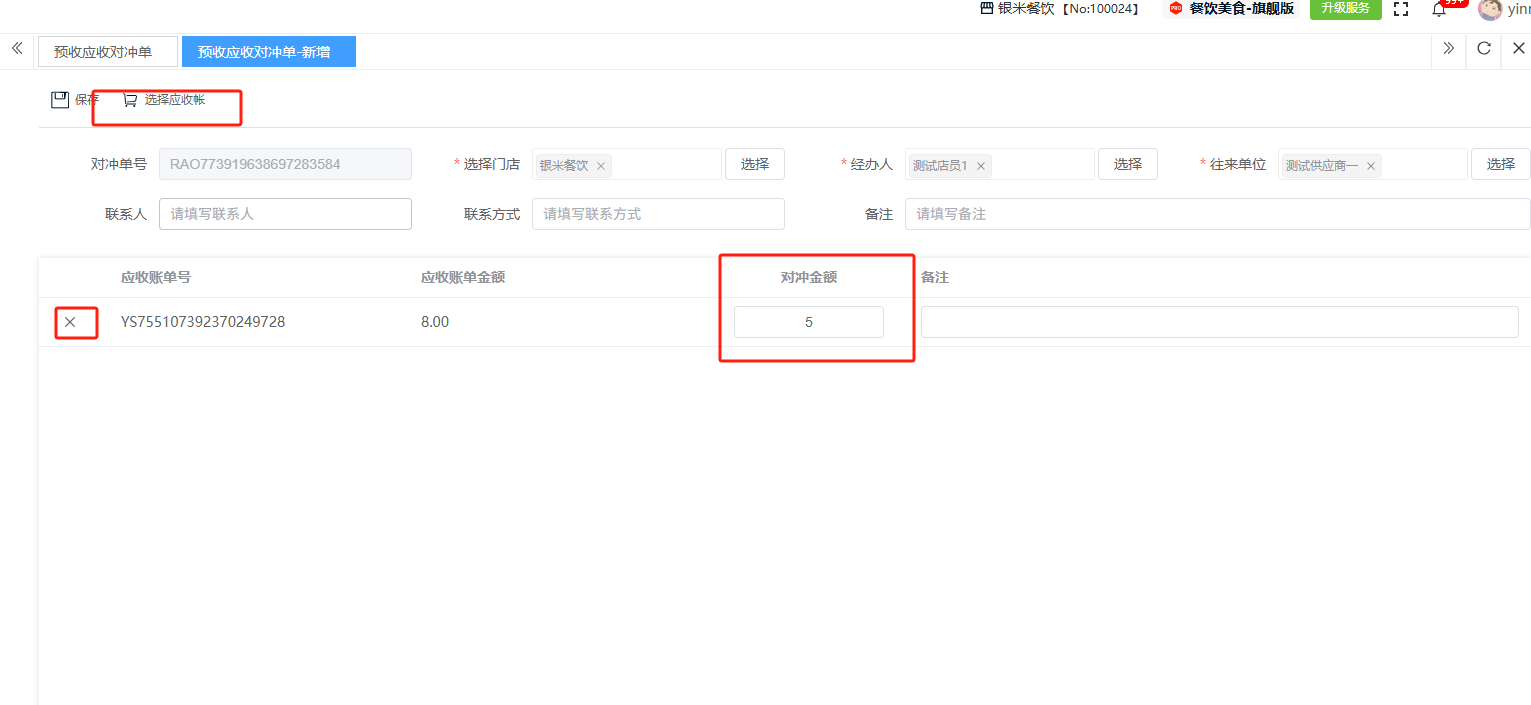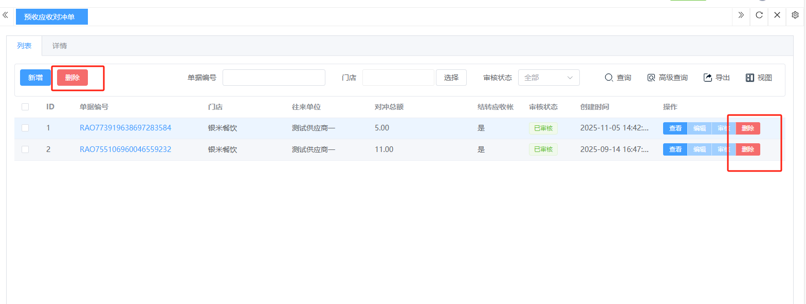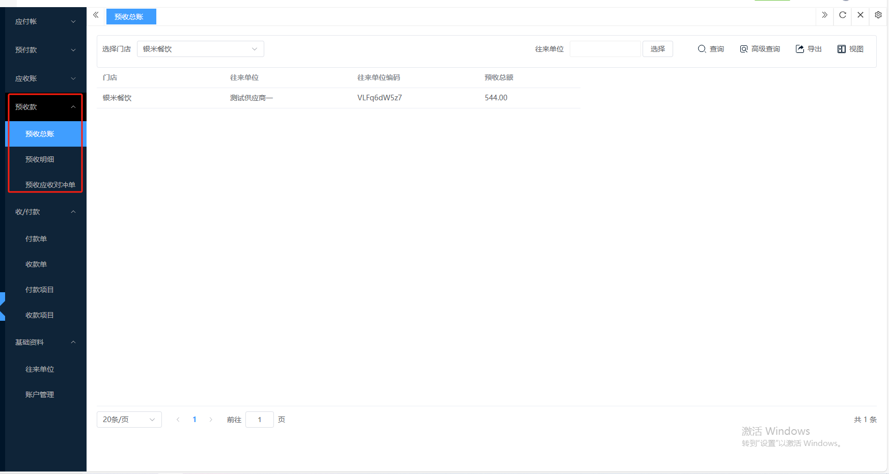 ## 预收款 预收款是企业根据合同约定,在向客户提供商品或服务前,预先收取的款项。包含:预收总账、预收明细、预收应收对冲单。 如图所示  一、预收总账是财务会计系统中,用于汇总核算企业所有预收账款总括情况的统驭性账户,属于负债类科目。可选择门店查看。包含:门店、往来单位、往来单位编码、预收总额。 如图所示  二、预收明细是企业财务管理中,按客户、项目或合同等维度建立的预收账款辅助核算账,详细记录每笔预收款的收取、结转收入及余额信息。包含:变动金额、门店、往来单位、变动金额、变动后金额、来源单号(点击进入预收应收对冲单)。 如图所示  三、预收应收对冲单是企业用于核销预收账款与应收账款的内部会计凭证。当企业向客户完成商品交付或服务提供后,将已预收的款项转为正式收入,并核销对应的应收账款。包含:单据编号、门店、往来单位等。功能包含:新增、查看、编辑、审核、删除、详情。 如图所示  1、点击“新增”、录入所有相关内容,点击“保存 ”即可完成新增。如图所示  A、选择收入门店、往来单位、经办人。如图所示  B、填写联系人、联系方式、备注。如图所示  C、点击“选择应付帐,选择账单,需要输入对冲金额。点击“X”可删除项目。如图所示  2、点击“查看”或者“单据编号”可查看预付应付对冲单的详情。如图所示  3、点击“编辑”可修改预付应付对冲单的所有内容,修改完成后点击“保存”即可完成,然后点击”提交审核“。 如图所示  4、点击“审核“,选择”通过“或者”拒绝“,即可完成审核。如图所示  5、点击”删除“,右侧为”行删除“,左上角为”列删除“。如图所示  6、点击“详情”,便于查看门店的应收账单的明细。如图所示