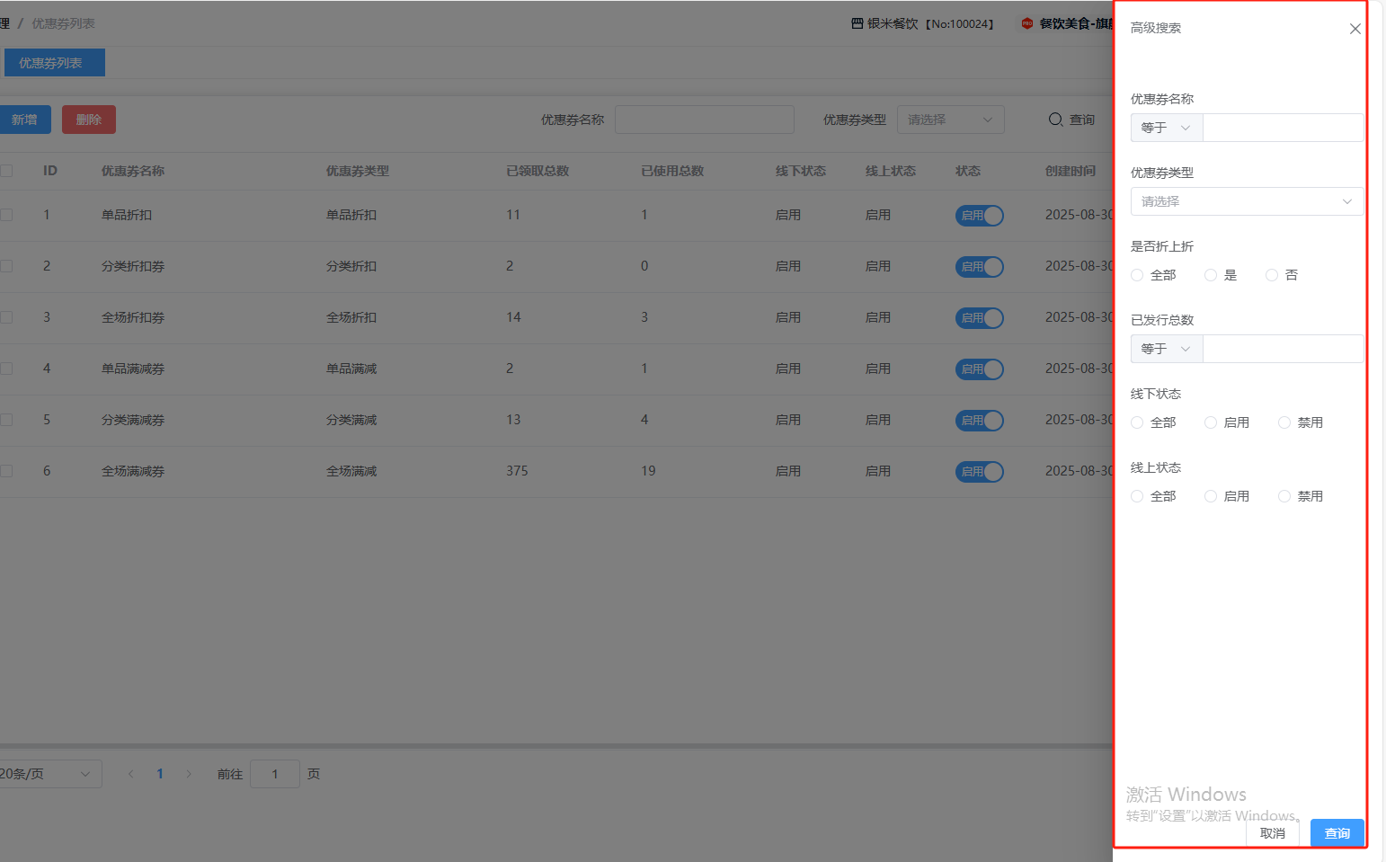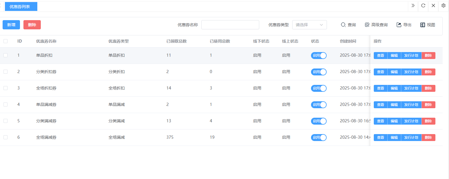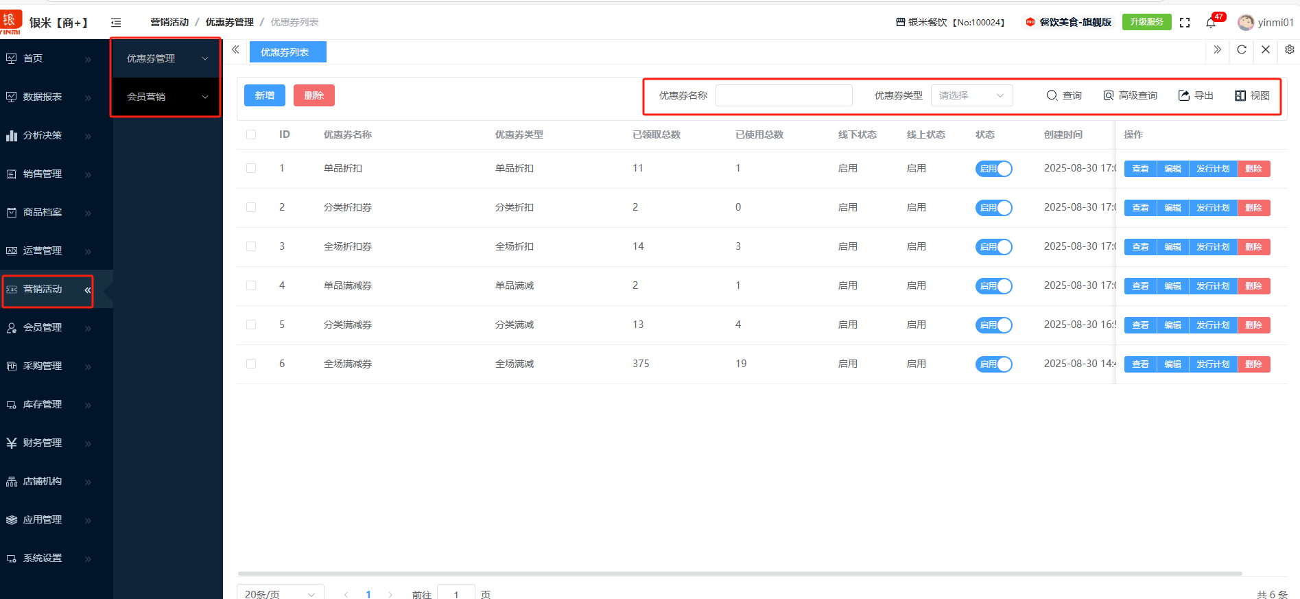 ## 营销活动 营销活动是企业为实现特定目标(如提升销量、推广新品、增强忠诚度),在特定时期内整合资源、策划主题并执行一系列营销动作的战略性项目。包含:优惠劵管理、会员营销。功能包含:查询、高级查询、导出、视图。 如图所示  1、可按优惠劵名称,优惠劵类型等查询。如图所示  2、可点击”高级查询“,输入优惠劵名称,优惠劵类型等,点击查询即可。如图所示  3、导出是将数据(如报表、列表)转换为可在电脑上独立存储、编辑和分享的文件。点击”导出“,再点击”创建导出任务“,查看详情,下载表格。无需导出点击”删除“即可。 如图所示  4、视图是允许用户根据不同角色和场景,自定义屏幕上显示哪些信息、以何种方式布局,从而实现个性化、高效的操作界面。如图所示