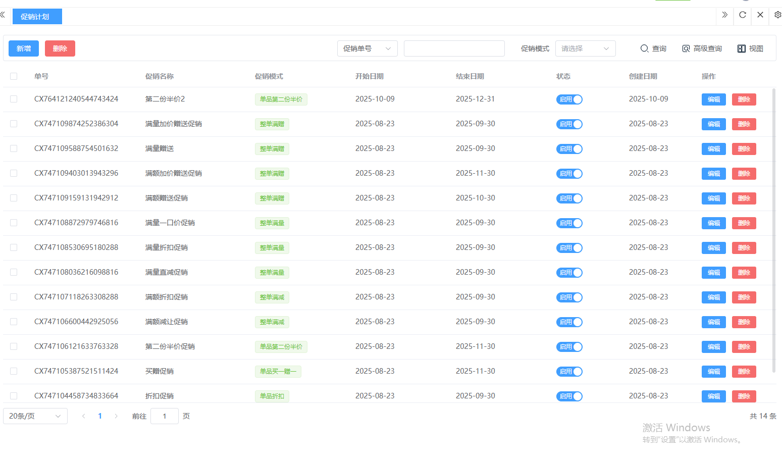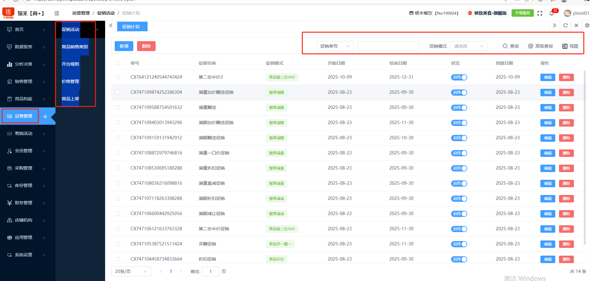 ## 运营管理 运营管理是通过计划、组织、实施和控制一系列核心业务流程,以最高效率和最佳质量交付产品或服务,从而持续实现企业战略目标的综合性管理活动。包含:促销活动、商品销售类别、开台规则、价格管理、商品上架。功能包含:查询、高级查询、视图。 如图所示  1、可按单号,模式等查询。如图所示  2、可点击”高级查询“,输入名称、模式、商品条形码等,点击查询即可。如图所示  3、视图是允许用户根据不同角色和场景,自定义屏幕上显示哪些信息、以何种方式布局,从而实现个性化、高效的操作界面。如图所示