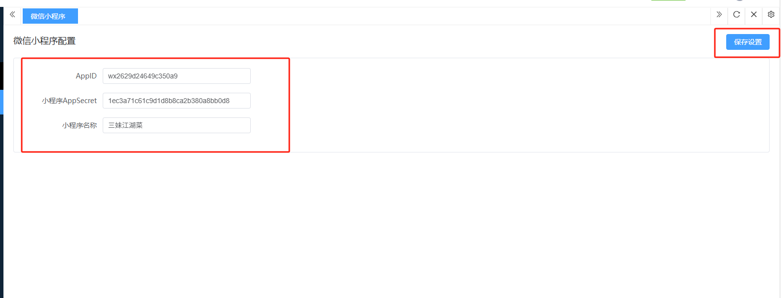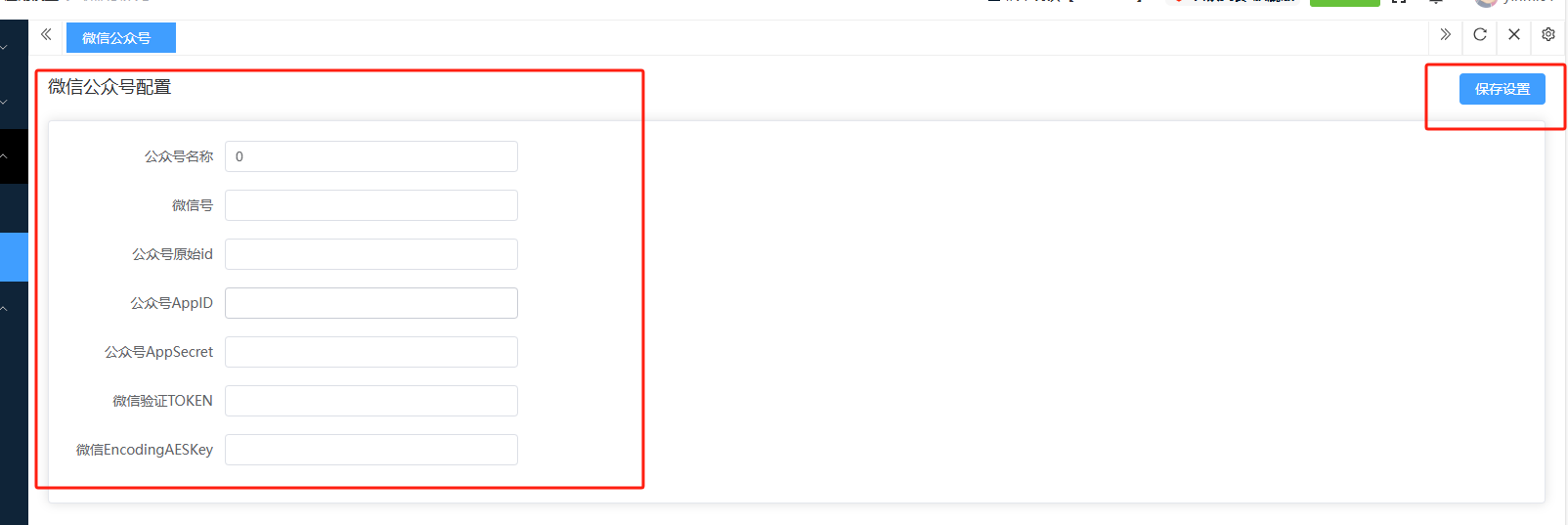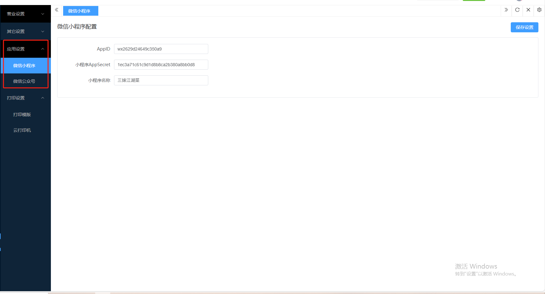 ## 应用设置 应用设置是管理系统各业务模块运行规则与外部平台对接的中枢控制台。包含:微信小程序、微信公众号。 如图所示  一、微信小程序是企业基于微信生态开发的轻量级应用,通过扫码或搜索即可使用,无需下载安装。按照要求填写微信小程序的接口,名称。点击“保存设置”即可完成。 如图所示  二、微信公众号是企业及组织在微信平台建立的官方发声与用户运营阵地,通过内容与服务连接实现用户沉淀与转化。按照要求填写微信公众号的配置内容,点击“保存设置”即可完成。 如图所示