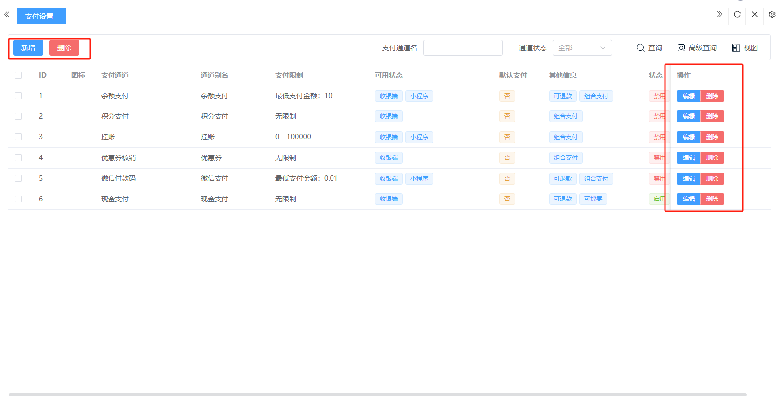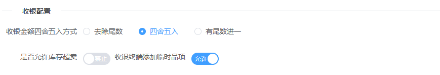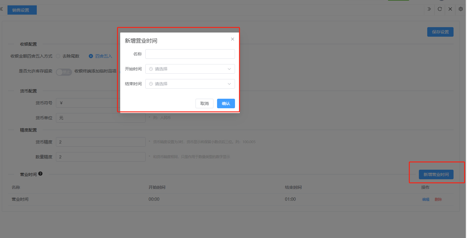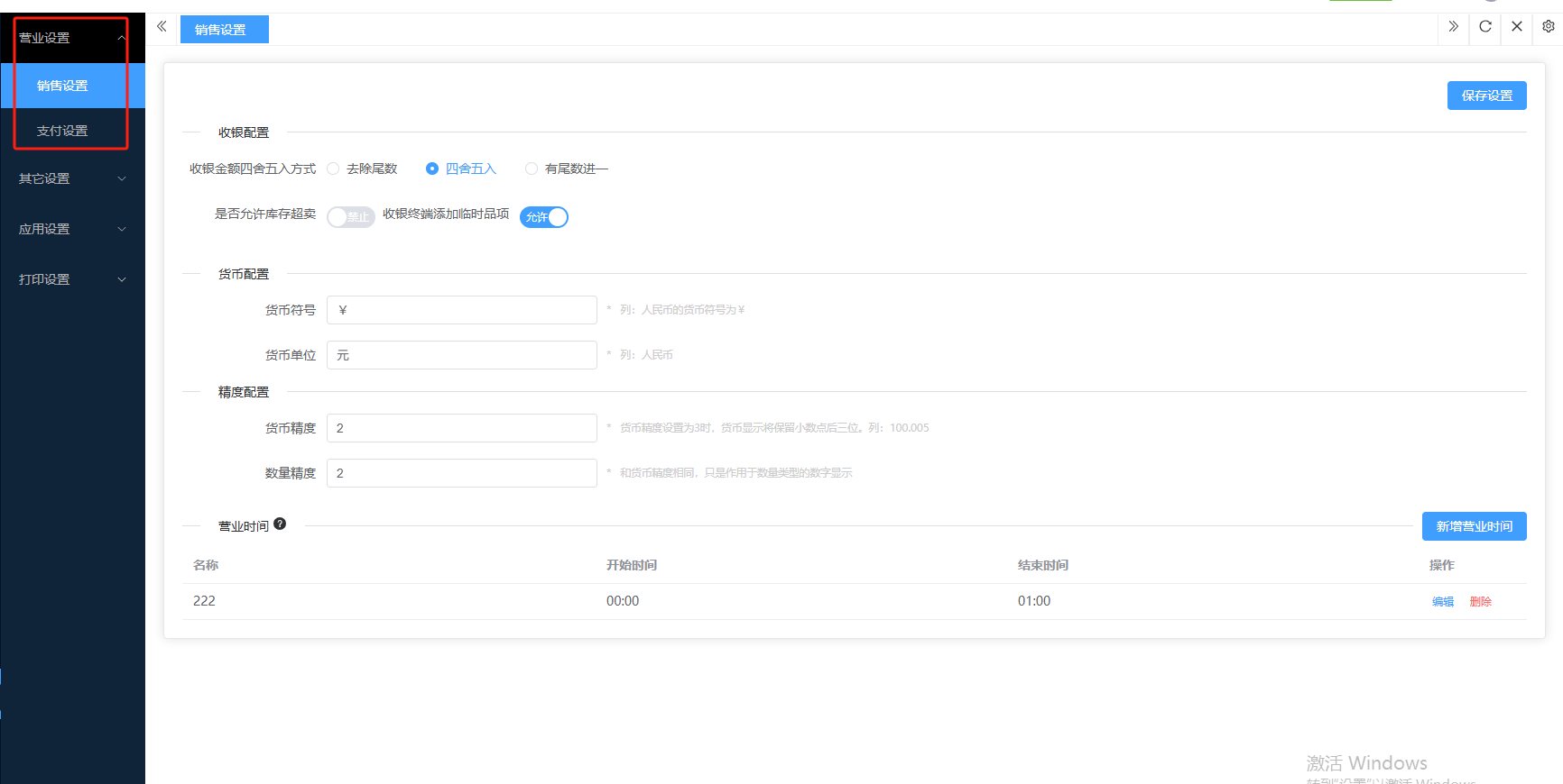 ## 营业设置 营业设置是系统用于配置门店营业规则与运营参数的核心模块,通过标准化设置保障日常经营有序进行。包含:销售设置、支付设置。 如图所示  一、销售设置是系统用于配置销售业务规则与交易参数的核心模块,通过标准化设置保障销售流程规范有序。按照设置内容完成所有设置,点击“保存设置”即可完成。 如图所示  1、配置“收银配置”,选择收银金额四舍五入的方式,去除尾数(对订单总额的零头进行抹零处理)、四舍五入(按“逢五进一、逢四舍去”)、有尾数进一(只要订单金额存在指定尾数,即向上进位至最接近的整数单位),选择是否允许库存超卖,选择是否允许收银端添加临时商品。 如图所示  2、配置“货币配置”,设置货币符号、货币单位。如图所示  3、配置“精度配置”。设置货币精度、数量精度。如图所示  4、配置“营业时间”(只作为报表计时段,不影响正常营业销售),点击“新增营业时间”,录入名称、选择起止时间,点击“确认”即可完成。点击“编辑”可修改全部内容,点击“删除”可删除该条营业时间。如图所示  二、支付设置是系统用于管理和配置各类支付方式参数的核心模块,确保交易流程顺畅、资金安全及对账准确。包含:图标、支付通道、通道别名等。功能包含:新增、编辑、删除。  1、点击“新增”、录入所有相关内容,点击“确认 ”即可完成新增。如图所示  A、录入支付名称。如图所示  B、选择渠道类型。如图所示  C、选择适用门店。如图所示  D、点击“+"上传支付图标。如图所示  E、选择启用功能端(收银端和小程序)、选择组合支付(支付或不支持)、选择默认支付渠道(是或否)、选择渠道启用状态(正常或禁用)。如图所示  2、点击“编辑”可修改支付渠道的所有内容,修改完成后点击“确认”即可完成。如图所示  3、点击”删除“,右侧为”行删除“,左上角为”列删除“。如图所示