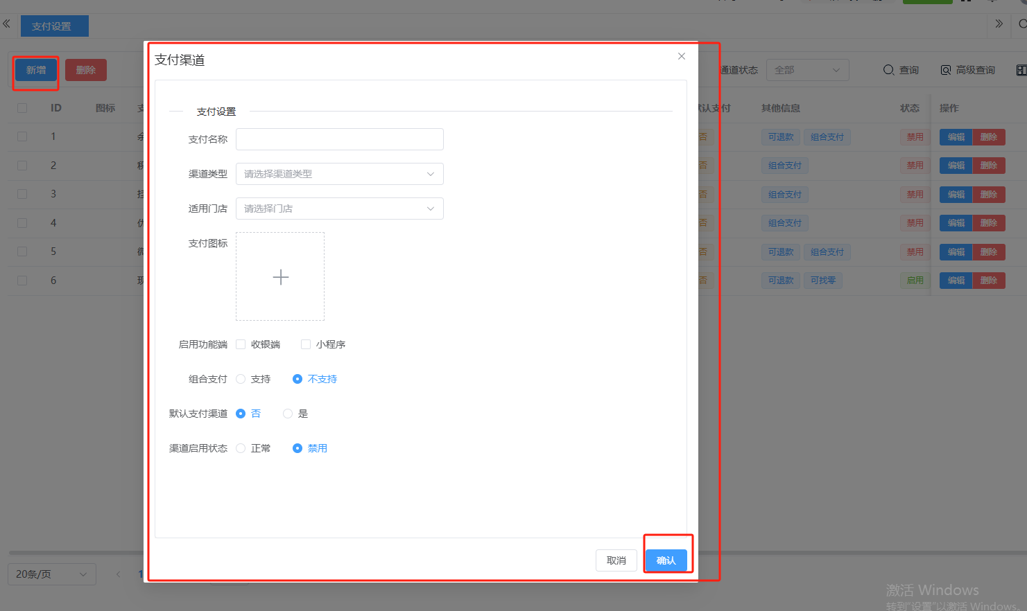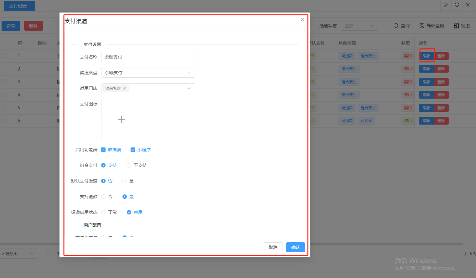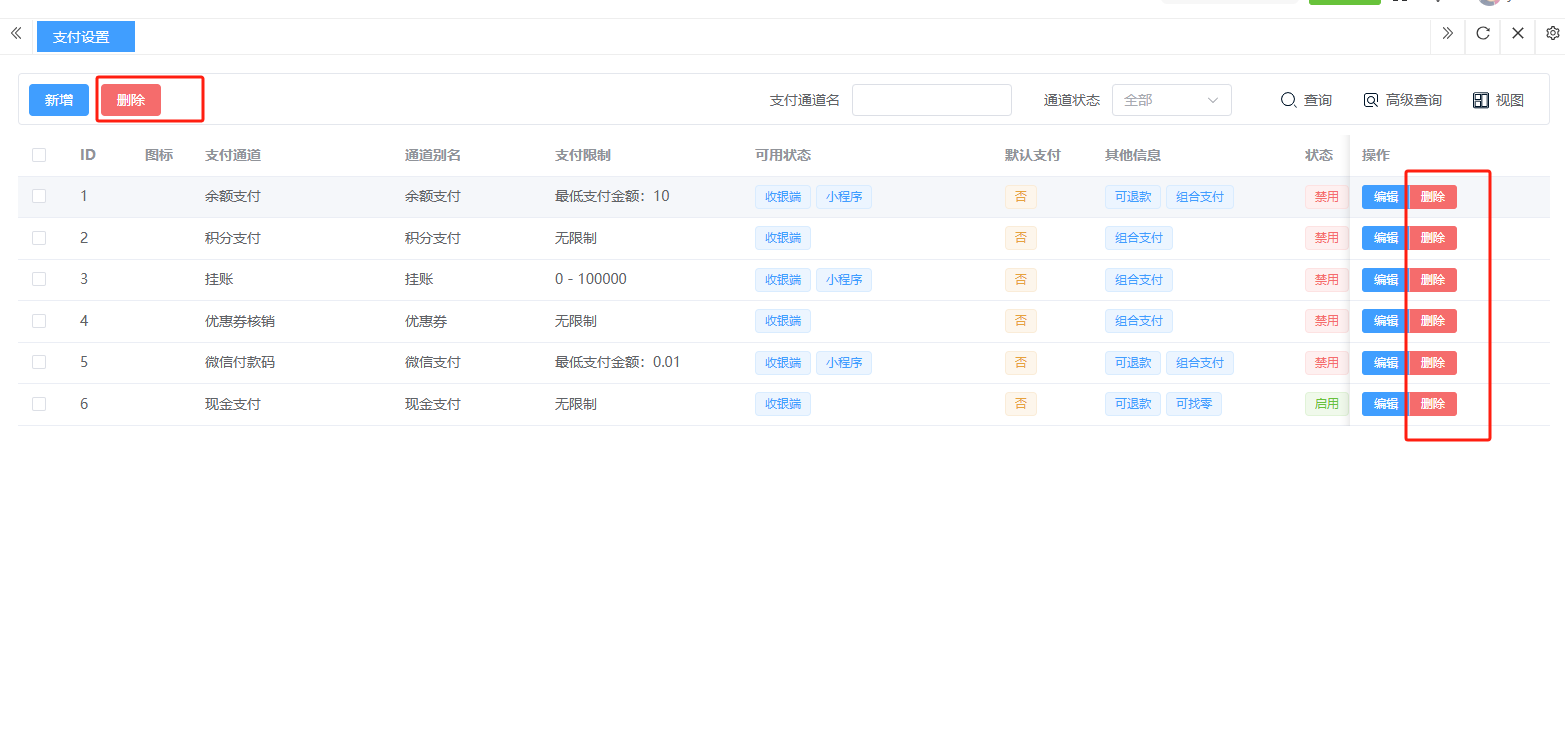 ## 营业设置 营业设置是系统用于配置门店营业规则与运营参数的核心模块,通过标准化设置保障日常经营有序进行。包含:销售设置、支付设置。 如图所示  一、销售设置是系统用于配置销售业务规则与交易参数的核心模块,通过标准化设置保障销售流程规范有序。按照设置内容完成所有设置,点击“保存设置”即可完成。 如图所示  1、配置“收银配置”,选择收银金额四舍五入的方式,去除尾数(对订单总额的零头进行抹零处理)、四舍五入(按“逢五进一、逢四舍去”)、有尾数进一(只要订单金额存在指定尾数,即向上进位至最接近的整数单位),选择是否允许库存超卖,选择是否允许收银端添加临时商品。 如图所示  2、配置“货币配置”,设置货币符号、货币单位。如图所示  3、配置“精度配置”。设置货币精度、数量精度。如图所示  4、配置“营业时间”(只作为报表计时段,不影响正常营业销售),点击“新增营业时间”,录入名称、选择起止时间,点击“确认”即可完成。点击“编辑”可修改全部内容,点击“删除”可删除该条营业时间。如图所示  二、支付设置是系统用于管理和配置各类支付方式参数的核心模块,确保交易流程顺畅、资金安全及对账准确。包含:图标、支付通道、通道别名等。功能包含:新增、编辑、删除。  1、点击“新增”、录入所有相关内容,点击“确认 ”即可完成新增。如图所示  A、录入支付名称。如图所示  B、选择渠道类型。如图所示  C、选择适用门店。如图所示  D、点击“+"上传支付图标。如图所示  E、选择启用功能端(收银端和小程序)、选择组合支付(支付或不支持)、选择默认支付渠道(是或否)、选择渠道启用状态(正常或禁用)。如图所示  2、点击“编辑”可修改支付渠道的所有内容,修改完成后点击“确认”即可完成。如图所示  3、点击”删除“,右侧为”行删除“,左上角为”列删除“。如图所示