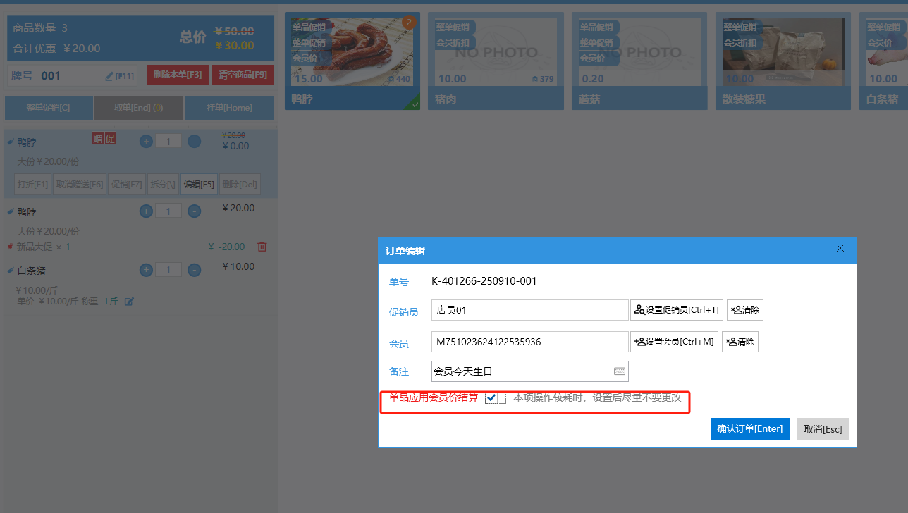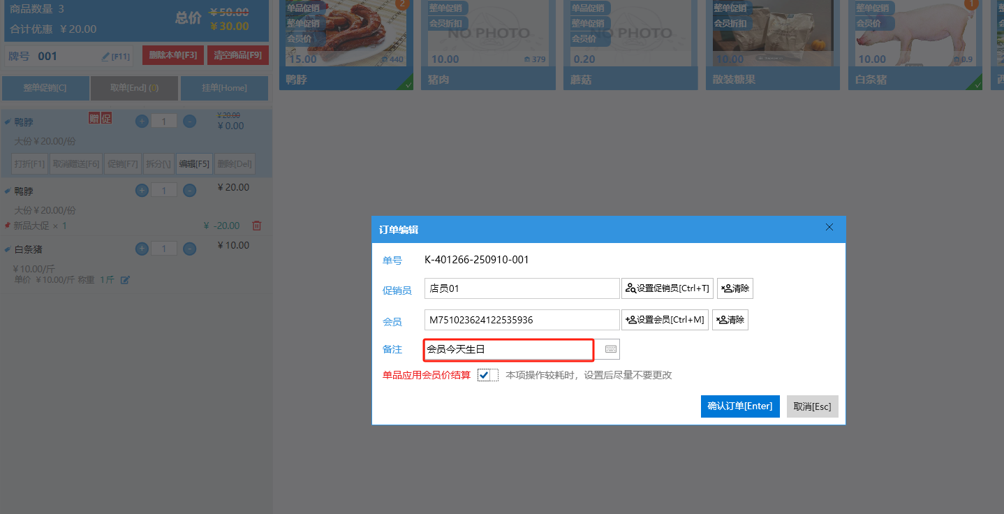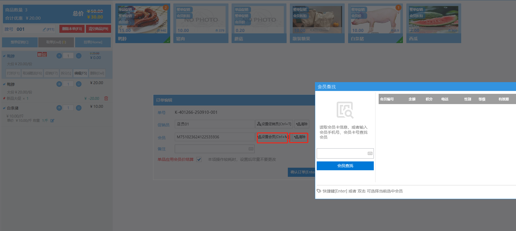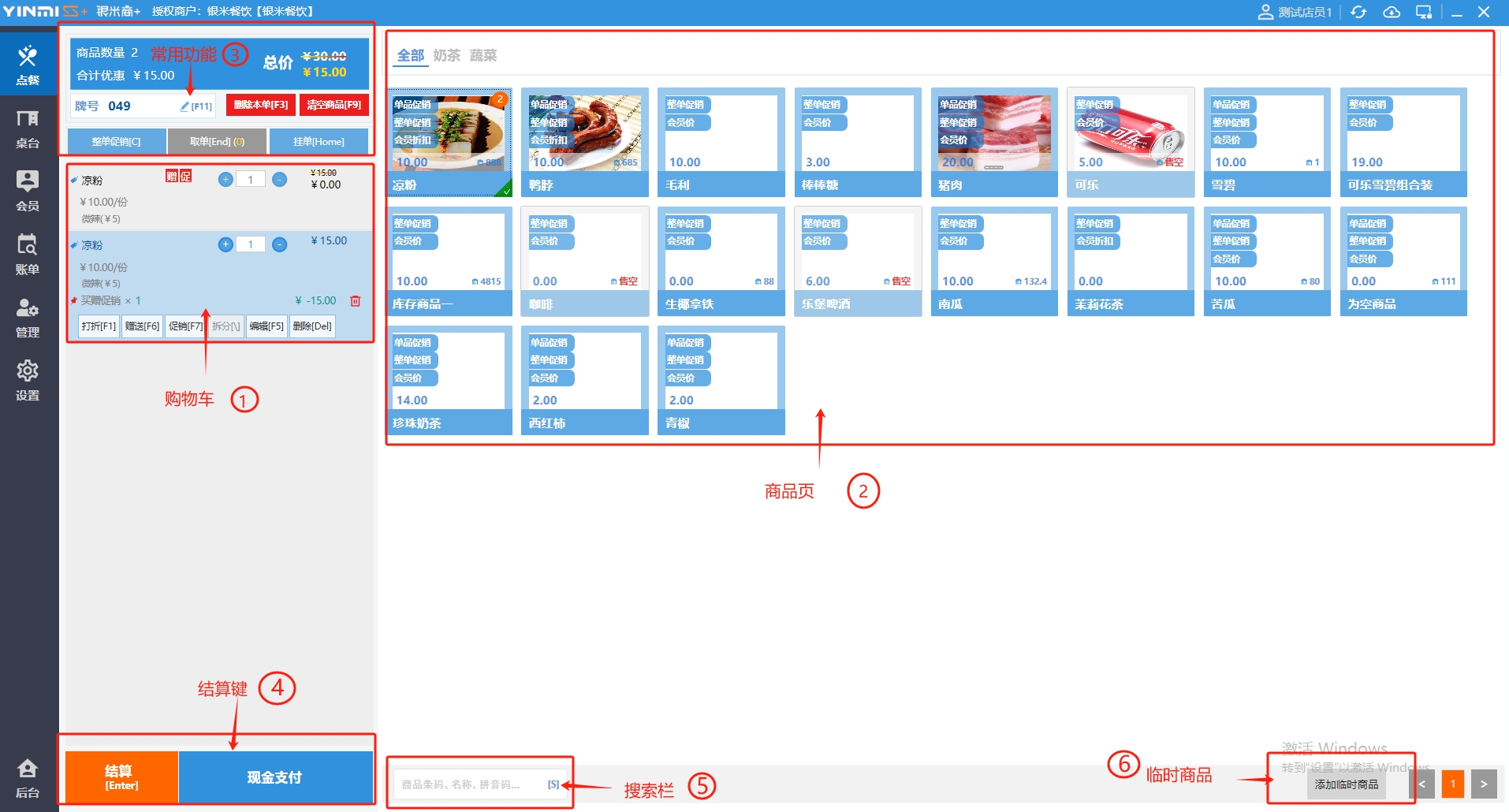 **点餐界面** ”点餐“又称之为快餐模式操作界面。是完成交易、处理资金的核心区域,位于收银界面的右侧。其核心点餐功能围绕高效处理商品、灵活应用促销、便捷管理订单而设计。包含:购物车、商品页、常用功能、结算键、搜索栏、临时商品。 如图所示  1、购物车 购物车是临时承载和管理顾客当前所选的所有商品,作为结算前的核心操作界面,是完成交易的“中转站”。包括:订单编辑、订单信息、商品总计。  A、订单编辑 订单编辑是在订单完成结算前,对促销员信息、会员信息的修改和调整,确保最终订单的准确性。点击”订单编辑“中”设置促销员“选择促销员点击确认即可;如需更换,再次点击”设置促销员“选择新促销员点击确认即可完成更换;如无需促销员信息 。点击消除即可消除促销员信息。 如图所示  点击”设置会员“,出现会员搜索页面,通过读取会员卡新年,或者输入会员手机号,会员卡信息点击会员搜索即可出现会员信息,双击会员信息即可完成设置;如需更换,再次点击”设置会员“选择新会员点击确认即可完成更换;如无需会员信息 。点击消除即可消除会员信息。 如图所示  点击”备注“,即可输入订单的相关备注信息。 如图所示  单品应用会员价结算是为特定会员群体提供专属的单品优惠价格,实现精准营销,提升会员忠诚度和复购率。如需要使用,点击方框打”✔“,无需要则不打。点击确认订单即可完成所有设置。 如图所示  B、订单信息 订单信息呈现当前订单的全部明细,供顾客和收银员核对,并作为价格计算与后续操作的基础。包含:商品名称、规格,单价、数量和优惠,可以打折、赠送、促销、拆分、编辑、删除。 如图所示  打折是收银员手动操作对单个商品进行人工打折,折扣范围由高到底从1-99折.点击打折,输入折扣数字,点击确认即可打折;如需取消打折,点击取消打折即可。 如图所示   赠送是收银员手动操作免费送出订单中某个商品。点击赠送即可完成;如需取消,点击取消赠送即可。 如图所示  促销是收银员根据后台制定的促销活动,对适合的商品添加优惠活动,分手动促销和自动促销。点击促销进入促销活动页面点击所需添加的促销然后确认选择即可;如需取消,点击促销活动页面,双击已添加的促销活动即可取消。 如图所示  拆分是收银员对订单商品数量为2个及以上的商品,灵活分割的操作。点击拆分,输入拆分数量,点击确定即可完成。如图所示  编辑是收银员对多规格商品的商品规格和数量进行调整。点击编辑,可对商品数量进行调整,也可以对商品规格进行调整,调整后点击确认选择即可完成。 如图所示  删除是收银员快速删除商品的操作。点击删除,点击确认即可删除;无需则点击取消。 如图所示  C、商品总计 商品总计是在结算前,对当前订单中所有商品的金额、数量和优惠进行一次性汇总计算,并清晰展示明细和最终结果。如图所示  2、商品页 商品页可显示商品名称,单价,库存 ,促销活动,会员活动以及购买的数量。 如图所示  3、常用功能 常用功能是为收银员快捷处理商品订单而服务的常用功能汇总。包含有:整单促销、取单 、挂单、删除本单,清空商品. 如图所示  A、整单促销 整单促销是通过设置基于订单总金额或条件的优惠规则,包含:满减、满赠 、满量。点击整单促销选择商品能参与的促销活动,点击即可参加。 如图所示  B、取单 取单是快速恢复之前暂时保存的未付款订单,继续进行处理和结算,保证销售流程不中断。点击取单,选择未支付或部分支付的订单,点击确认订单即可。 如图所示  C、挂单 挂单是暂停当前未完成的订单,临时保存起来,以便先处理其他更紧急的事务,之后可快速恢复继续操作。点击挂单,确认挂单点击”确认“即可,不挂单点击”取消“即可。如图所示  D、删除本单 删除本单是为了彻底取消并删除当前正在操作的未结算订单,通常用于作废无效或错误的交易。点击删除本单,确认删除点击”确认“即可,不删除点击”取消“即可。如图所示  E、清空商品 清空商品是一键移除当前购物车内的所有商品,为一笔新订单做准备。点击清空商品,确认清空点击”确认“即可,不清空点击”取消“即可。如图所示  4、结算键 结算键是作为收银流程的最终确认和付款执行界面,完成从商品清单到资金收讫的最终转换。包含有:支付方式、选择会员 、人工折扣、辅助键盘,确定结算。 A、支付方式 支付方式是顾客提供多样化的付款选择,并准确、安全地完成资金接收**,**是交易流程的最终环节。包含:现金支付,微信支付,余额支付,优惠劵支付等多种付款方式,并可以选择2种或者多种的组合支付方式。 如图所示  结算记录可以查看完成部分支付的订单详情,点击”结算记录“即可查看。 如图所示  B、选择会员 选择会员是通过读取会员卡新年,或者输入会员手机号,会员卡信息点击会员搜索即可出现会员信息,双击会员信息即可完成设置;会员可查看会员详情,显示余额、积分,选择是否使用单品会员价、会员生日折扣价;如需更换会员信息,点击”更换“即可重新查找会员信息;如无需使用会员点击”清除“即可。 如图所示  C、人工折扣 人工折扣是授予经过授权的收银员(如店员01)一种灵活的权力,使其能够根据实际情况,临时为顾客提供额外的价格优惠。包含:免单、改价、打