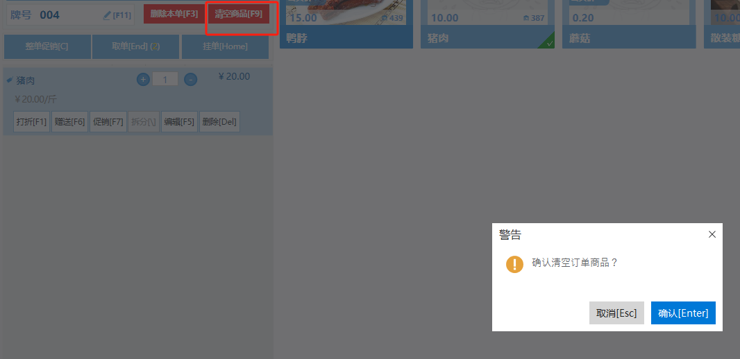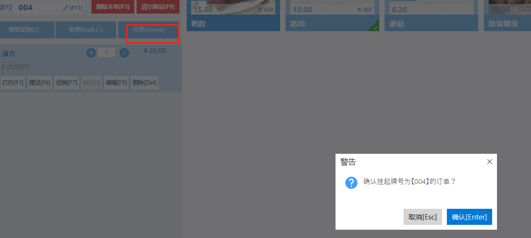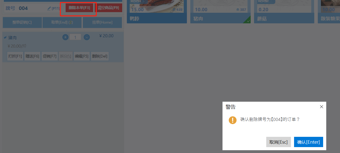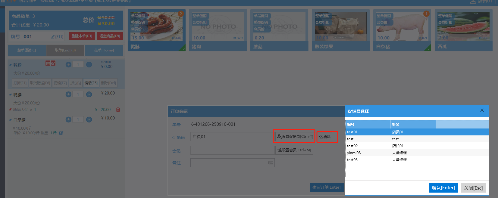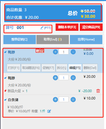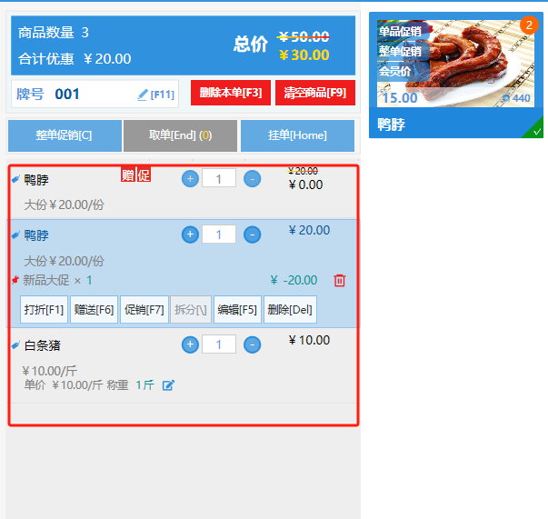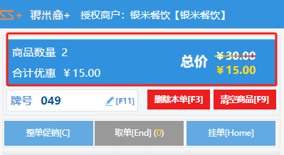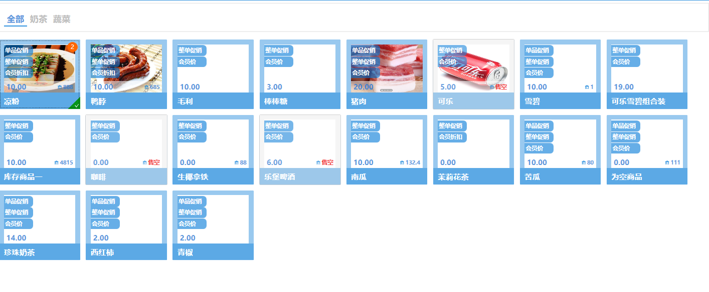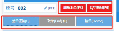 **点餐界面** ”点餐“又称之为快餐模式操作界面。是完成交易、处理资金的核心区域,位于收银界面的右侧。其核心点餐功能围绕高效处理商品、灵活应用促销、便捷管理订单而设计。包含:购物车、商品页、常用功能、结算键、搜索栏、临时商品。 如图所示  1、购物车 购物车是临时承载和管理顾客当前所选的所有商品,作为结算前的核心操作界面,是完成交易的“中转站”。包括:订单编辑、订单信息、商品总计。  A、订单编辑 订单编辑是在订单完成结算前,对促销员信息、会员信息的修改和调整,确保最终订单的准确性。点击”订单编辑“中”设置促销员“选择促销员点击确认即可;如需更换,再次点击”设置促销员“选择新促销员点击确认即可完成更换;如无需促销员信息 。点击消除即可消除促销员信息。 如图所示  点击”设置会员“,出现会员搜索页面,通过读取会员卡新年,或者输入会员手机号,会员卡信息点击会员搜索即可出现会员信息,双击会员信息即可完成设置;如需更换,再次点击”设置会员“选择新会员点击确认即可完成更换;如无需会员信息 。点击消除即可消除会员信息。 如图所示  点击”备注“,即可输入订单的相关备注信息。 如图所示  单品应用会员价结算是为特定会员群体提供专属的单品优惠价格,实现精准营销,提升会员忠诚度和复购率。如需要使用,点击方框打”✔“,无需要则不打。点击确认订单即可完成所有设置。 如图所示  B、订单信息 订单信息呈现当前订单的全部明细,供顾客和收银员核对,并作为价格计算与后续操作的基础。包含:商品名称、规格,单价、数量和优惠,可以打折、赠送、促销、拆分、编辑、删除。 如图所示  打折是收银员手动操作对单个商品进行人工打折,折扣范围由高到底从1-99折.点击打折,输入折扣数字,点击确认即可打折;如需取消打折,点击取消打折即可。 如图所示   赠送是收银员手动操作免费送出订单中某个商品。点击赠送即可完成;如需取消,点击取消赠送即可。 如图所示  促销是收银员根据后台制定的促销活动,对适合的商品添加优惠活动,分手动促销和自动促销。点击促销进入促销活动页面点击所需添加的促销然后确认选择即可;如需取消,点击促销活动页面,双击已添加的促销活动即可取消。 如图所示  拆分是收银员对订单商品数量为2个及以上的商品,灵活分割的操作。点击拆分,输入拆分数量,点击确定即可完成。如图所示  编辑是收银员对多规格商品的商品规格和数量进行调整。点击编辑,可对商品数量进行调整,也可以对商品规格进行调整,调整后点击确认选择即可完成。 如图所示  删除是收银员快速删除商品的操作。点击删除,点击确认即可删除;无需则点击取消。 如图所示  C、商品总计 商品总计是在结算前,对当前订单中所有商品的金额、数量和优惠进行一次性汇总计算,并清晰展示明细和最终结果。如图所示  2、商品页 商品页可显示商品名称,单价,库存 ,促销活动,会员活动以及购买的数量。 如图所示  3、常用功能 常用功能是为收银员快捷处理商品订单而服务的常用功能汇总。包含有:整单促销、取单 、挂单、删除本单,清空商品. 如图所示  A、整单促销 整单促销是通过设置基于订单总金额或条件的优惠规则,包含:满减、满赠 、满量。点击整单促销选择商品能参与的促销活动,点击即可参加。 如图所示  B、取单 取单是快速恢复之前暂时保存的未付款订单,继续进行处理和结算,保证销售流程不中断。点击取单,选择未支付或部分支付的订单,点击确认订单即可。 如图所示  C、挂单 挂单是暂停当前未完成的订单,临时保存起来,以便先处理其他更紧急的事务,之后可快速恢复继续操作。点击挂单,确认挂单点击”确认“即可,不挂单点击”取消“即可。如图所示  D、删除本单 删除本单是为了彻底取消并删除当前正在操作的未结算订单,通常用于作废无效或错误的交易。点击删除本单,确认删除点击”确认“即可,不删除点击”取消“即可。如图所示  E、清空商品 清空商品是一键移除当前购物车内的所有商品,为一笔新订单做准备。点击清空商品,确认清空点击”确认“即可,不清空点击”取消“即可。如图所示  4、结算键 结算键是作为收银流程的最终确认和付款执行界面,完成从商品清单到资金收讫的最终转换。包含有:支付方式、选择会员 、人工折扣、辅助键盘,确定结算。 A、支付方式 支付方式是顾客提供多样化的付款选择,并准确、安全地完成资金接收**,**是交易流程的最终环节。包含:现金支付,微信支付,余额支付,优惠劵支付等多种付款方式,并可以选择2种或者多种的组合支付方式。 如图所示  结算记录可以查看完成部分支付的订单详情,点击”结算记录“即可查看。 如图所示  B、选择会员 选择会员是通过读取会员卡新年,或者输入会员手机号,会员卡信息点击会员搜索即可出现会员信息,双击会员信息即可完成设置;会员可查看会员详情,显示余额、积分,选择是否使用单品会员价、会员生日折扣价;如需更换会员信息,点击”更换“即可重新查找会员信息;如无需使用会员点击”清除“即可。 如图所示  C、人工折扣 人工折扣是授予经过授权的收银员(如店员01)一种灵活的权力,使其能够根据实际情况,临时为顾客提供额外的价格优惠。包含:免单、改价、打