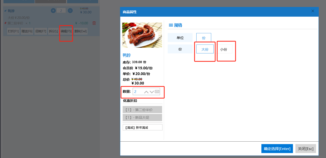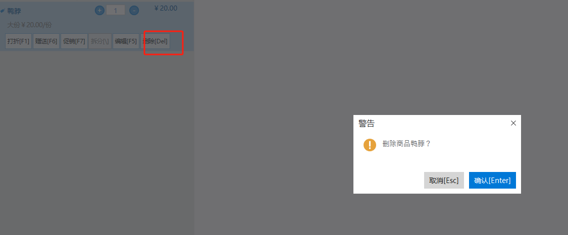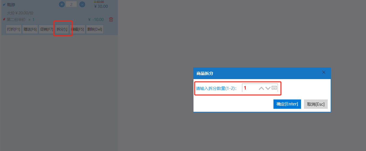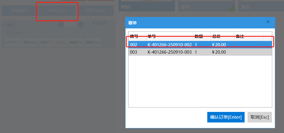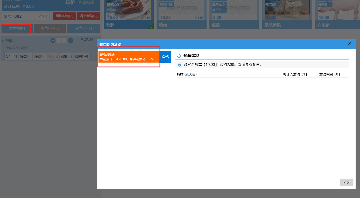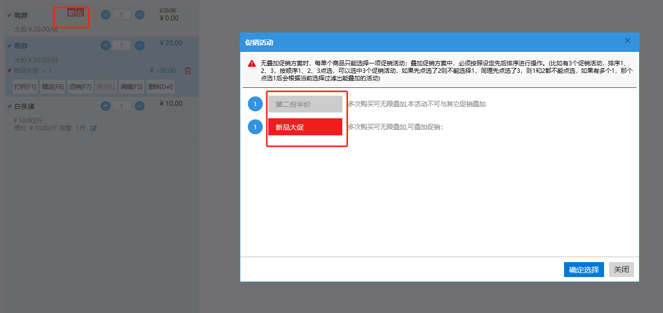**点餐界面** ”点餐“又称之为快餐模式操作界面。是完成交易、处理资金的核心区域,位于收银界面的右侧。其核心点餐功能围绕高效处理商品、灵活应用促销、便捷管理订单而设计。包含:购物车、商品页、常用功能、结算键、搜索栏、临时商品。 如图所示  1、购物车 购物车是临时承载和管理顾客当前所选的所有商品,作为结算前的核心操作界面,是完成交易的“中转站”。包括:订单编辑、订单信息、商品总计。  A、订单编辑 订单编辑是在订单完成结算前,对促销员信息、会员信息的修改和调整,确保最终订单的准确性。点击”订单编辑“中”设置促销员“选择促销员点击确认即可;如需更换,再次点击”设置促销员“选择新促销员点击确认即可完成更换;如无需促销员信息 。点击消除即可消除促销员信息。 如图所示  点击”设置会员“,出现会员搜索页面,通过读取会员卡新年,或者输入会员手机号,会员卡信息点击会员搜索即可出现会员信息,双击会员信息即可完成设置;如需更换,再次点击”设置会员“选择新会员点击确认即可完成更换;如无需会员信息 。点击消除即可消除会员信息。 如图所示  点击”备注“,即可输入订单的相关备注信息。 如图所示  单品应用会员价结算是为特定会员群体提供专属的单品优惠价格,实现精准营销,提升会员忠诚度和复购率。如需要使用,点击方框打”✔“,无需要则不打。点击确认订单即可完成所有设置。 如图所示  B、订单信息 订单信息呈现当前订单的全部明细,供顾客和收银员核对,并作为价格计算与后续操作的基础。包含:商品名称、规格,单价、数量和优惠,可以打折、赠送、促销、拆分、编辑、删除。 如图所示  打折是收银员手动操作对单个商品进行人工打折,折扣范围由高到底从1-99折.点击打折,输入折扣数字,点击确认即可打折;如需取消打折,点击取消打折即可。 如图所示   赠送是收银员手动操作免费送出订单中某个商品。点击赠送即可完成;如需取消,点击取消赠送即可。 如图所示  促销是收银员根据后台制定的促销活动,对适合的商品添加优惠活动,分手动促销和自动促销。点击促销进入促销活动页面点击所需添加的促销然后确认选择即可;如需取消,点击促销活动页面,双击已添加的促销活动即可取消。 如图所示  拆分是收银员对订单商品数量为2个及以上的商品,灵活分割的操作。点击拆分,输入拆分数量,点击确定即可完成。如图所示  编辑是收银员对多规格商品的商品规格和数量进行调整。点击编辑,可对商品数量进行调整,也可以对商品规格进行调整,调整后点击确认选择即可完成。 如图所示  删除是收银员快速删除商品的操作。点击删除,点击确认即可删除;无需则点击取消。 如图所示  C、商品总计 商品总计是在结算前,对当前订单中所有商品的金额、数量和优惠进行一次性汇总计算,并清晰展示明细和最终结果。如图所示  2、商品页 商品页可显示商品名称,单价,库存 ,促销活动,会员活动以及购买的数量。 如图所示  3、常用功能 常用功能是为收银员快捷处理商品订单而服务的常用功能汇总。包含有:整单促销、取单 、挂单、删除本单,清空商品. 如图所示  A、整单促销 整单促销是通过设置基于订单总金额或条件的优惠规则,包含:满减、满赠 、满量。点击整单促销选择商品能参与的促销活动,点击即可参加。 如图所示  B、取单 取单是快速恢复之前暂时保存的未付款订单,继续进行处理和结算,保证销售流程不中断。点击取单,选择未支付或部分支付的订单,点击确认订单即可。 如图所示  C、挂单 挂单是暂停当前未完成的订单,临时保存起来,以便先处理其他更紧急的事务,之后可快速恢复继续操作。点击挂单,确认挂单点击”确认“即可,不挂单点击”取消“即可。如图所示  D、删除本单 删除本单是为了彻底取消并删除当前正在操作的未结算订单,通常用于作废无效或错误的交易。点击删除本单,确认删除点击”确认“即可,不删除点击”取消“即可。如图所示  E、清空商品 清空商品是一键移除当前购物车内的所有商品,为一笔新订单做准备。点击清空商品,确认清空点击”确认“即可,不清空点击”取消“即可。如图所示  4、结算键 结算键是作为收银流程的最终确认和付款执行界面,完成从商品清单到资金收讫的最终转换。包含有:支付方式、选择会员 、人工折扣、辅助键盘,确定结算。 A、支付方式 支付方式是顾客提供多样化的付款选择,并准确、安全地完成资金接收**,**是交易流程的最终环节。包含:现金支付,微信支付,余额支付,优惠劵支付等多种付款方式,并可以选择2种或者多种的组合支付方式。 如图所示  结算记录可以查看完成部分支付的订单详情,点击”结算记录“即可查看。 如图所示  B、选择会员 选择会员是通过读取会员卡新年,或者输入会员手机号,会员卡信息点击会员搜索即可出现会员信息,双击会员信息即可完成设置;会员可查看会员详情,显示余额、积分,选择是否使用单品会员价、会员生日折扣价;如需更换会员信息,点击”更换“即可重新查找会员信息;如无需使用会员点击”清除“即可。 如图所示  C、人工折扣 人工折扣是授予经过授权的收银员(如店员01)一种灵活的权力,使其能够根据实际情况,临时为顾客提供额外的价格优惠。包含:免单、改价、打