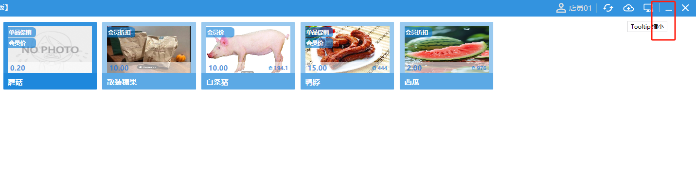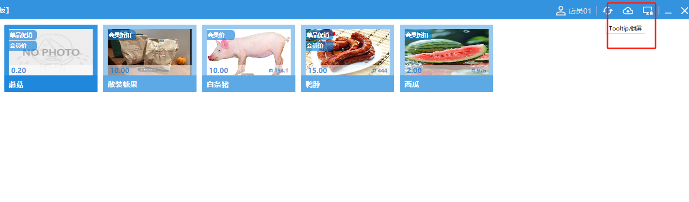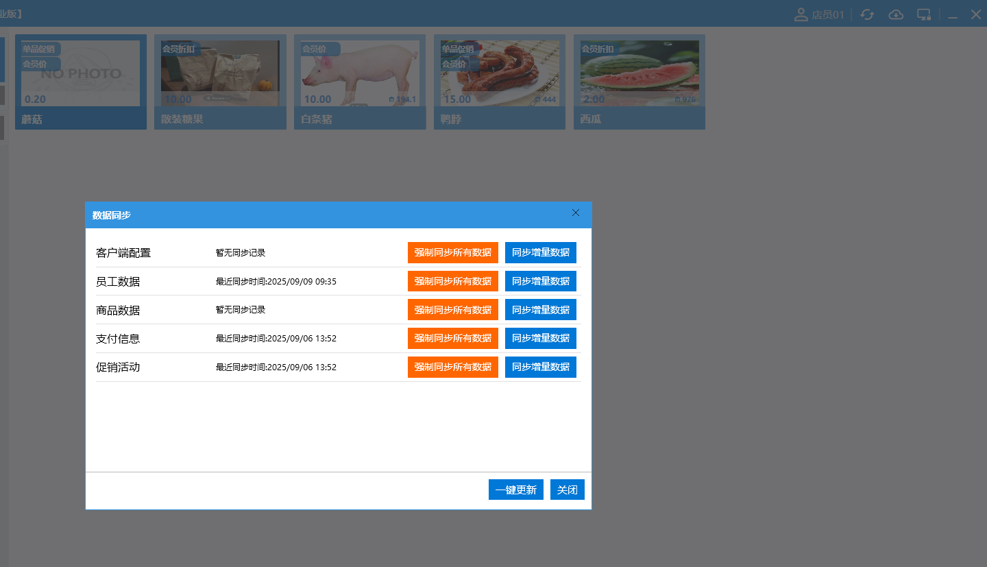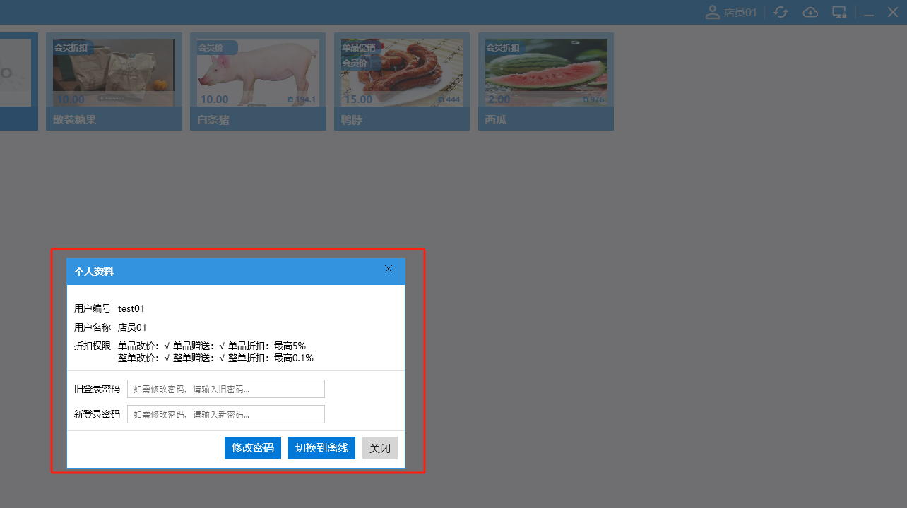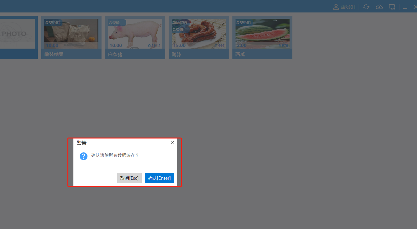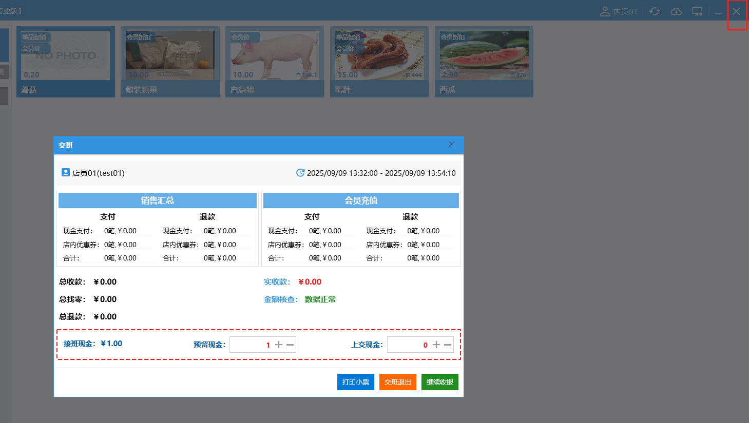 工具栏 概述:工具栏包括 收银员管理、清理缓存、数据同步、锁屏、缩小、交班。 如图所示  1、收银员管理 店员管理显示当班收银员(例如店员01),点击显示收银员资料详情:用户编号、用户名称、折扣权限,可以修改收银员登录密码,切换到离线模式。 如图所示  2、清理缓存 清理缓存是指清除收银系统在运行过程中产生的临时数据文件,加快系统加载速度。点击”确认“即可清理缓存,点击”取消“即不清理。 如图所示  3、数据同步 数据同步是确保收银系统中所有终端(POS机)、后台以及云端服务器之间的数据保持一致、准确和实时。可分别同步:客户端配置、员工数据、商品数据、支付信息、促销活动;也可以点击一键同步,同时对所有数据进行同步操作。 如图所示  4、锁屏 锁屏是收银员在暂时离开收银台时,快速锁定系统界面,防止他人误操作或未经授权使用,保障资金和数据安全。 如图所示  5、缩小 缩小是临时隐藏收银界面,以便快速切换到其他必要程序(如查看邮件、打开监控软件)或查看被遮挡的桌面内容,而无需关闭收银系统。 如图所示  6、交班 ”交班“是完成员工工作切换时的财务清算和责任交接。确保当班次的营业额、账目准确无误,并明确划分不同收银员的工作责任。点击右上角”X“即进入交班 页面。 ”交班“可以显示收银员名称,当班时间段、销售总汇,会员充值、总收款、总找零、总退款、实收款、金额核查(正常即显示”数据正常“,异常即显示”数据异常“)、接班现金(例如:1)、预留现金(例如:1)、上缴现金 (例如:0);点击”打印小票“即打印当班时所有小票,确认无误即点击”交班退出“完成交班,有疑问点击”继续收银“即不交班。 如图所示