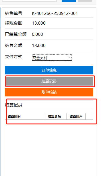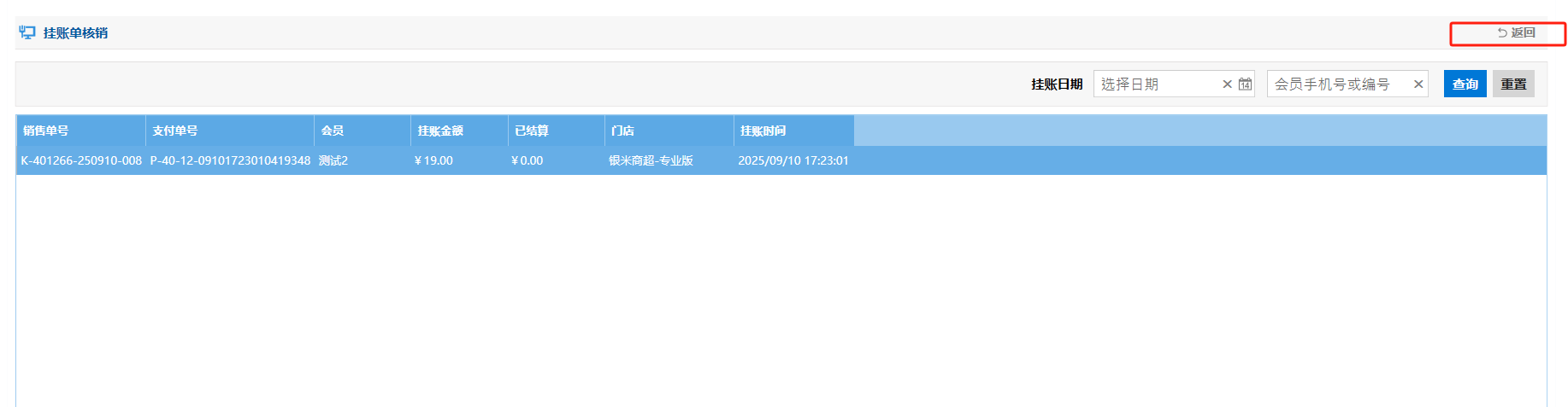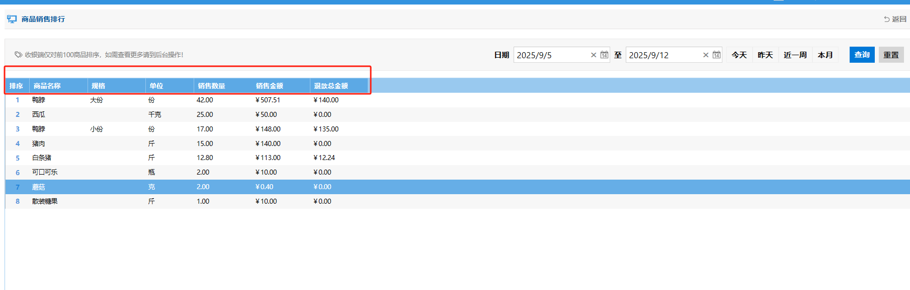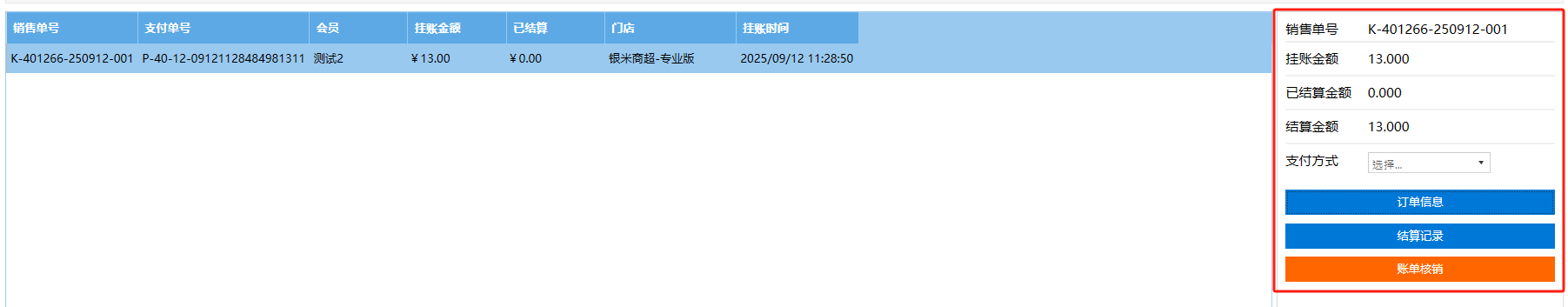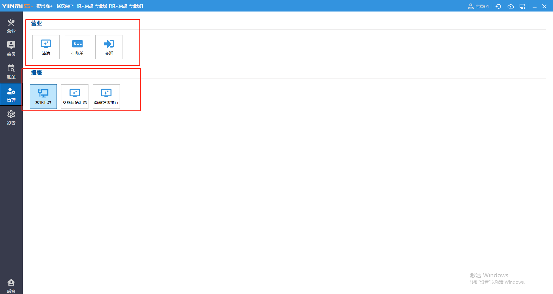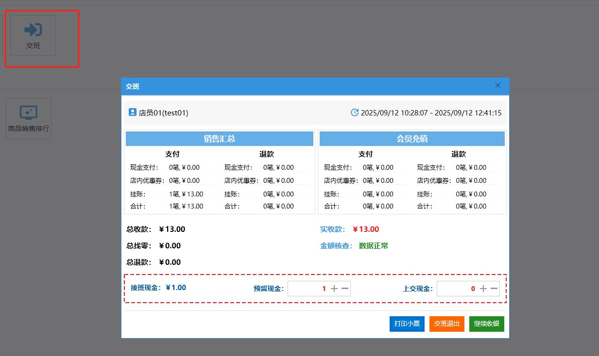 **管理** “管理”是营业交接、报表分析与商品状态管理。营业包含:沽清、挂帐单、交班;报表包含:营业汇总、商品日销汇总、商品销售排行。 如图所示  一、沽清 “沽清”是手动将某商品在系统中的库存数量直接设置为零,标记为“已售罄”状态。点击“沽清”进入页面,操作完成点击“返回”,回到管理页面。**注意:沽清为临时下架,第二天会自动恢复上架**。 如图所示  1、商品查询是通过输入商品条码、名称、拼音码,快速检索商品。如图所示  2、商品上下架 商品需要沽清,点击该商品,点击“临时下架“即可完成,商品营业页面该商品显示”部分售罄“;如需要恢复商品上架,点击”取消下架“即可,商品恢复正常售卖。 如图所示   二、挂帐单 挂账单是允许被授权的会员在额度范围内消费时不当场支付,而是由系统记录欠款金额,之后在规定账期内统一结算。点击”挂账单"进入页面,完成后点击“返回”即可回到管理页面。 如图所示  1、挂账单查询 挂账单查询是通过输入挂账日期、会员手机号或者卡号,快速检索挂帐单。 如图所示  2、挂账单详情 挂帐单详情可以查看销售单号、支付单号、会员、挂账金额、已结算、门店、挂账时间。 如图所示  3、挂帐单核销 A、挂帐单核销是把会员的挂帐单,进行支付然后核销。双击“销售单号”,右侧会出现挂账单的详情包含:销售单号、挂账金额、已结算金额、结算金额、支付方式、订单信息、结算记录、账单核销。 如图所示  B、点击“订单信息”,会弹出订单详情信息。如图所示  C、点击“结算记录”,会显示结算时间、结算金额、结算用户。如图所示  D、选择支付方式,点击“账单核销”即可完成挂账单的核销。如图所示 三、交班 “交班”是收银系统中结束当前操作员的工作时段,并完成财务清点和工作交接的流程。点击“交班”即可弹出交班详情页面,包含:店员、当班时间段、销售汇总、会员充值、总收款、总找零、总退款、实收款、金额核查。 如图所示  接班金额是上次接班预留的现金,预留现金是下次接班的现金,上交现金是当班过程上缴的现金;点击“打印小票”即可打印当班时所有订单小票;如确认无误点击“交班退出”即可结束当班,有疑问点击“继续收银”即可继续当班。 如图所示  四、营业汇总 “营业汇总”是收银系统对一天所有经营数据进行全面统计和总结的报表。点击“营业汇总”即可进入页面,点击“返回”即可回到管理页面。 如图所示  1、营业汇总查询是输入时间段或选择今天,昨天,近一周、本月。点击查询即可。如图所示  2、营业汇总详情包含:日期、销售额、销售笔数、退款总额、退款笔数、折扣总额、积分抵扣、优惠劵抵扣、会员销售额、会员退款、会员销售笔数、会员退款笔数、新增会员数。 如图所示  五、商品日销汇总 “商品日销汇总”是一项专门针对商品销售情况进行每日统计的数据报表。点击“商品日销汇总”即可进入页面,点击“返回”即可回到管理页面。  1、商品日销汇总查询是输入时间段或选择今天,昨天,近一周、本月。点击查询即可。如图所示  2、商品日销汇总详情包含:日期、商品名称、商品分类 、规格、单位、销售数量、销售额、均价、退货总数、退款总额、赠送数量、数量小计、金额小计。 如图所示  六、商品销售排行 “商品销售排行”是对商品销售表现进行自动排序的报表。点击“商品销售排行 ”即可进入页面,点击“返回”即可回到管理页面。 如图所示  1、商品销售排行查询是输入时间段或选择今天,昨天,近一周、本月。点击查询即可。如图所示  2、商品销售排行详情包含:排序、商品名称、规格、单位、销售数量、销售金额、退款总金额。 如图所示