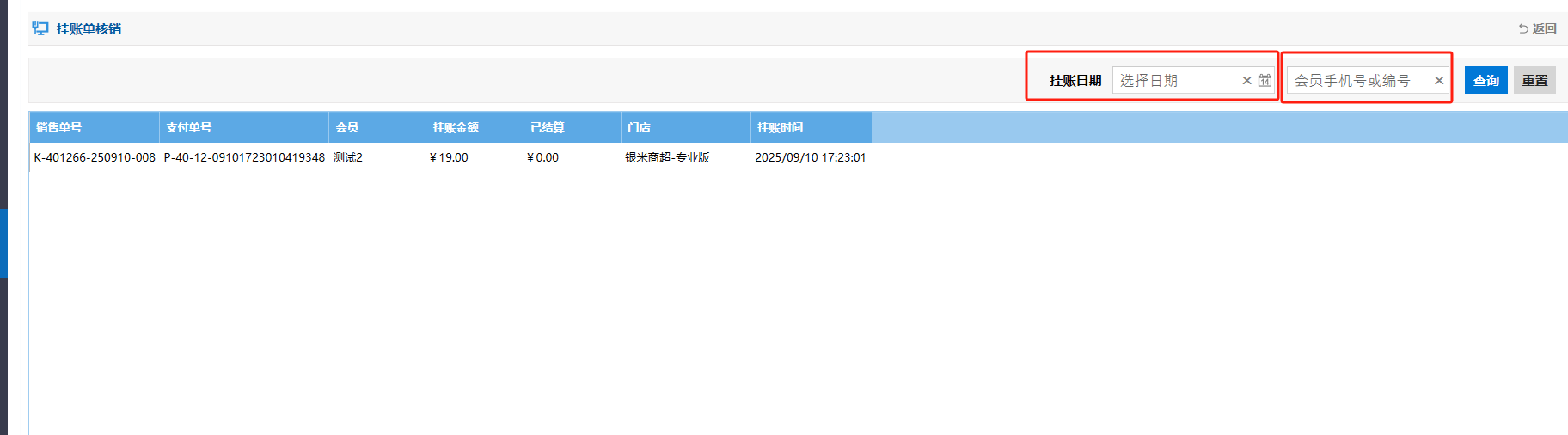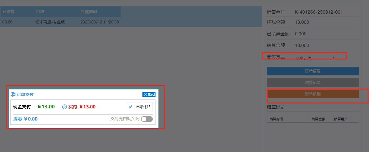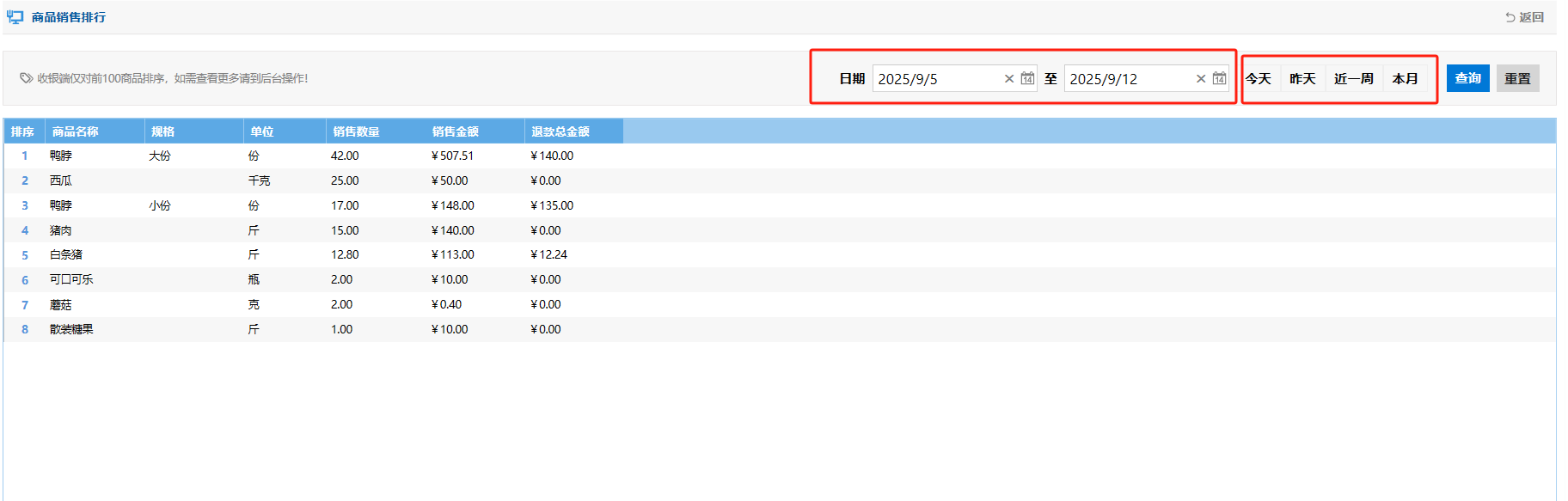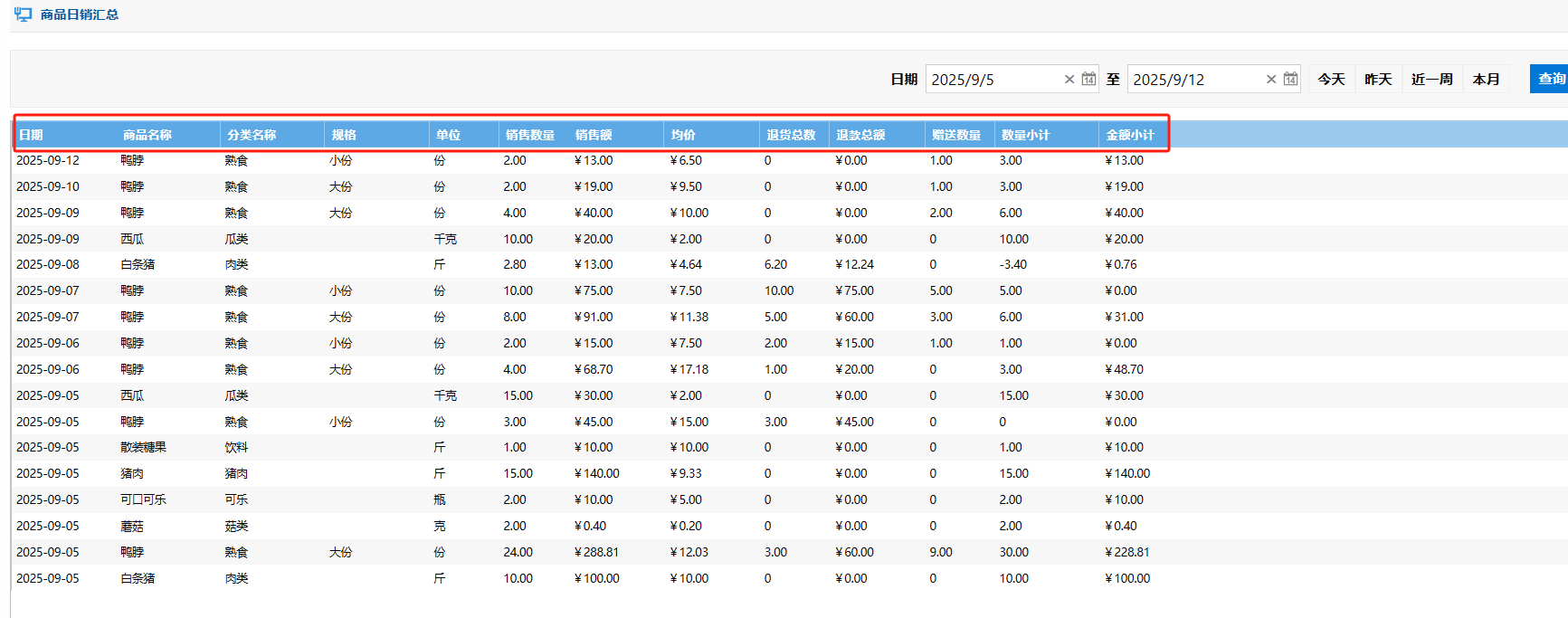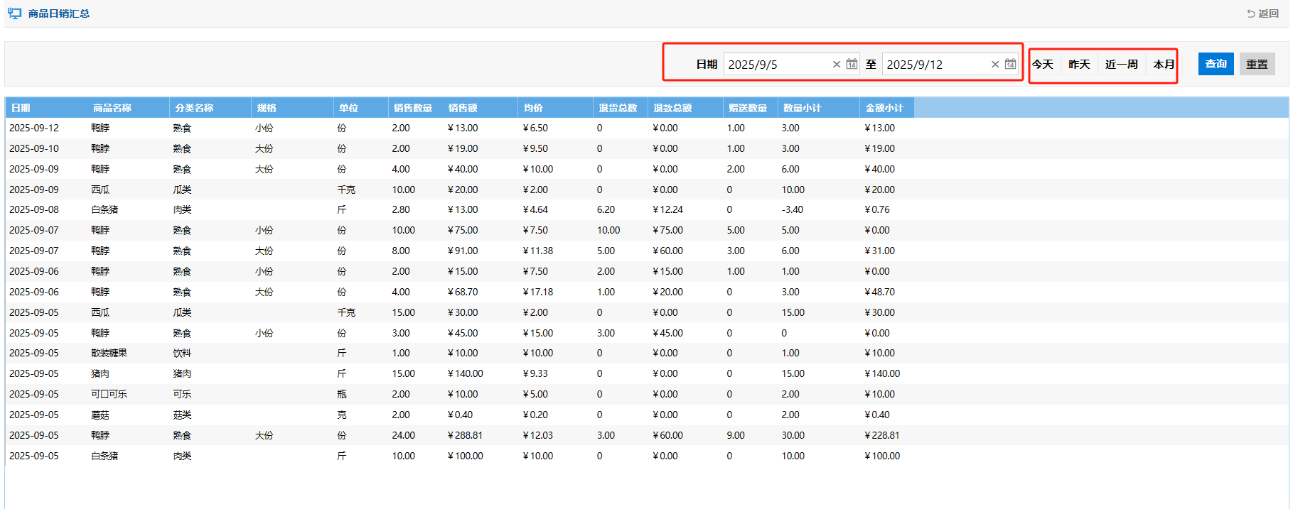**管理** “管理”是营业交接、报表分析与商品状态管理。营业包含:沽清、挂帐单、交班;报表包含:营业汇总、商品日销汇总、商品销售排行。 如图所示  一、沽清 “沽清”是手动将某商品在系统中的库存数量直接设置为零,标记为“已售罄”状态。点击“沽清”进入页面,操作完成点击“返回”,回到管理页面。**注意:沽清为临时下架,第二天会自动恢复上架**。 如图所示  1、商品查询是通过输入商品条码、名称、拼音码,快速检索商品。如图所示  2、商品上下架 商品需要沽清,点击该商品,点击“临时下架“即可完成,商品营业页面该商品显示”部分售罄“;如需要恢复商品上架,点击”取消下架“即可,商品恢复正常售卖。 如图所示   二、挂帐单 挂账单是允许被授权的会员在额度范围内消费时不当场支付,而是由系统记录欠款金额,之后在规定账期内统一结算。点击”挂账单"进入页面,完成后点击“返回”即可回到管理页面。 如图所示  1、挂账单查询 挂账单查询是通过输入挂账日期、会员手机号或者卡号,快速检索挂帐单。 如图所示  2、挂账单详情 挂帐单详情可以查看销售单号、支付单号、会员、挂账金额、已结算、门店、挂账时间。 如图所示  3、挂帐单核销 A、挂帐单核销是把会员的挂帐单,进行支付然后核销。双击“销售单号”,右侧会出现挂账单的详情包含:销售单号、挂账金额、已结算金额、结算金额、支付方式、订单信息、结算记录、账单核销。 如图所示  B、点击“订单信息”,会弹出订单详情信息。如图所示  C、点击“结算记录”,会显示结算时间、结算金额、结算用户。如图所示  D、选择支付方式,点击“账单核销”即可完成挂账单的核销。如图所示 三、交班 “交班”是收银系统中结束当前操作员的工作时段,并完成财务清点和工作交接的流程。点击“交班”即可弹出交班详情页面,包含:店员、当班时间段、销售汇总、会员充值、总收款、总找零、总退款、实收款、金额核查。 如图所示  接班金额是上次接班预留的现金,预留现金是下次接班的现金,上交现金是当班过程上缴的现金;点击“打印小票”即可打印当班时所有订单小票;如确认无误点击“交班退出”即可结束当班,有疑问点击“继续收银”即可继续当班。 如图所示  四、营业汇总 “营业汇总”是收银系统对一天所有经营数据进行全面统计和总结的报表。点击“营业汇总”即可进入页面,点击“返回”即可回到管理页面。 如图所示  1、营业汇总查询是输入时间段或选择今天,昨天,近一周、本月。点击查询即可。如图所示  2、营业汇总详情包含:日期、销售额、销售笔数、退款总额、退款笔数、折扣总额、积分抵扣、优惠劵抵扣、会员销售额、会员退款、会员销售笔数、会员退款笔数、新增会员数。 如图所示  五、商品日销汇总 “商品日销汇总”是一项专门针对商品销售情况进行每日统计的数据报表。点击“商品日销汇总”即可进入页面,点击“返回”即可回到管理页面。  1、商品日销汇总查询是输入时间段或选择今天,昨天,近一周、本月。点击查询即可。如图所示  2、商品日销汇总详情包含:日期、商品名称、商品分类 、规格、单位、销售数量、销售额、均价、退货总数、退款总额、赠送数量、数量小计、金额小计。 如图所示  六、商品销售排行 “商品销售排行”是对商品销售表现进行自动排序的报表。点击“商品销售排行 ”即可进入页面,点击“返回”即可回到管理页面。 如图所示  1、商品销售排行查询是输入时间段或选择今天,昨天,近一周、本月。点击查询即可。如图所示  2、商品销售排行详情包含:排序、商品名称、规格、单位、销售数量、销售金额、退款总金额。 如图所示