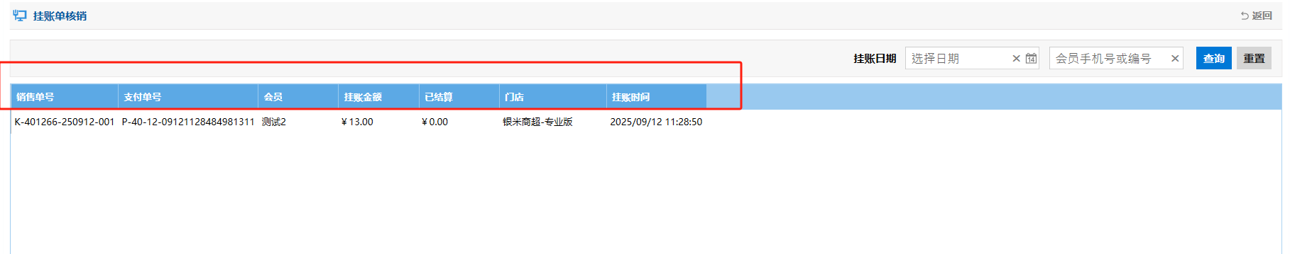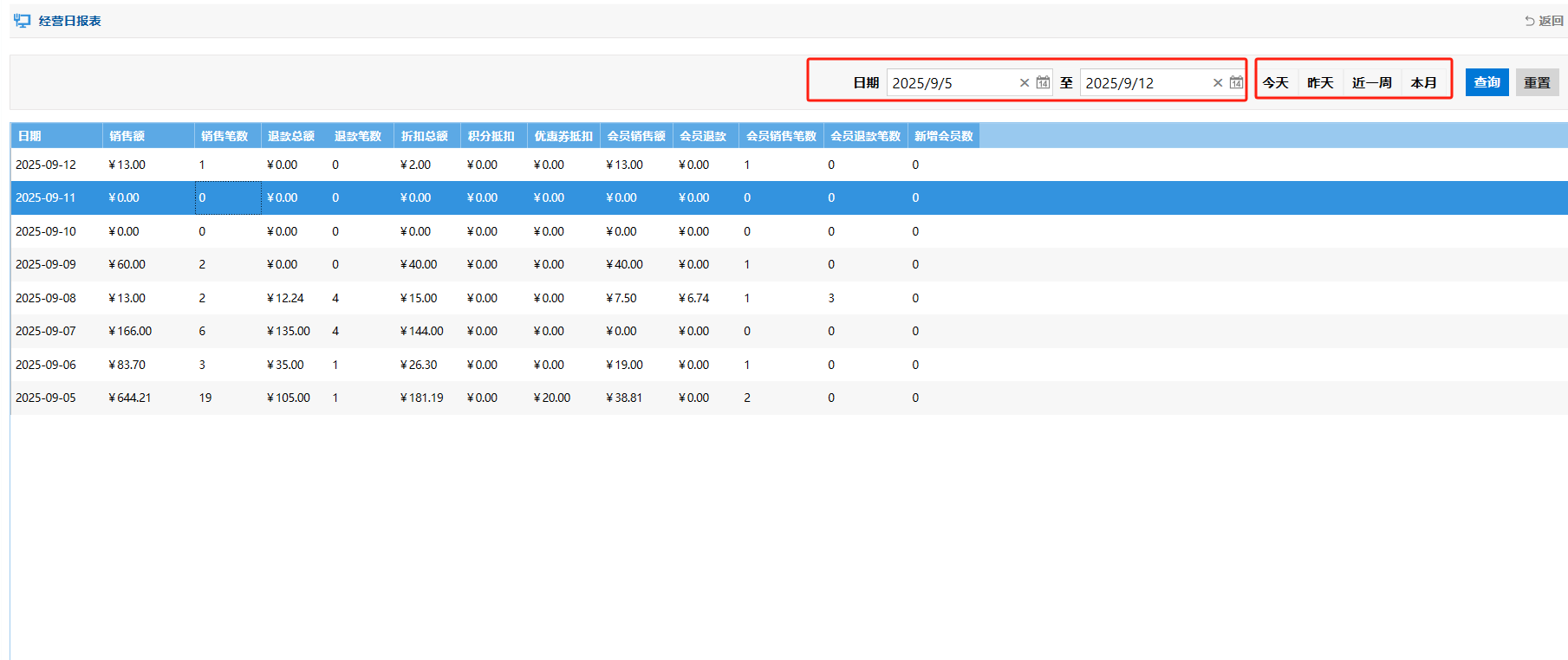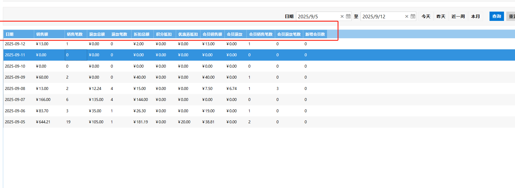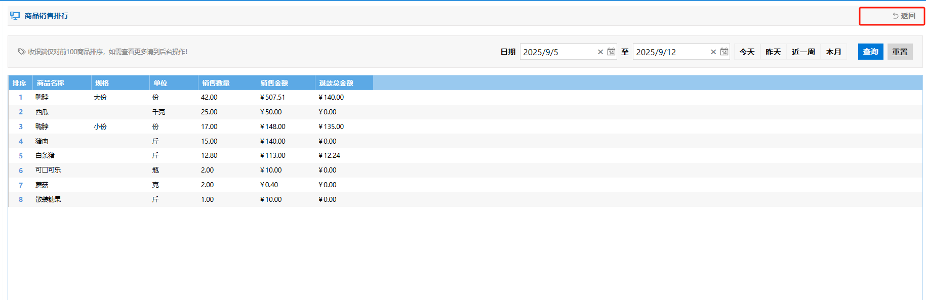**管理** “管理”是营业交接、报表分析与商品状态管理。营业包含:沽清、挂帐单、交班;报表包含:营业汇总、商品日销汇总、商品销售排行。 如图所示  一、沽清 “沽清”是手动将某商品在系统中的库存数量直接设置为零,标记为“已售罄”状态。点击“沽清”进入页面,操作完成点击“返回”,回到管理页面。**注意:沽清为临时下架,第二天会自动恢复上架**。 如图所示  1、商品查询是通过输入商品条码、名称、拼音码,快速检索商品。如图所示  2、商品上下架 商品需要沽清,点击该商品,点击“临时下架“即可完成,商品营业页面该商品显示”部分售罄“;如需要恢复商品上架,点击”取消下架“即可,商品恢复正常售卖。 如图所示   二、挂帐单 挂账单是允许被授权的会员在额度范围内消费时不当场支付,而是由系统记录欠款金额,之后在规定账期内统一结算。点击”挂账单"进入页面,完成后点击“返回”即可回到管理页面。 如图所示  1、挂账单查询 挂账单查询是通过输入挂账日期、会员手机号或者卡号,快速检索挂帐单。 如图所示  2、挂账单详情 挂帐单详情可以查看销售单号、支付单号、会员、挂账金额、已结算、门店、挂账时间。 如图所示  3、挂帐单核销 A、挂帐单核销是把会员的挂帐单,进行支付然后核销。双击“销售单号”,右侧会出现挂账单的详情包含:销售单号、挂账金额、已结算金额、结算金额、支付方式、订单信息、结算记录、账单核销。 如图所示  B、点击“订单信息”,会弹出订单详情信息。如图所示  C、点击“结算记录”,会显示结算时间、结算金额、结算用户。如图所示  D、选择支付方式,点击“账单核销”即可完成挂账单的核销。如图所示 三、交班 “交班”是收银系统中结束当前操作员的工作时段,并完成财务清点和工作交接的流程。点击“交班”即可弹出交班详情页面,包含:店员、当班时间段、销售汇总、会员充值、总收款、总找零、总退款、实收款、金额核查。 如图所示  接班金额是上次接班预留的现金,预留现金是下次接班的现金,上交现金是当班过程上缴的现金;点击“打印小票”即可打印当班时所有订单小票;如确认无误点击“交班退出”即可结束当班,有疑问点击“继续收银”即可继续当班。 如图所示  四、营业汇总 “营业汇总”是收银系统对一天所有经营数据进行全面统计和总结的报表。点击“营业汇总”即可进入页面,点击“返回”即可回到管理页面。 如图所示  1、营业汇总查询是输入时间段或选择今天,昨天,近一周、本月。点击查询即可。如图所示  2、营业汇总详情包含:日期、销售额、销售笔数、退款总额、退款笔数、折扣总额、积分抵扣、优惠劵抵扣、会员销售额、会员退款、会员销售笔数、会员退款笔数、新增会员数。 如图所示  五、商品日销汇总 “商品日销汇总”是一项专门针对商品销售情况进行每日统计的数据报表。点击“商品日销汇总”即可进入页面,点击“返回”即可回到管理页面。  1、商品日销汇总查询是输入时间段或选择今天,昨天,近一周、本月。点击查询即可。如图所示  2、商品日销汇总详情包含:日期、商品名称、商品分类 、规格、单位、销售数量、销售额、均价、退货总数、退款总额、赠送数量、数量小计、金额小计。 如图所示  六、商品销售排行 “商品销售排行”是对商品销售表现进行自动排序的报表。点击“商品销售排行 ”即可进入页面,点击“返回”即可回到管理页面。 如图所示  1、商品销售排行查询是输入时间段或选择今天,昨天,近一周、本月。点击查询即可。如图所示  2、商品销售排行详情包含:排序、商品名称、规格、单位、销售数量、销售金额、退款总金额。 如图所示